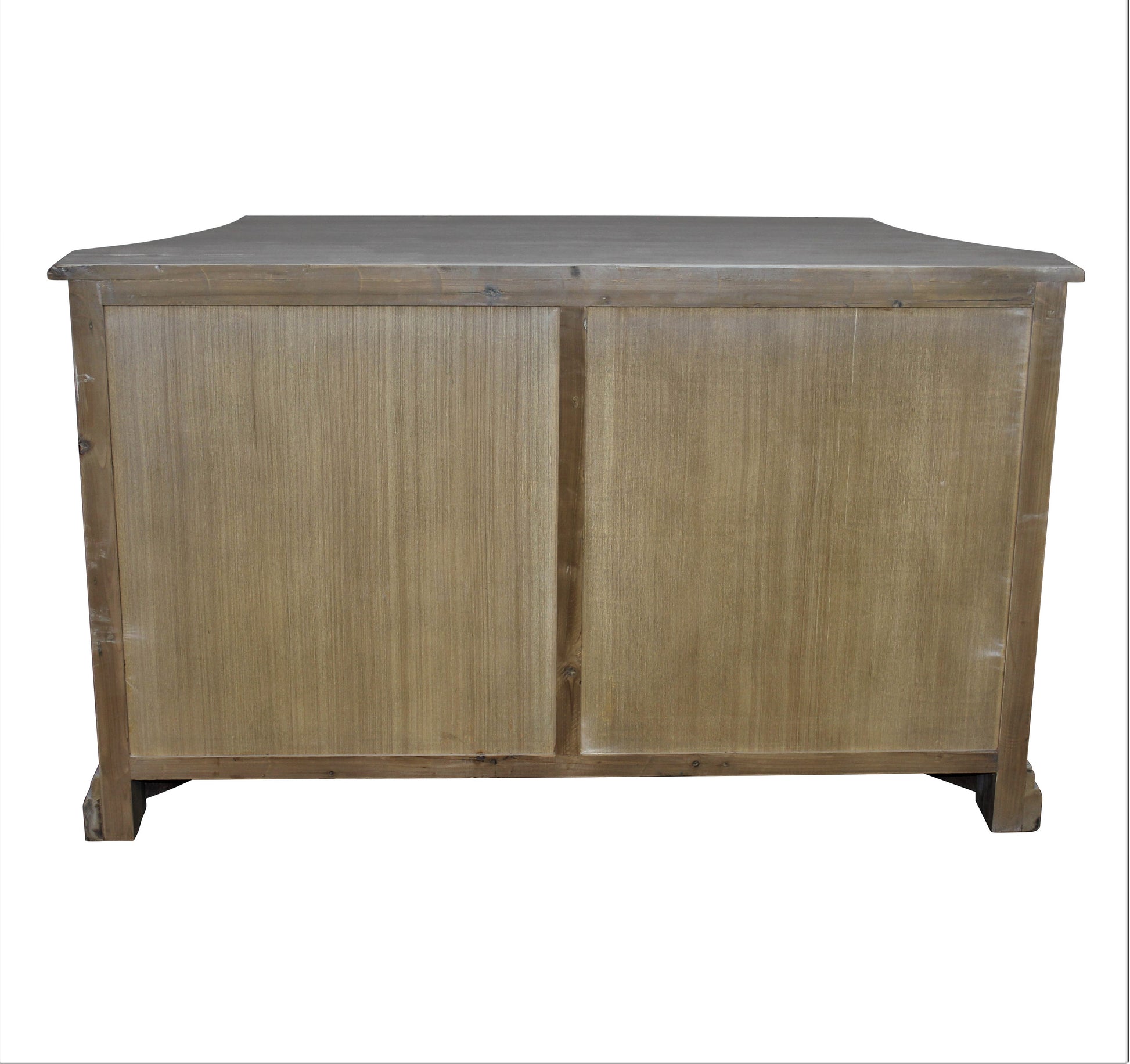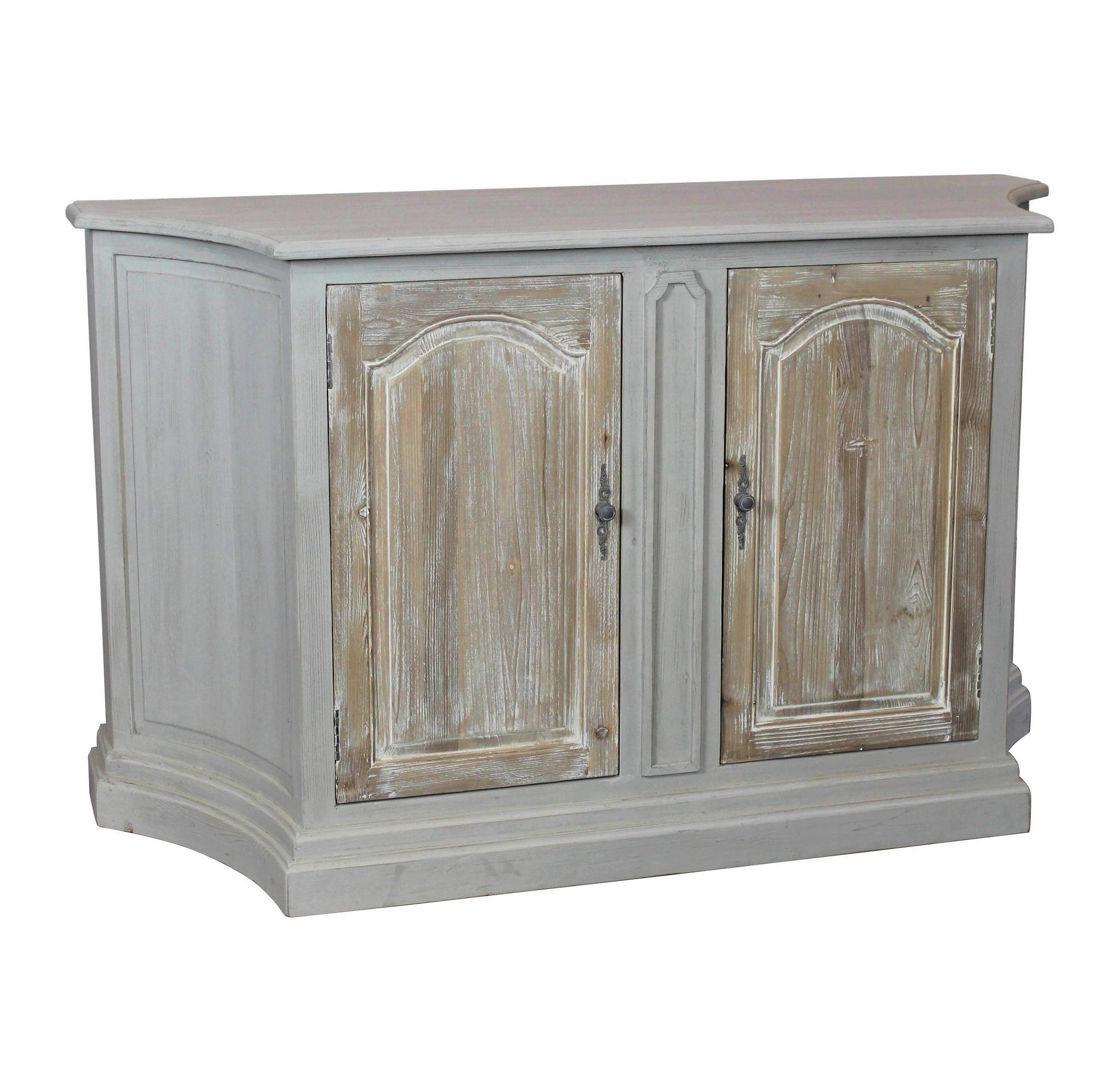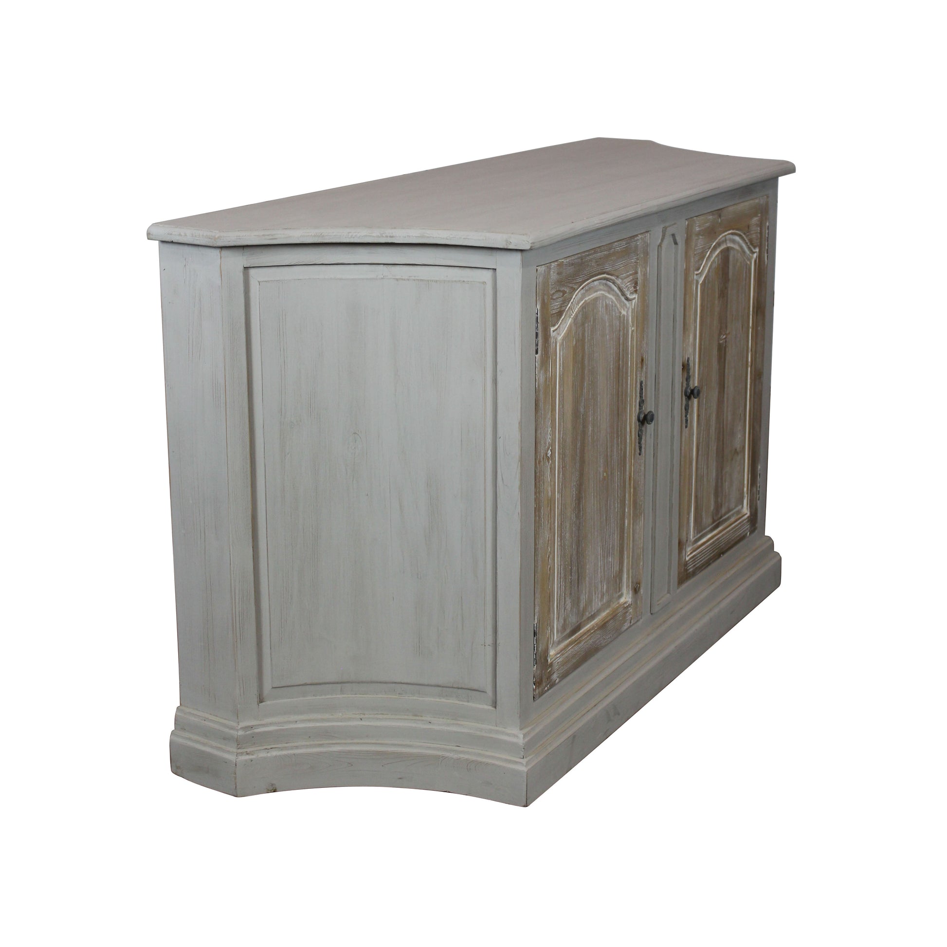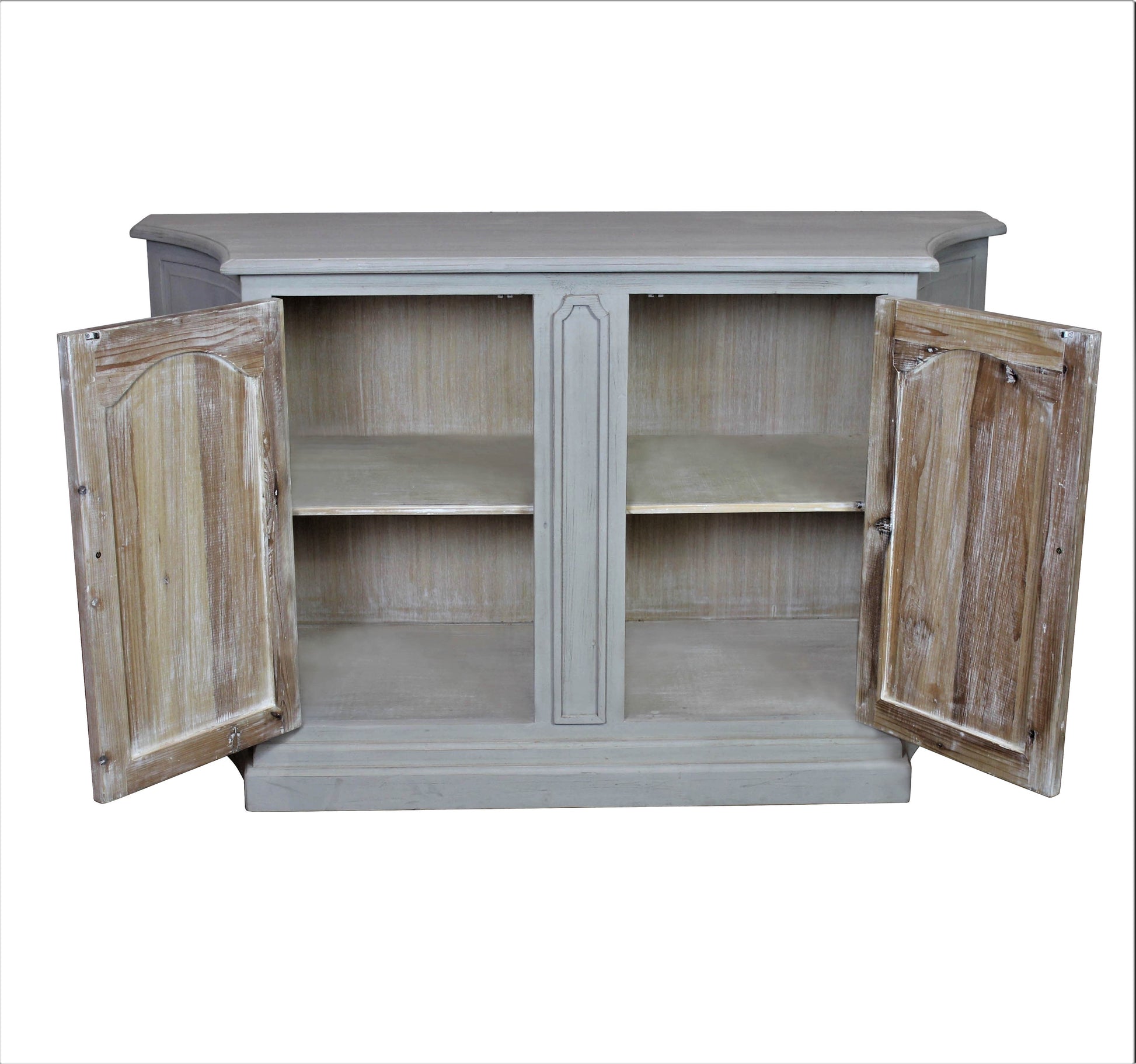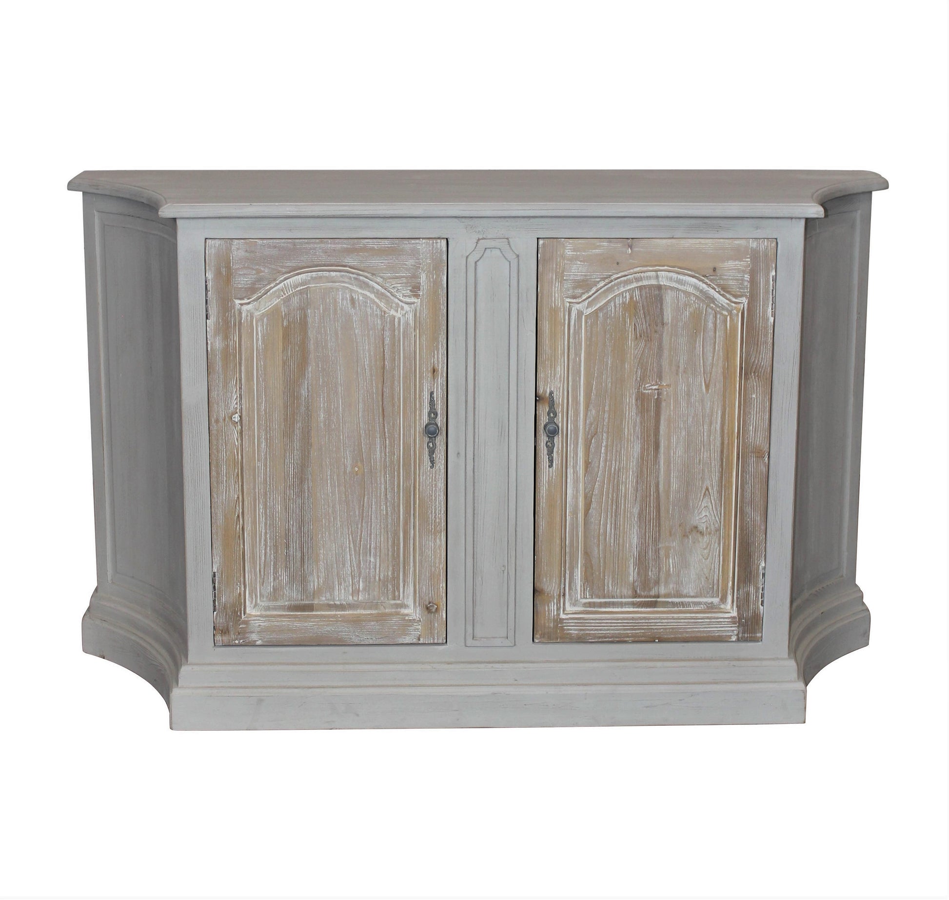 Sideboard with inverted sides bordering the two panelled doors. Made of solid reclaimed pine, the exterior is hand-painted in a light gray finish and doors are bleached pine. Interior has one fixed shelf with 14.5"H between shelves. Reclaimed pine by nature will likely have nail holes, cracks, knots and other imperfections