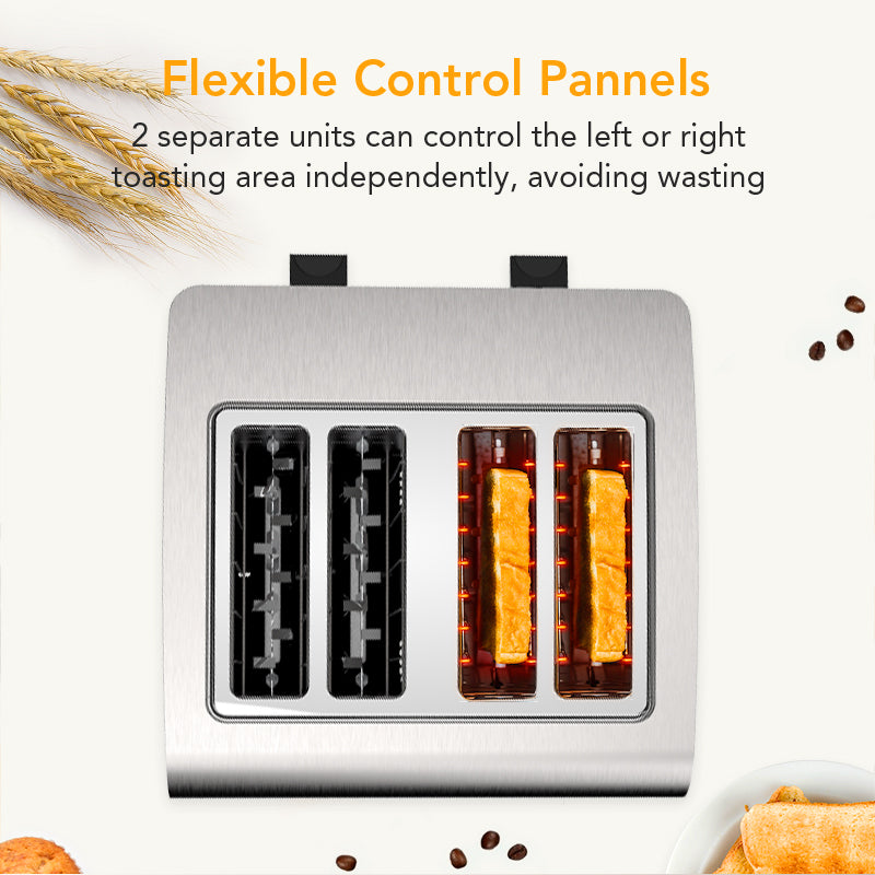 4 slots separately control 4-Slice slots toaster meets your need of preparing whole family breakfast more efficient. Dual control panels can be used separately, HUMANIZED DESIGN to avoid wasting electricity when heating only 1 or 2 pieces of bread.聽 |