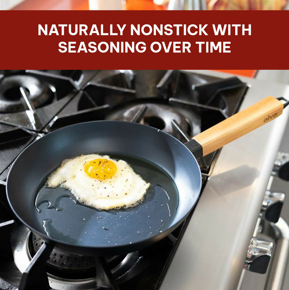 Alva Forest - Nonstick Carbon Steel Frying Pan Skillet - Stay Cool Heat Resistant Acacia Wood Handle, Pre-Seasoned, Cooking Pan, Non Toxic Cookware, Kitchen Supplies, Skillet - 8 inch