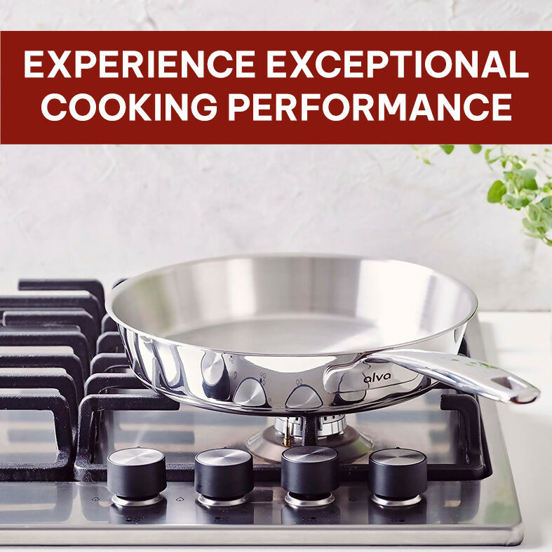 Discover the Alva Maestro 5-Ply Stainless Steel Frying Pan, a versatile addition to your stainless steel cookware set. Crafted from durable SS304 18/10 stainless steel, this frying pan offers exceptional corrosion resistance and a 20% larger cooking surface. Its five-ply aluminum base ensures even heat distribution, making it ideal for searing, caramelizing, and browning. The welded stainless steel handles stay cool, providing a secure grip. With a polished mirror finish, this frying pan combines elegance and functionality. Free from PFAS and Lead & Cadmium, it ensures a safe cooking experience. Perfect for those seeking a reliable and stylish cooking pan, this stainless steel frying pan is a must-have for any kitchen.