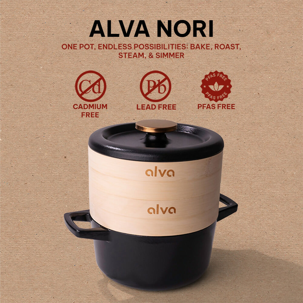 The Alva Nori Enameled Cast Iron Dutch Oven Steamer Pot is a versatile cooking pot that enhances any kitchen with its timeless design. This cast iron dutch oven, complete with a lid and dual handles, is perfect for a range of culinary tasks, from simmering stews to steaming vegetables. As part of a PFAS Free, Lead and Cadmium Free cast iron set, it ensures a non toxic cooking experience. The durable, scratch-resistant enamel coating makes cleanup effortless, while the included bamboo steamer inserts allow for dual-level steaming, ideal for preparing multiple dishes at once. Suitable for all heat sources, including gas, electric, ceramic, and induction, this cast iron pot is a reliable choice for any cooking enthusiast. Whether used as a soup pot, oven pan, or small pot, this piece of cast iron cookware is a must-have in your kitchen arsenal.
