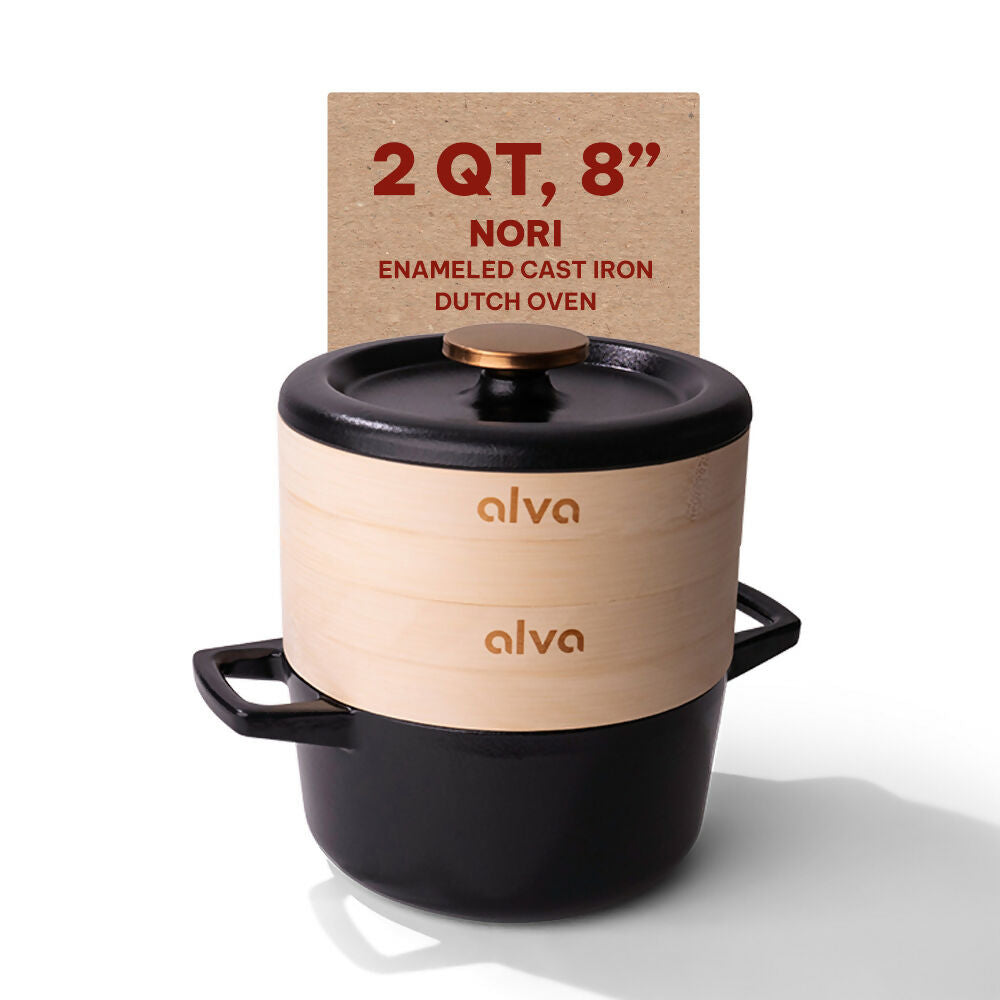 Alva Nori Enameled Cast Iron Dutch Oven Steamer Pot - Versatile Cooking Pot, Cast Iron Cookware, Dutch Oven Pot with Lid, Suitable for All Heat Sources, Non Toxic Cookware - 2.1 Qt, 8" - Black