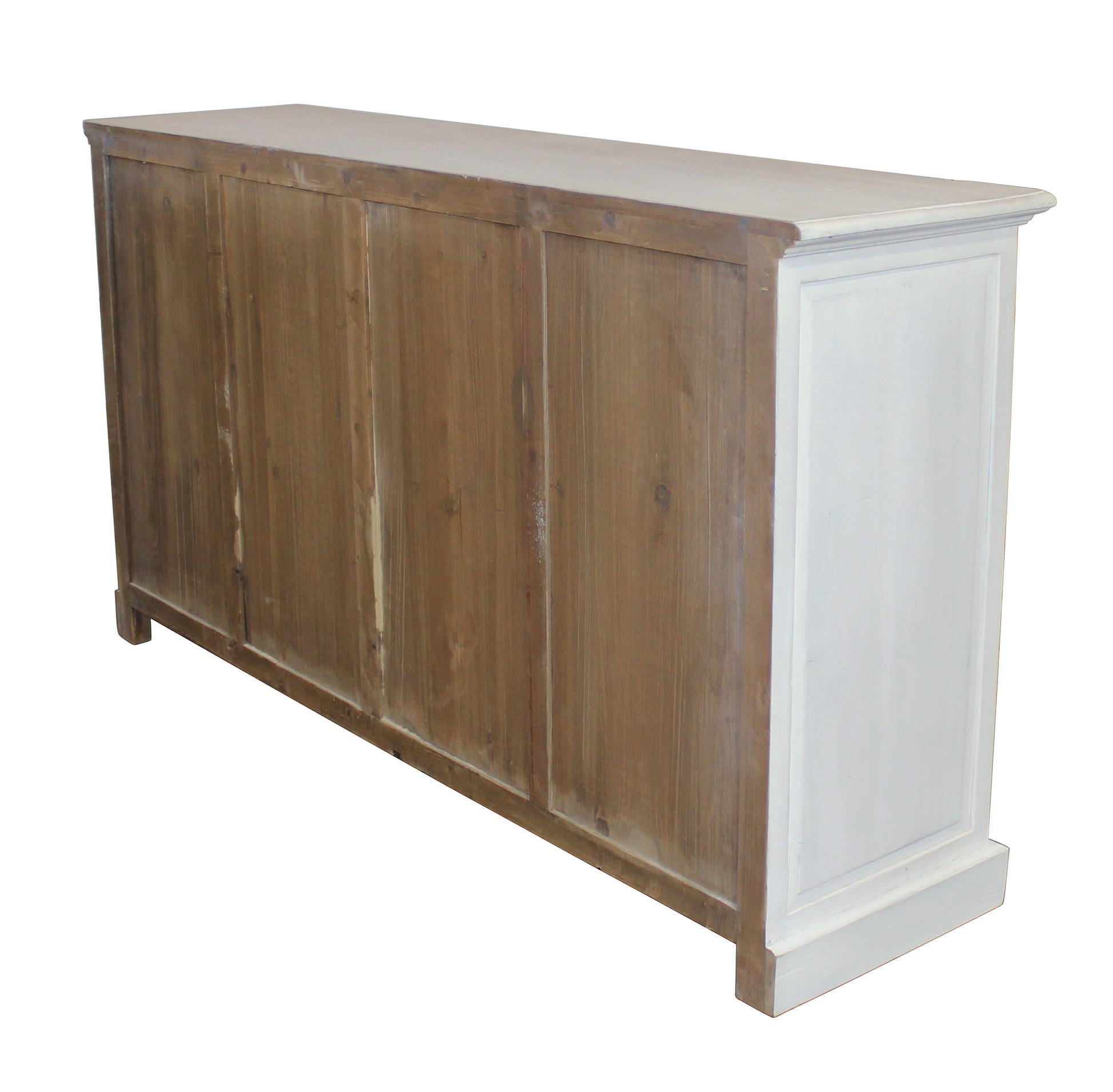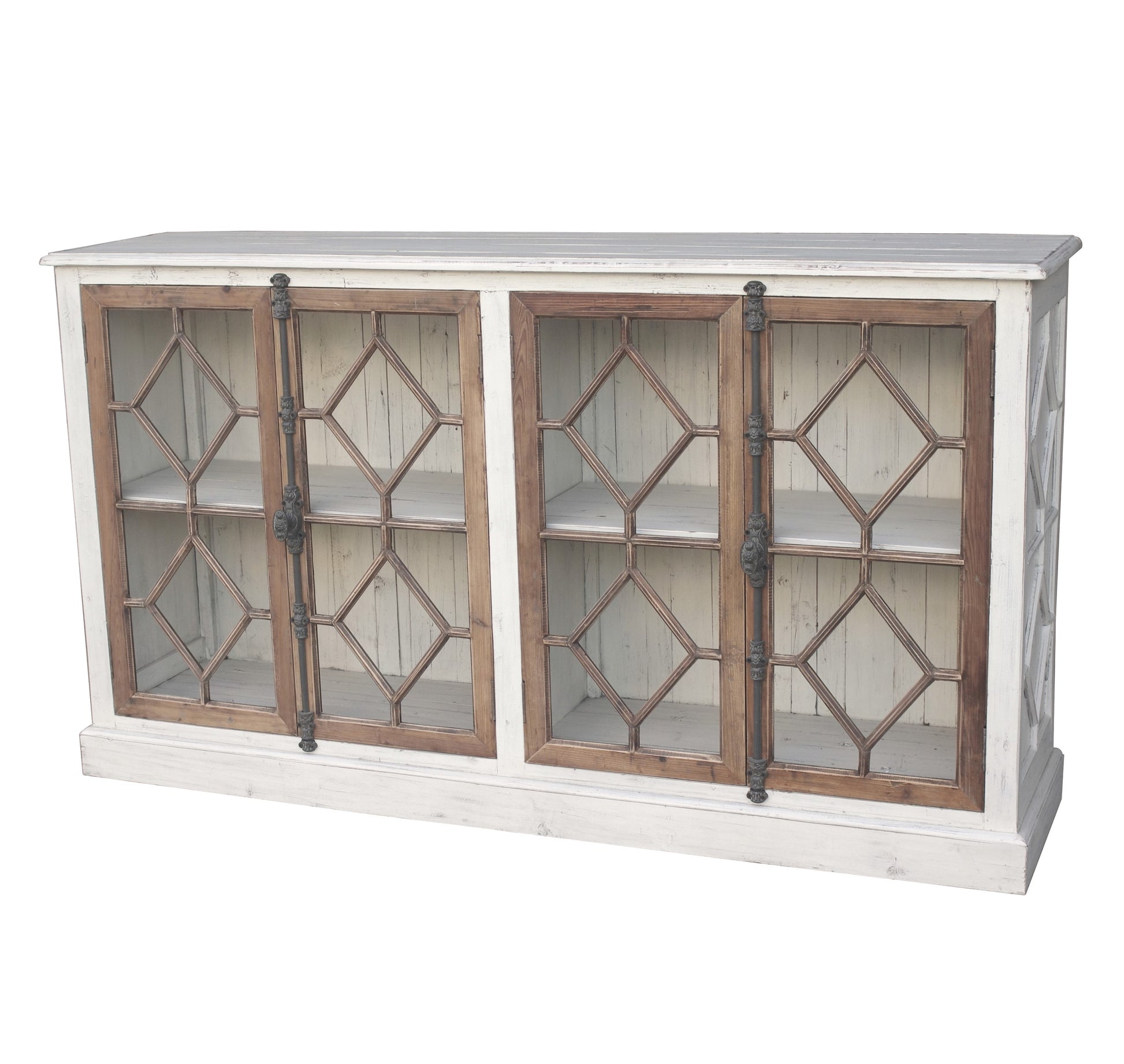 Classically styled sideboard is hand made of reclaimed solid pine with a white distressed paint exterior and interior. Four doors with intricate glass panes finished in natural pine with lightly distressed fully functioning rustic gray hardware. One non-adjustable shelf inside. Will likely have nail holes, knots and other imperfections, adding charm and character.