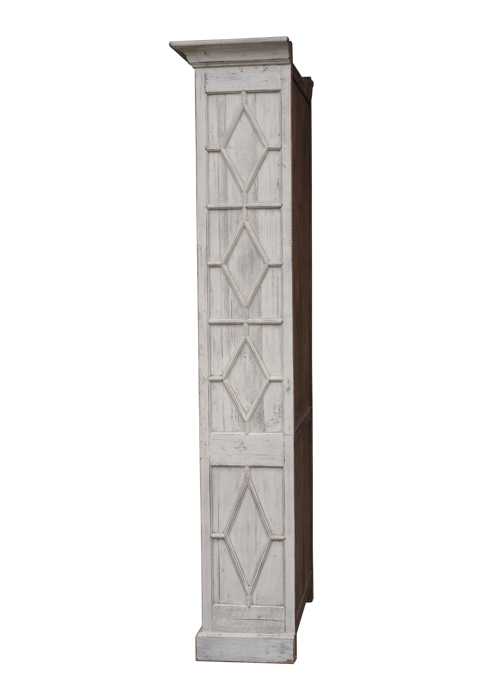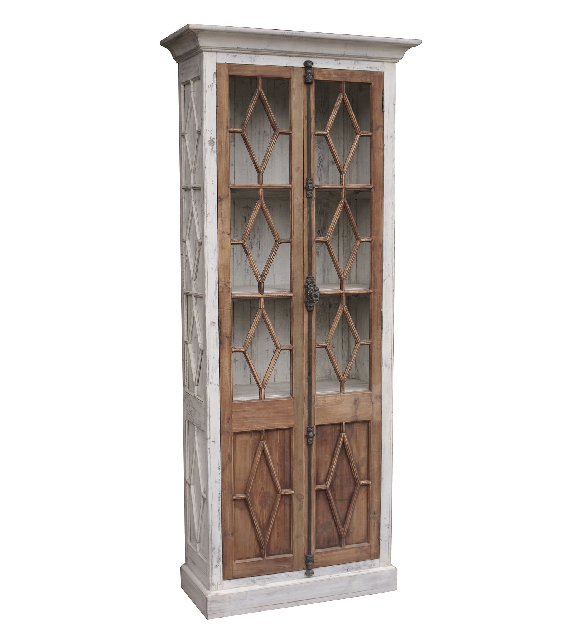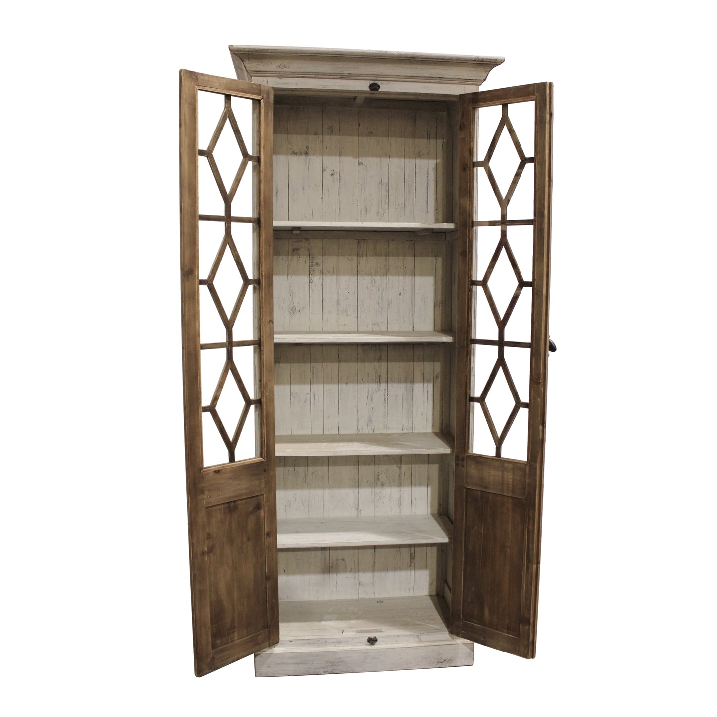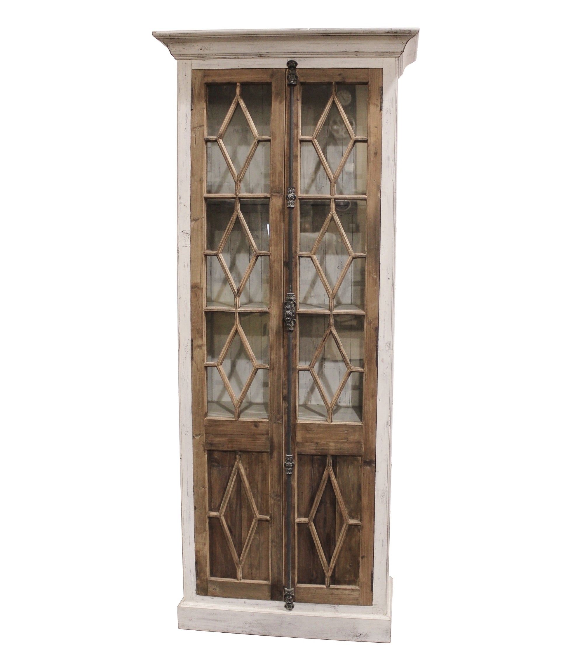 Made of reclaimed solid pine, with a white hand- painted finish accented with natural pine. Two long doors with intricate glass panes above and interesting panels below. Four non-adjustable shelves. French casement style iron hardware. Will likely have nail holes, knots and other imperfections, adding charm and character.