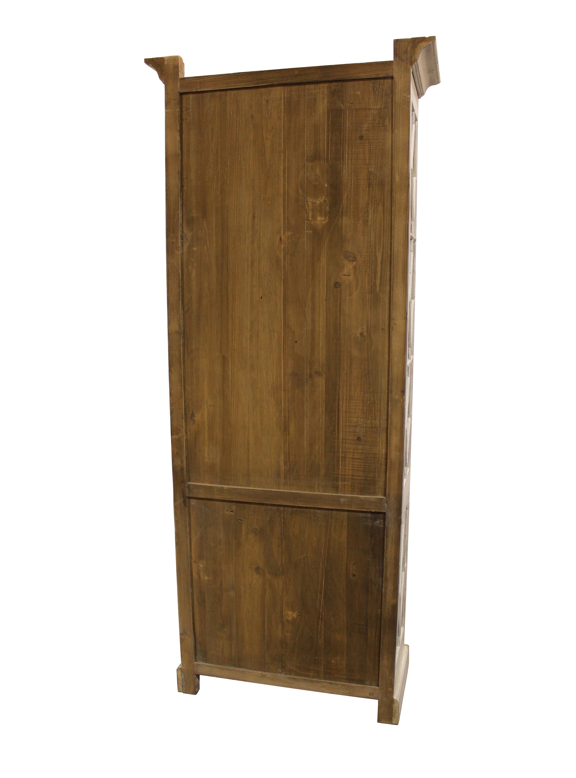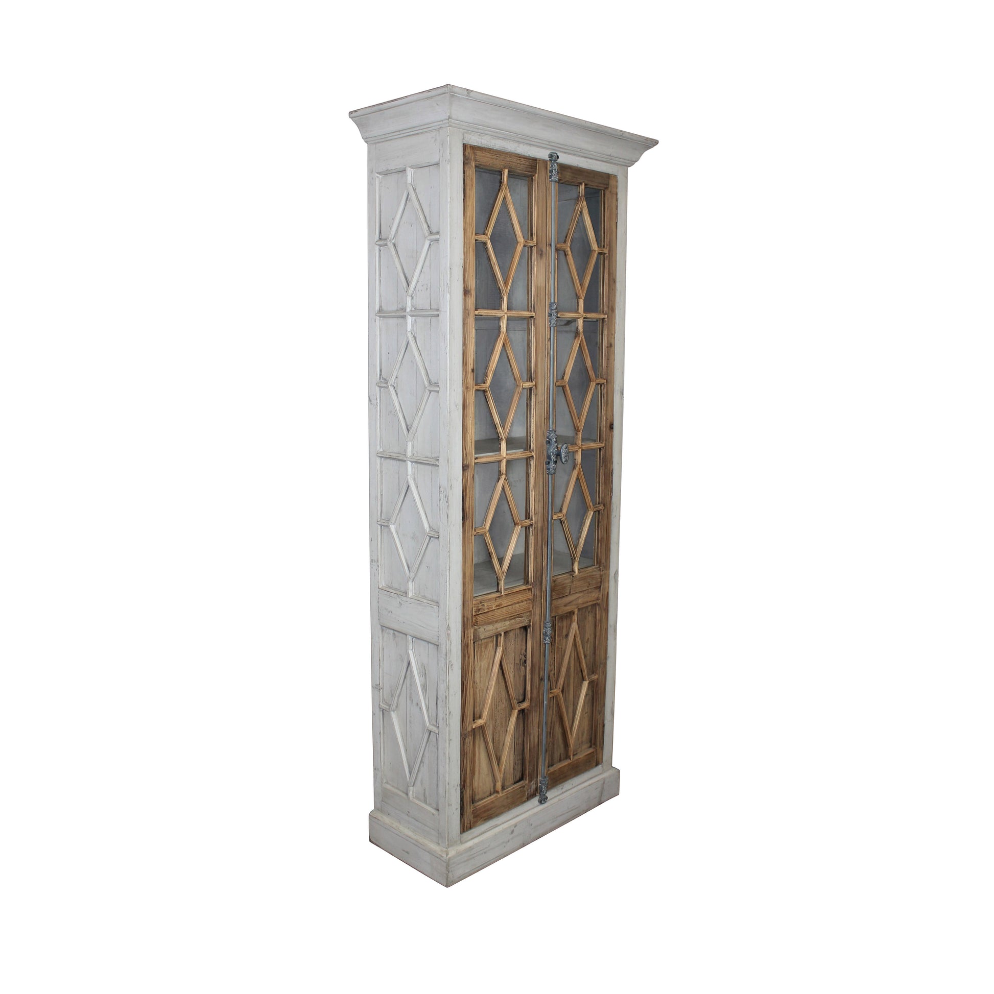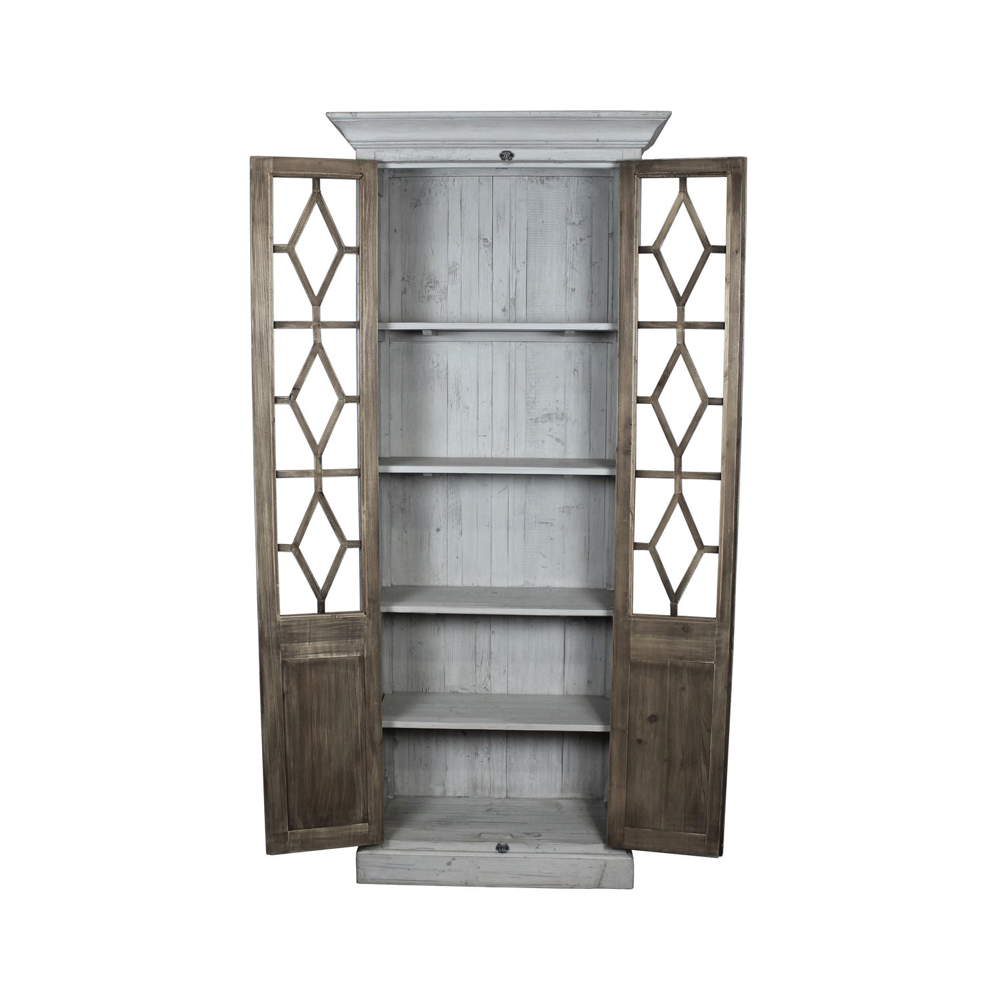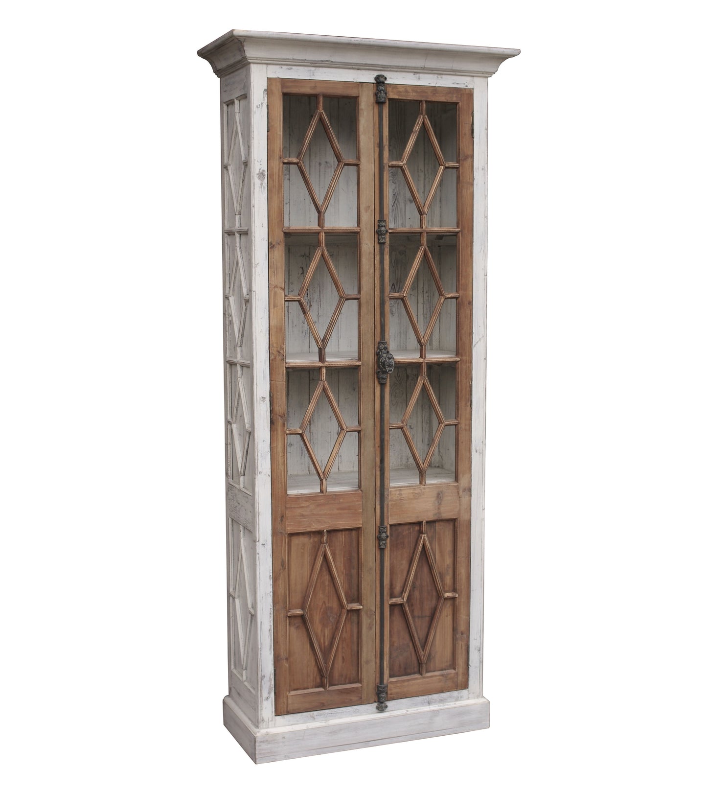 Made of reclaimed solid pine, with a white hand- painted finish accented with natural pine. Two long doors with intricate glass panes above and interesting panels below. Four non-adjustable shelves. French casement style iron hardware. Will likely have nail holes, knots and other imperfections, adding charm and character.