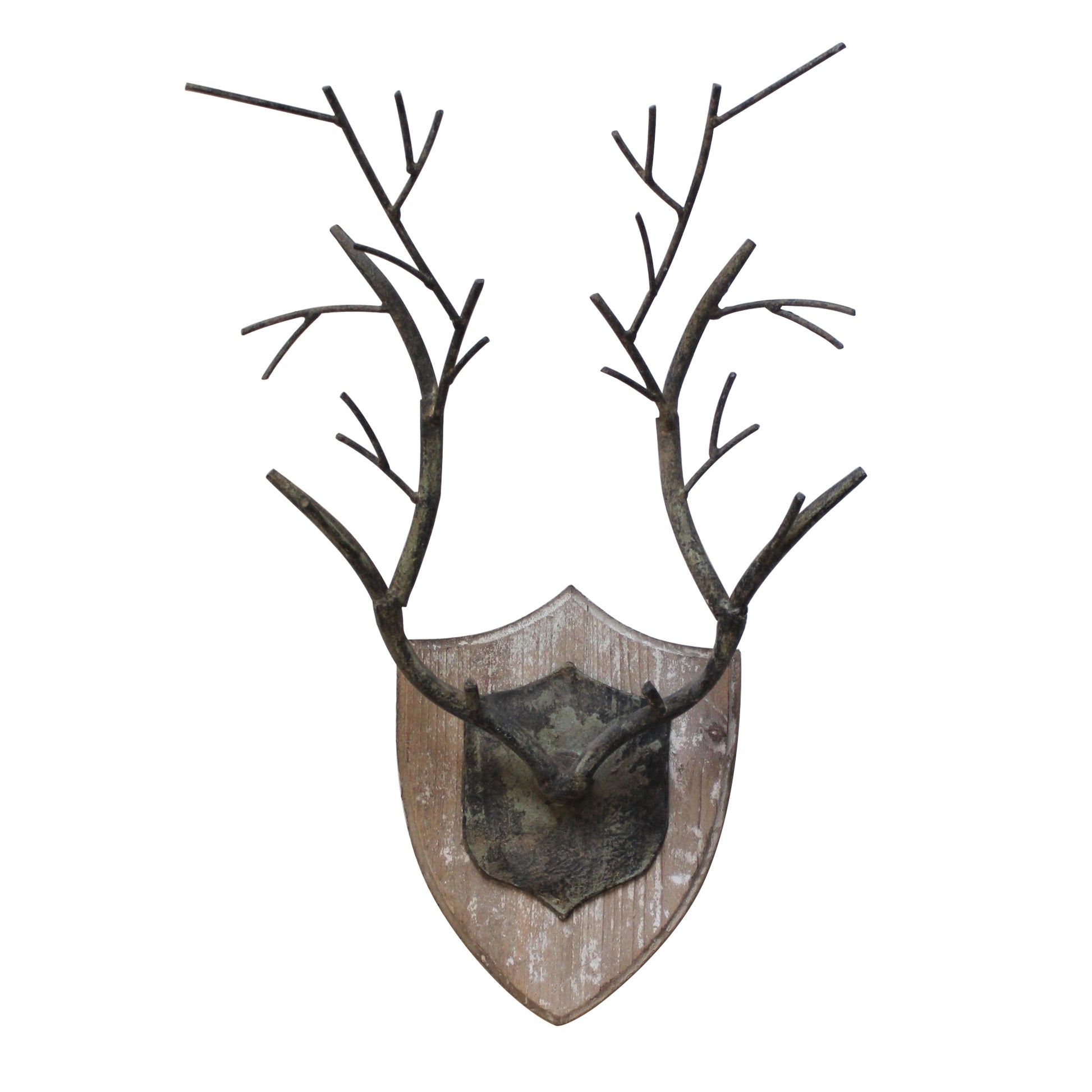 Vintage inspired antler plaque hand-crafted of fir wood and metal. Distressed white wood plaque with aged metal antlers. Ready to hang with two hangers on the back.