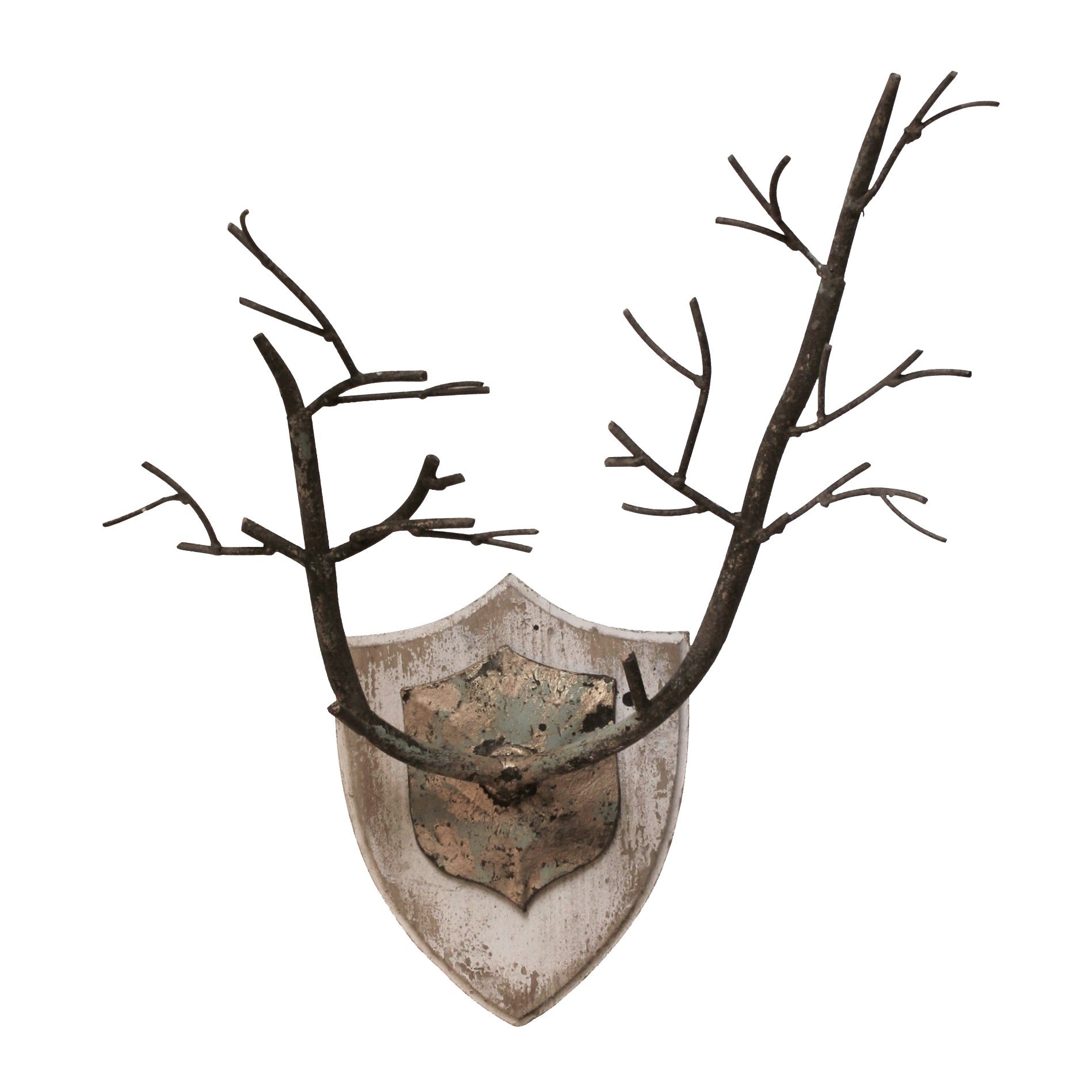 Vintage inspired antler plaque hand-crafted of fir wood and metal. Distressed beige wood plaque with aged metal antlers. Ready to hang with two hangers on the back.