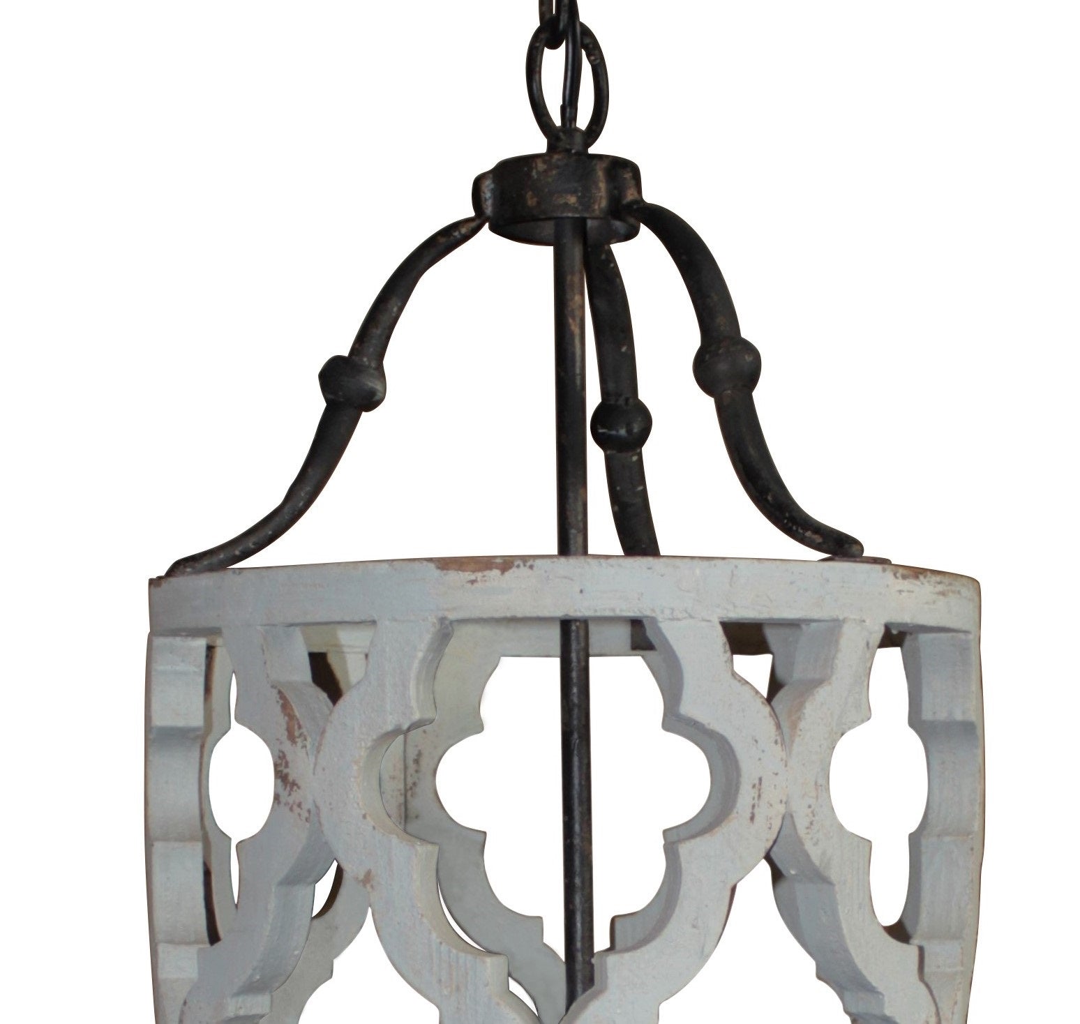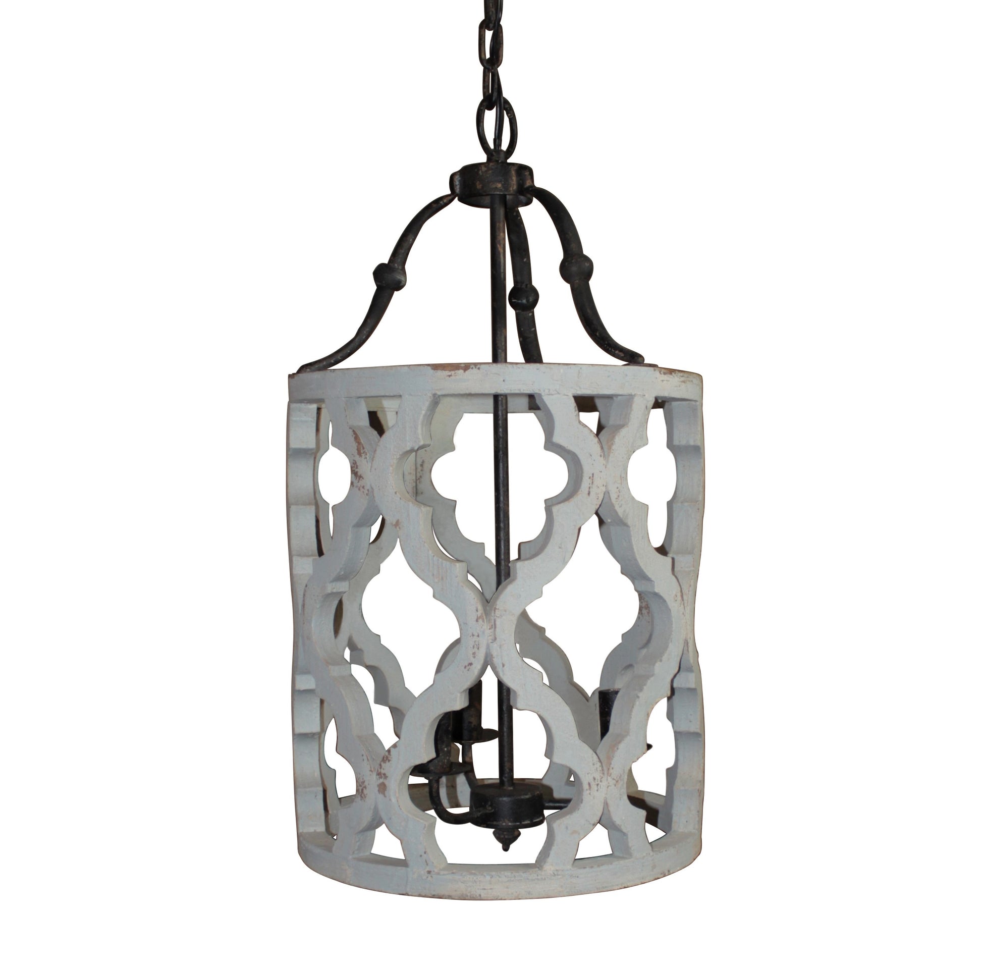 Drum shape pendant light made of hand-cut wood. Light gray distressed multi-layer hand painted finish with aged patina. Rustic finish dark gray iron accents, chain and canopy. Three 40W max candelabra bulbs. Chain and canopy totals 40" in length and canopy is 4.75"D. UL listed.