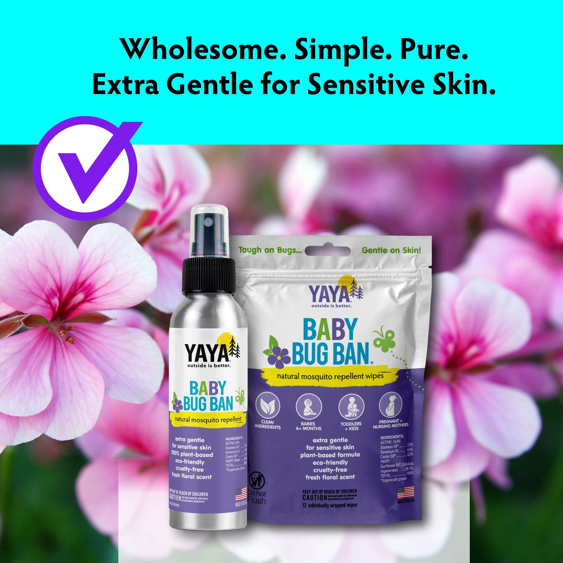 Baby Bug Ban™ extra gentle bug repellent + wipes bundle is perfect for Mom’s and littles on the go! With our eco-friendly bug repellent spray, and convenient extra gentle wipes at your fingertips, Mama and baby will be ready for any outdoor adventure, keeping pesky bugs at bay! Includes: one BABY BUG BAN™ Bug Repellent Spray 4 oz and one BABY BUG BAN™ wipes pouch (12 individually wrapped wipes inside). Formulas are 100% plant based and feature rose geranium oil using natural and organic ingredients. This gentle formula does not include any permethrin, synthetics, GMO's, mineral oil, alcohol, clove, peppermint, cedarwood, rosemary or citronella which can be harsh on babies ( or Mama’s) skin. YAYA only uses clean, "better-for-you" ingredients that you can trust with your whole family. Made in the USA.