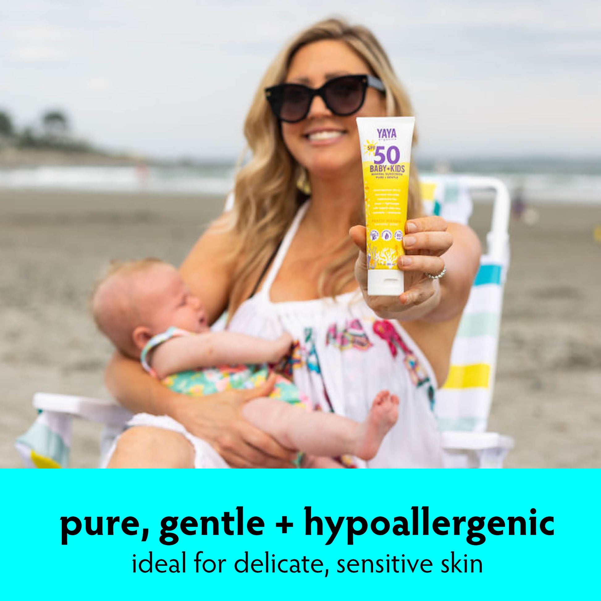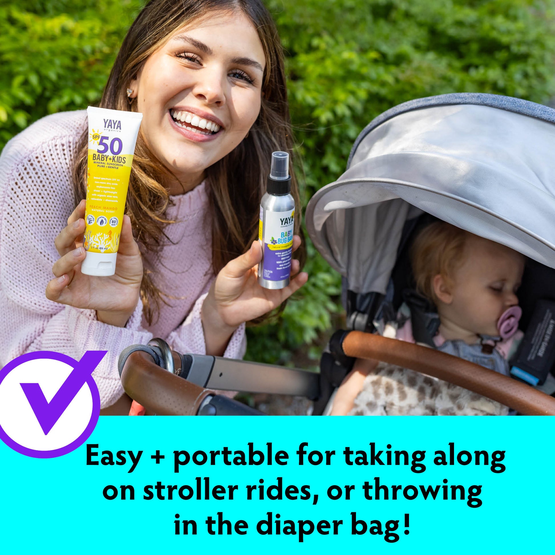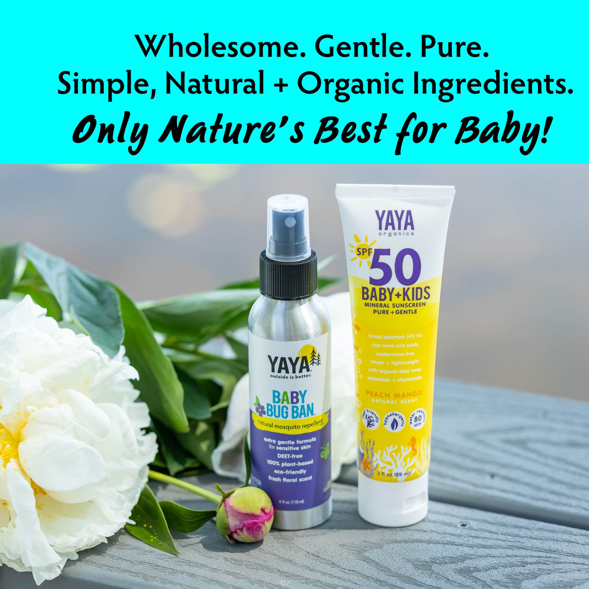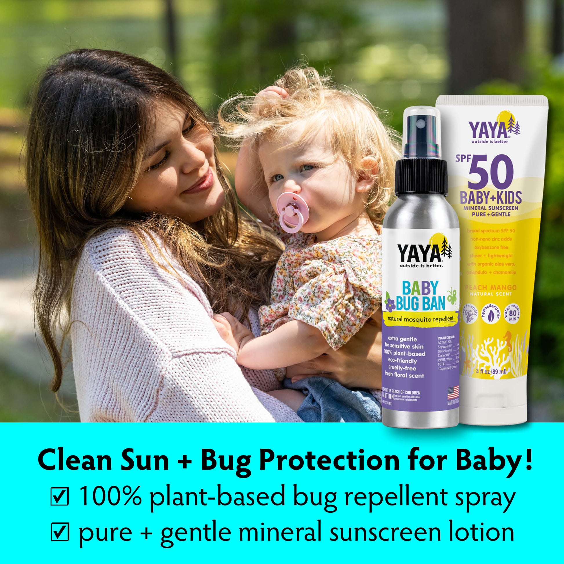 Sun + Bug Protection Bundle for Baby + Kids by YAYA Organics includes a reef-friendly SPF 50 Mineral Sunscreen 3 oz and Deet-free Baby Bug Ban Natural Bug Repellent Spray 4 oz. GENTLE + SAFE: This is your go-to bundle for enjoying outdoor adventures with young kids! Protect your little ones with confidence, using only the cleanest ingredients that are eco-friendly, non-toxic, pure, soothing and gentle. Ideal bundle for babies (6+ months), toddlers, children, pregnant/nursing mothers, and sensitive skin. NOURISHING SUN PROTECTION: Our hypoallergenic better-for-you SPF 50 mineral sunscreen is powered by non-nano zinc oxide for broad-spectrum UVA/UVB protection, while nourishing the skin with natural + organic botanicals including aloe vera, calendula, chamomile, sea buckthorn, mango butter + more. Reef-safe. Sheer and lightweight, easy to apply and leaves skin soft, protected and hydrated. Water resistant up to 80 min. Light peach-mango natural scent. Free from chemical actives like oxybenzone. 100% PLANT-BASED BUG REPELLENT: Keep the bugs away, the natural way. Our formula is gentle, yet effective at repelling mosquitos and biting bugs. Crafted with high quality essential oils including non-GMO, natural and certified organic ingredients. Lab-tested. Perfect for babies, toddlers, and sensitive skin. Free from DEET, permethrin, clove, eugenol, citronella, GMO’s, alcohol, petroleum-based products and known irritants. ECO-FRIENDLY FORMULAS: YAYA’s clean and expertly crafted formulas are designed so that you can enjoy the great outdoors with confidence and peace of mind. Wholesome, safe and lab-tested, YAYA is dedicated to making premium products that are safe for people and the environment, non-irritating and cruelty-free. Made in the USA.