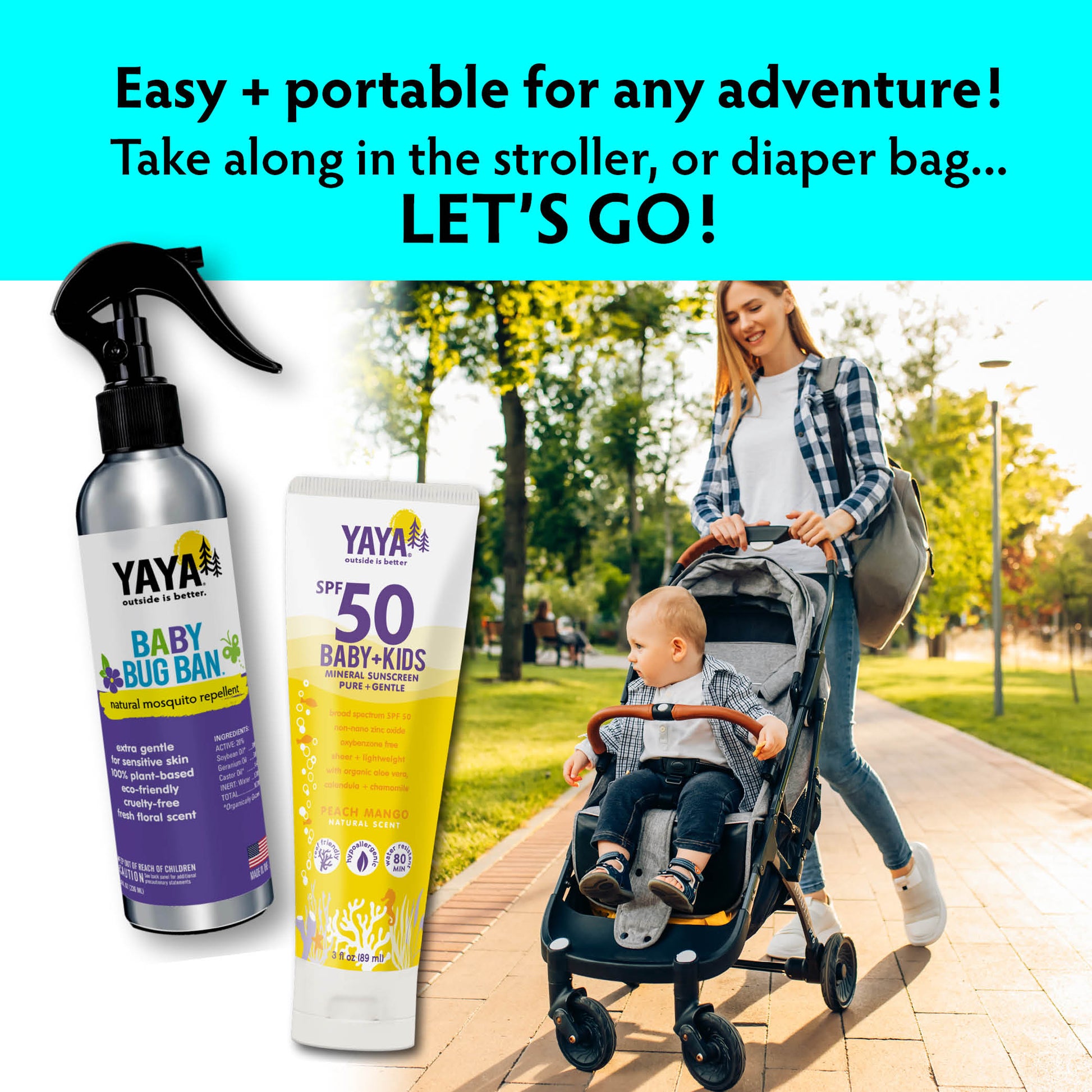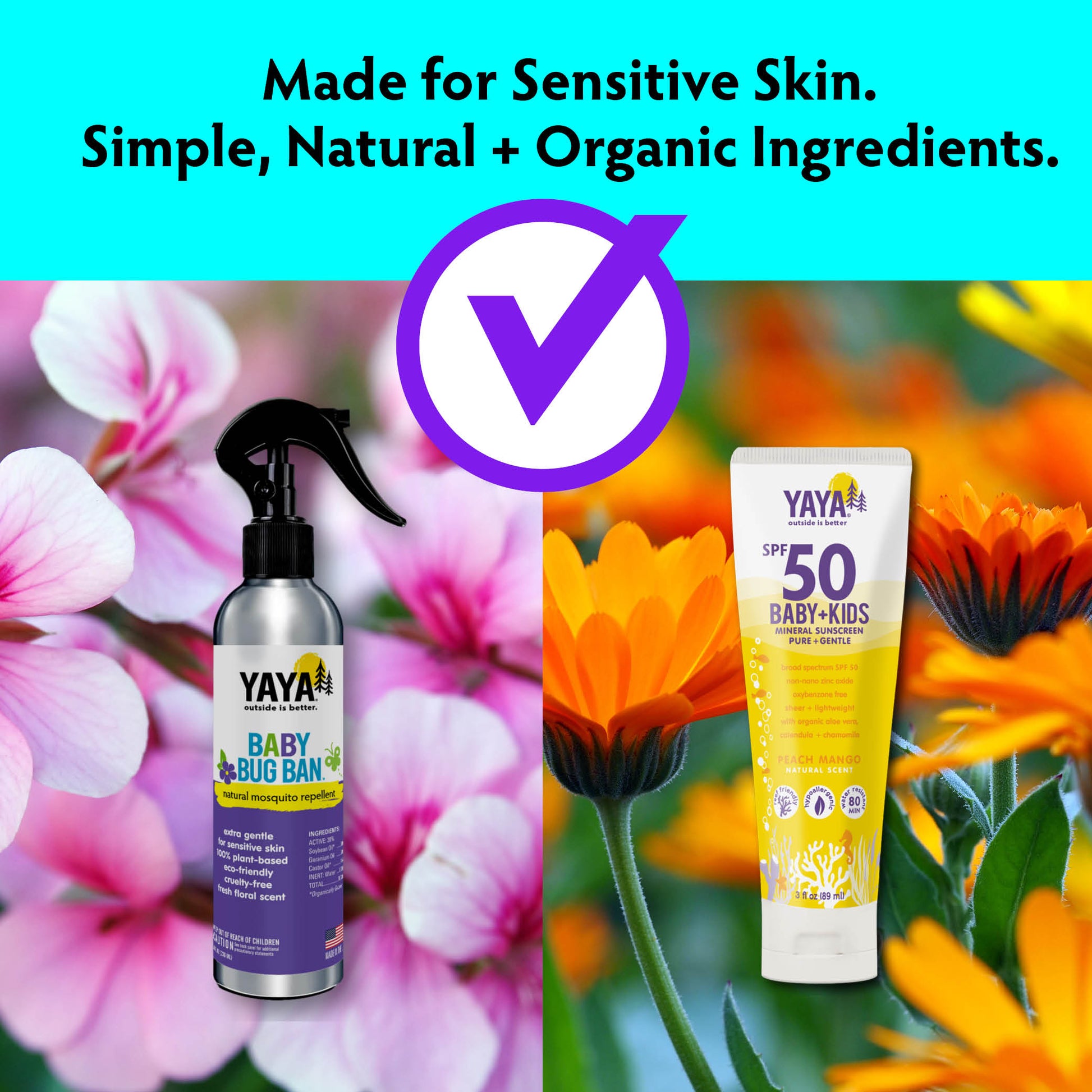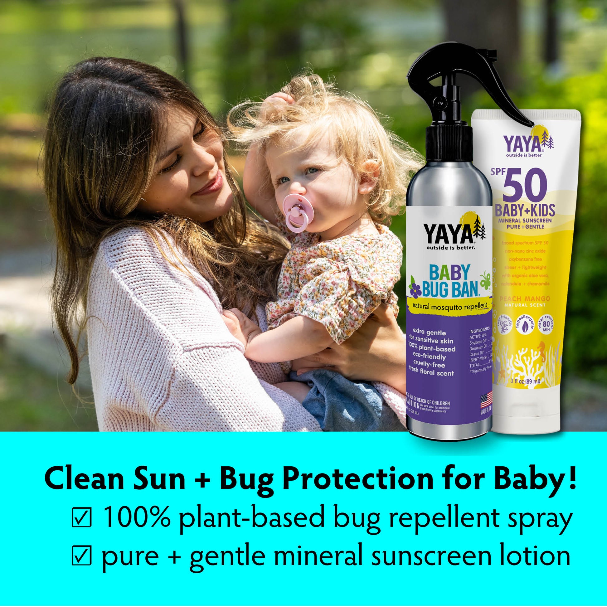 Sun + Bug Protection Bundle for Baby + Kids by YAYA Organics includes a reef-friendly SPF 50 Mineral Sunscreen 3 oz and Deet-free Baby Bug Ban Natural Bug Repellent Spray 8 oz. GENTLE + SAFE: This is your go-to bundle for enjoying outdoor adventures with young kids! Protect your little ones with confidence, using only the cleanest ingredients that are eco-friendly, non-toxic, pure, soothing and gentle. Ideal bundle for babies (6+ months), toddlers, children, pregnant/nursing mothers, and sensitive skin. NOURISHING SUN PROTECTION: Our hypoallergenic better-for-you SPF 50 mineral sunscreen is powered by non-nano zinc oxide for broad-spectrum UVA/UVB protection, while nourishing the skin with natural + organic botanicals including aloe vera, calendula, chamomile, sea buckthorn, mango butter + more. Reef-safe. Sheer and lightweight, easy to apply and leaves skin soft, protected and hydrated. Water resistant up to 80 min. Light peach-mango natural scent. Free from chemical actives like oxybenzone. 100% PLANT-BASED BUG REPELLENT: Keep the bugs away, the natural way. Our formula is gentle, yet effective at repelling mosquitos and biting bugs. Crafted with high quality essential oils including non-GMO, natural and certified organic ingredients. Lab-tested. Perfect for babies, toddlers, and sensitive skin. Free from DEET, permethrin, clove, eugenol, citronella, GMO’s, alcohol, petroleum-based products and known irritants. ECO-FRIENDLY FORMULAS: YAYA’s clean and expertly crafted formulas are designed so that you can enjoy the great outdoors with confidence and peace of mind. Wholesome, safe and lab-tested, YAYA is dedicated to making premium products that are safe for people and the environment, non-irritating and cruelty-free. Made in the USA.