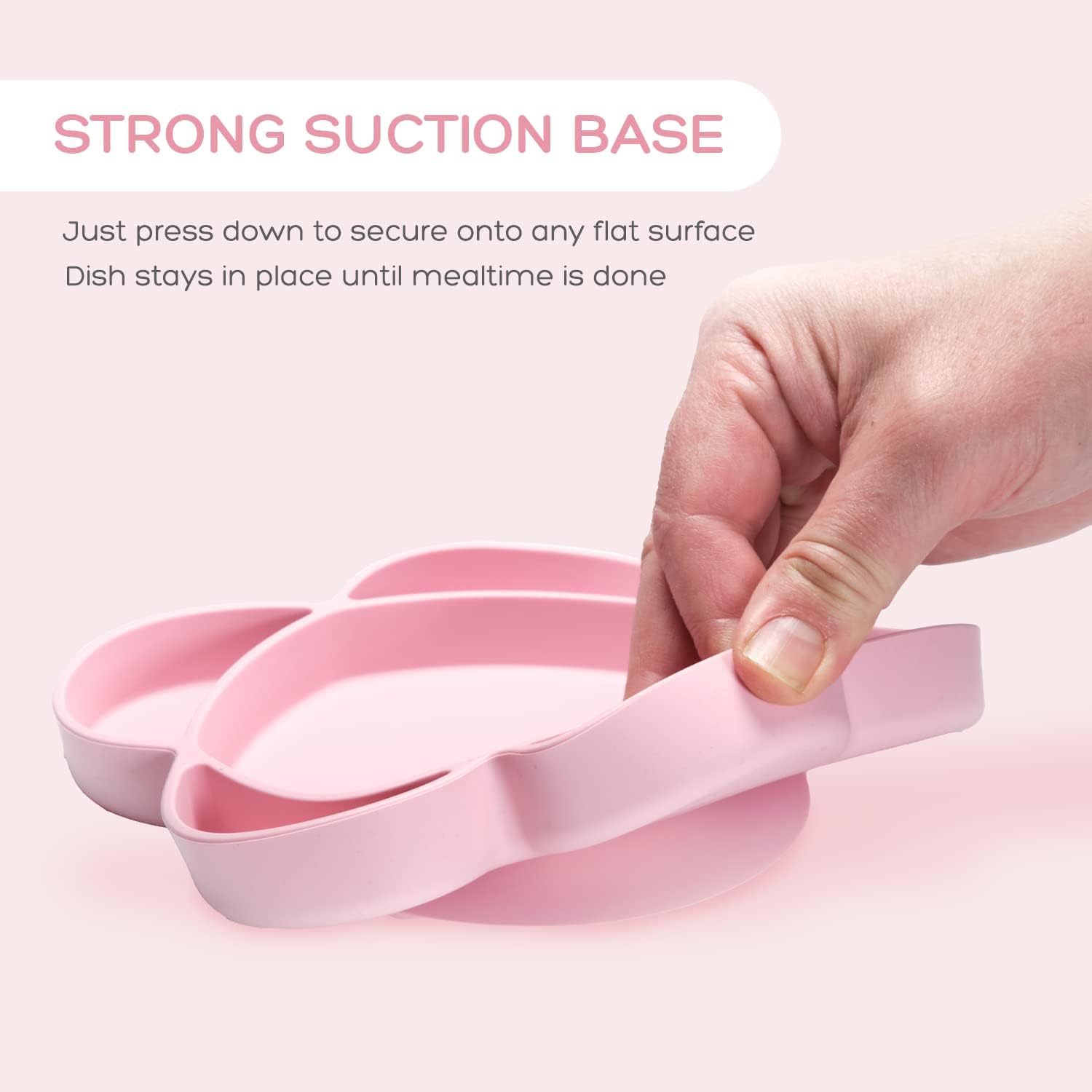 INDEPENDENT EATING: This silicone plate for babies and toddlers features a divided design that makes it easy to serve different foods and prevent spills. With a strong suction base, it stays securely in place on any flat surface, so your child can enjoy their meal without the frustration of a sliding plate. From baby-led weaning to independent eating, this toddler plate is ideal for helping your child build their fine motor skills and develop their ability to feed themselves at their own pace.