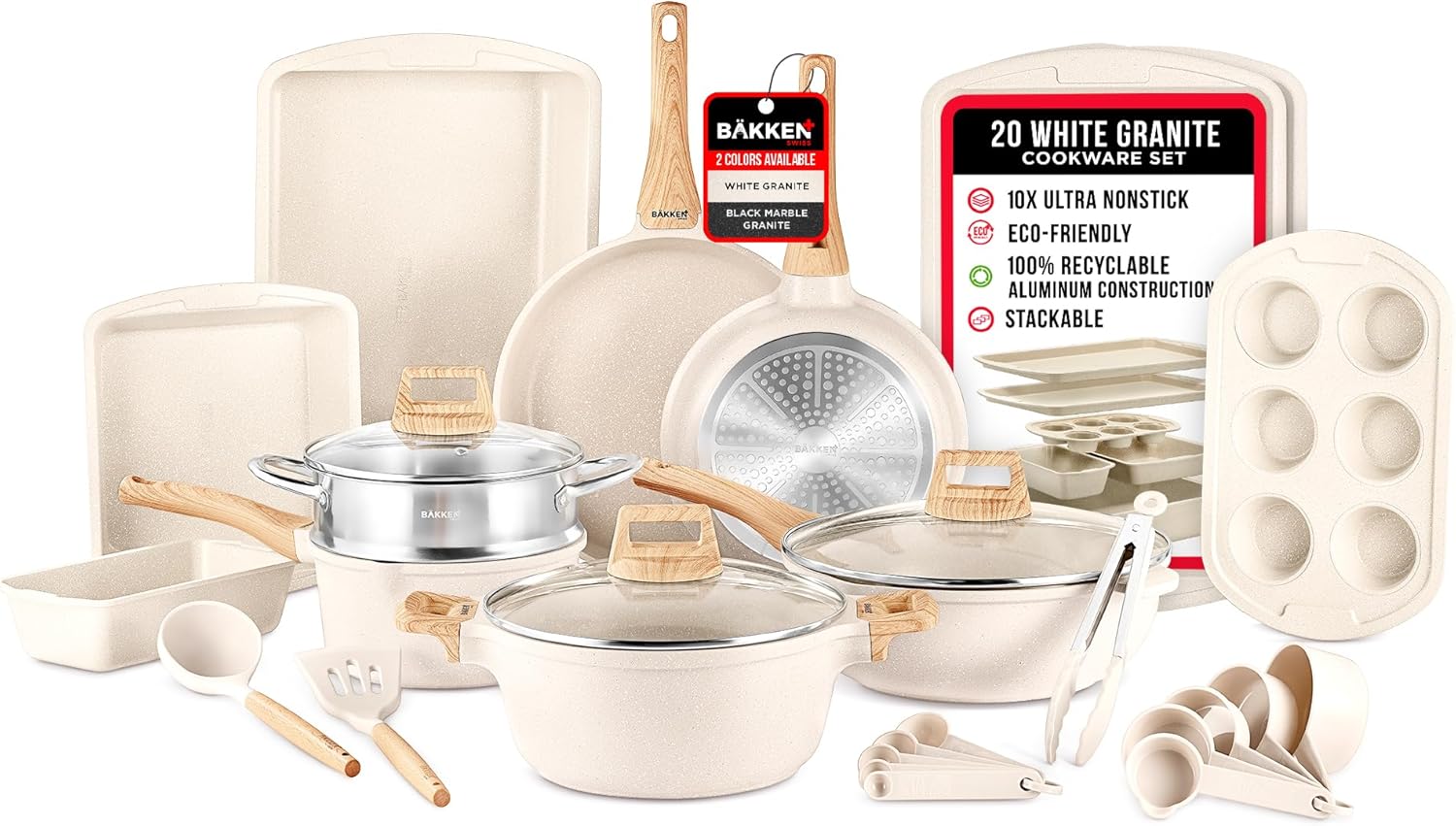 Bakken-Swiss 20-Piece Kitchen Cookware Set – Granite Non-Stick – Eco-Friendly – for All Stoves & Oven-Safe - Marble coating