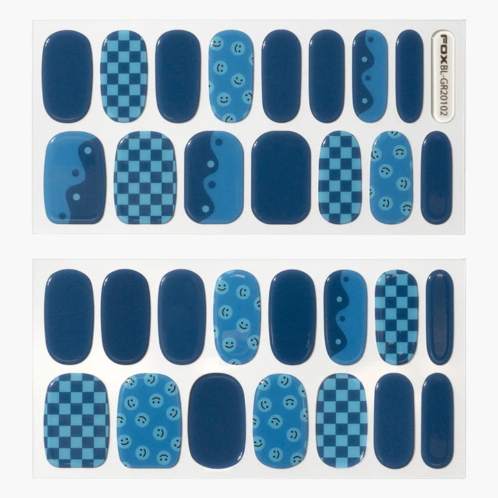 Lift your mood and elevate your style with these gel nail strips. Blues Grooves features three prints that will have you dancing with delight. Perfect for festival season, this groovy blue nail set includes a checkered print, smiley faces, and a wavey yin-yang to help you break away from boring manicures and balance your bold badass attitude with that free spirit.