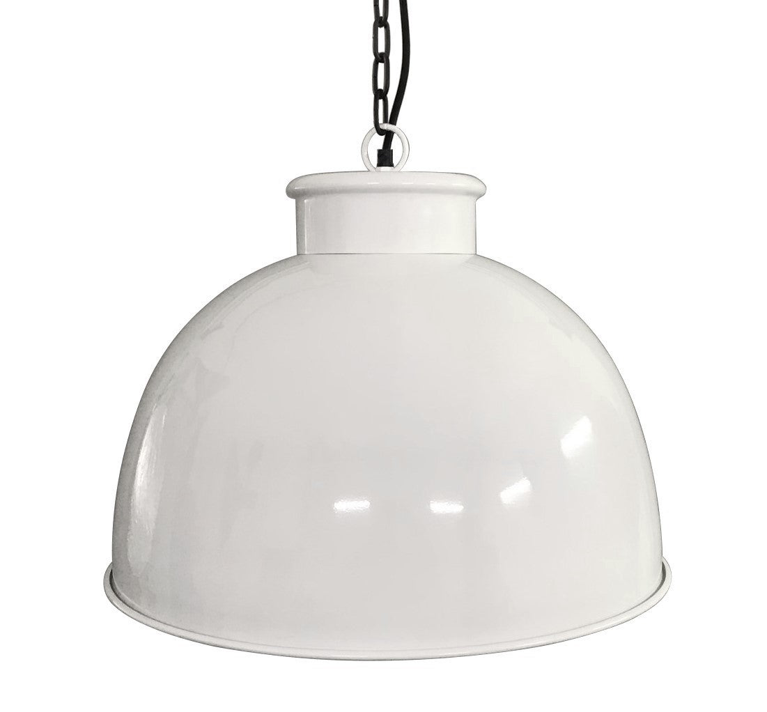 Vintage inspired factory style pendant light. Hand-crafted of white enamel coated iron inside and outside. Black cord, dark gray metal chain (36"L) and canopy. Takes one 100W max lightbulb (not incuded).