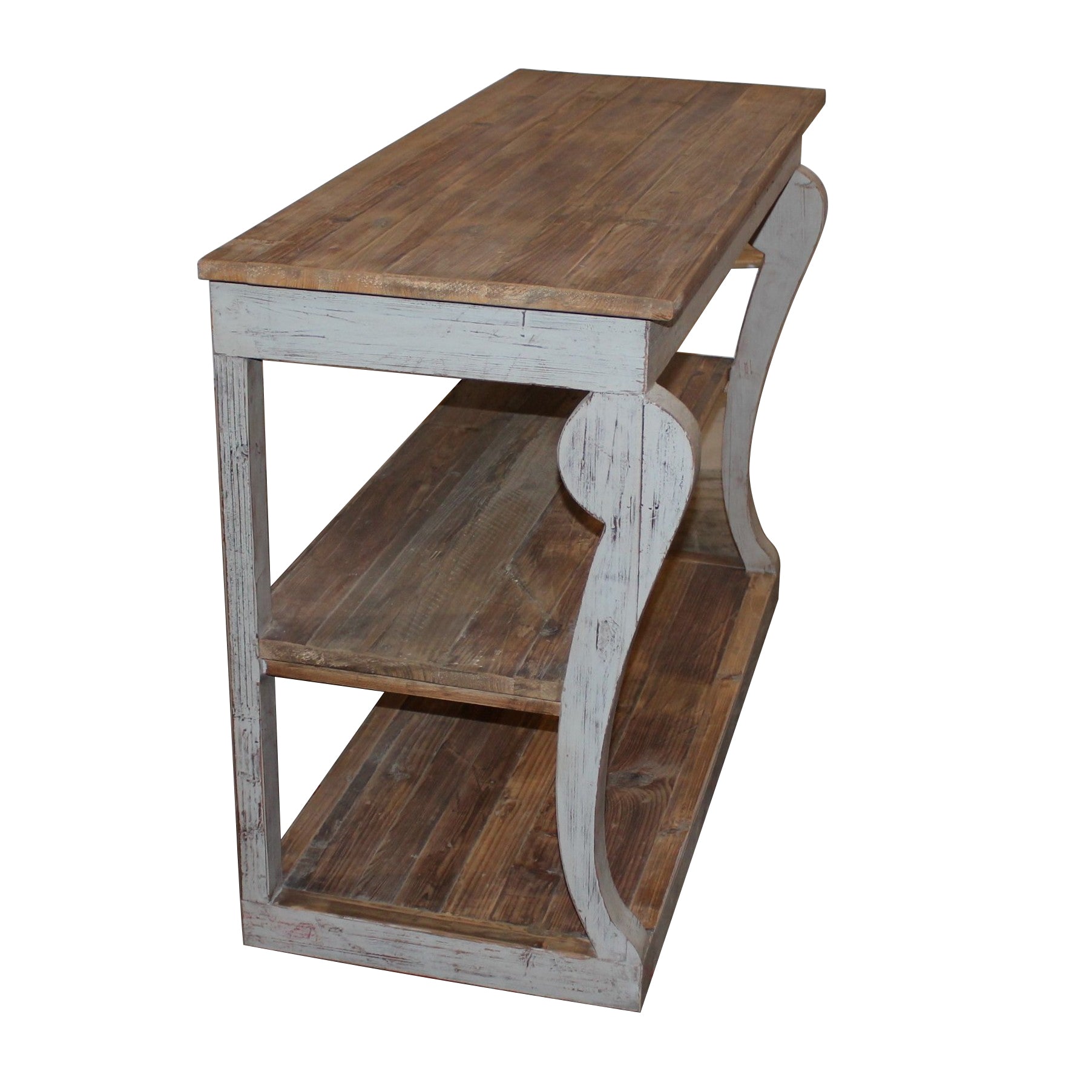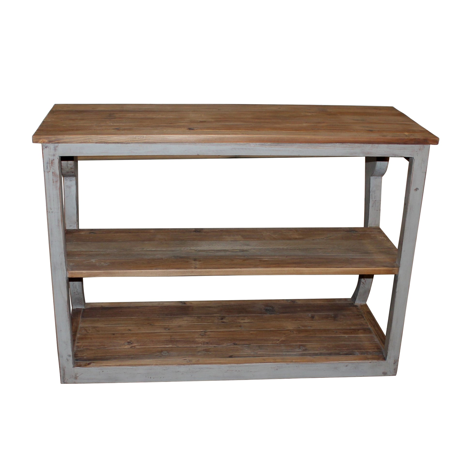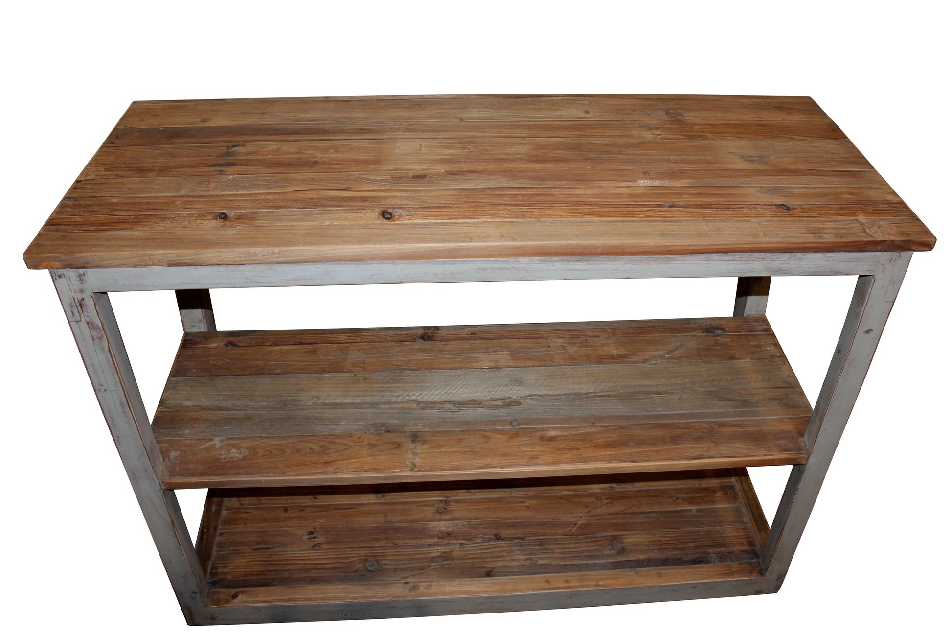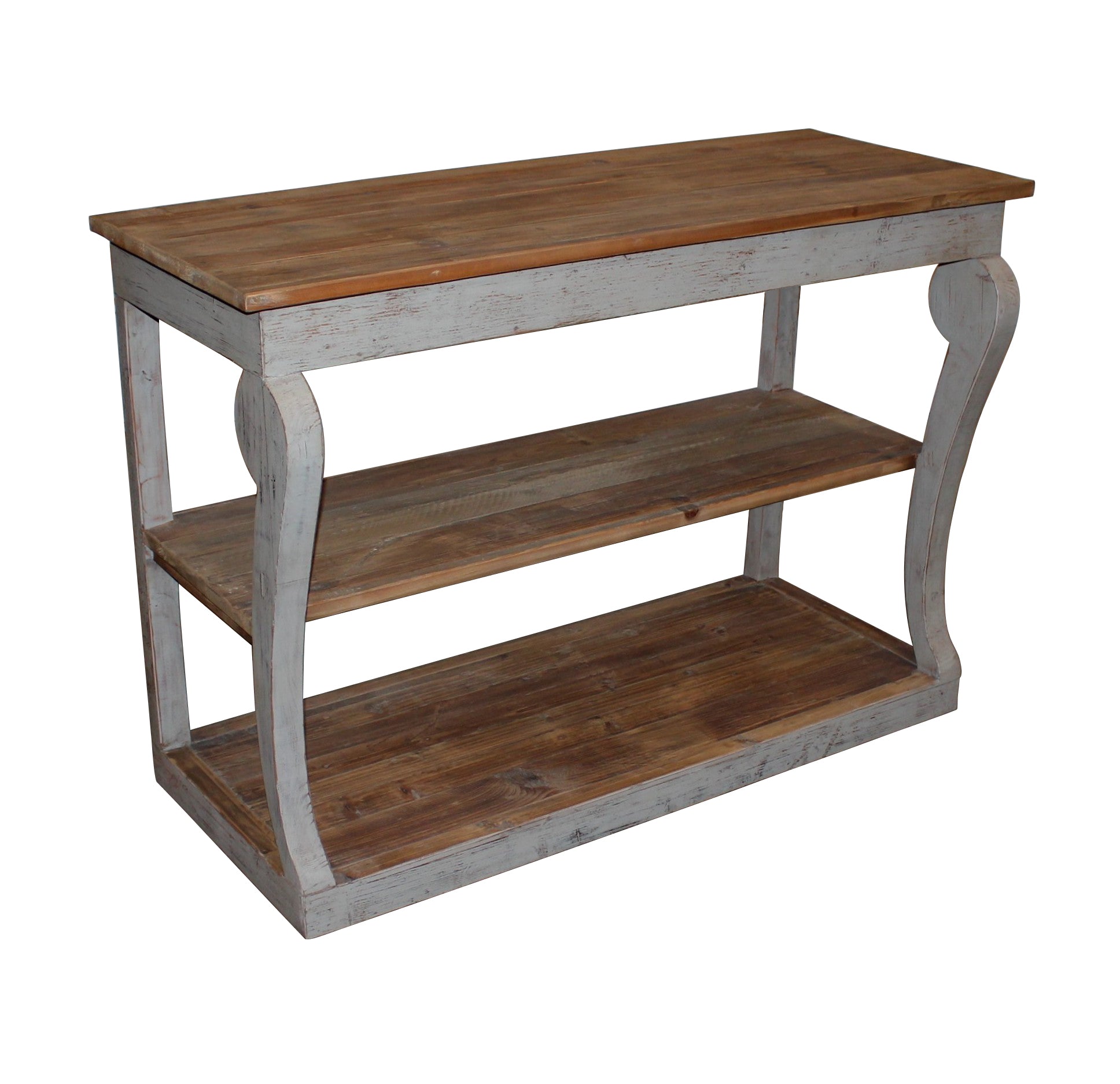 This versatile console has three shelves in natural finish reclaimed solid pine and is accented with a gray hand-painted finish. Will likely have nail holes, knots and other imperfections, adding charm and character.