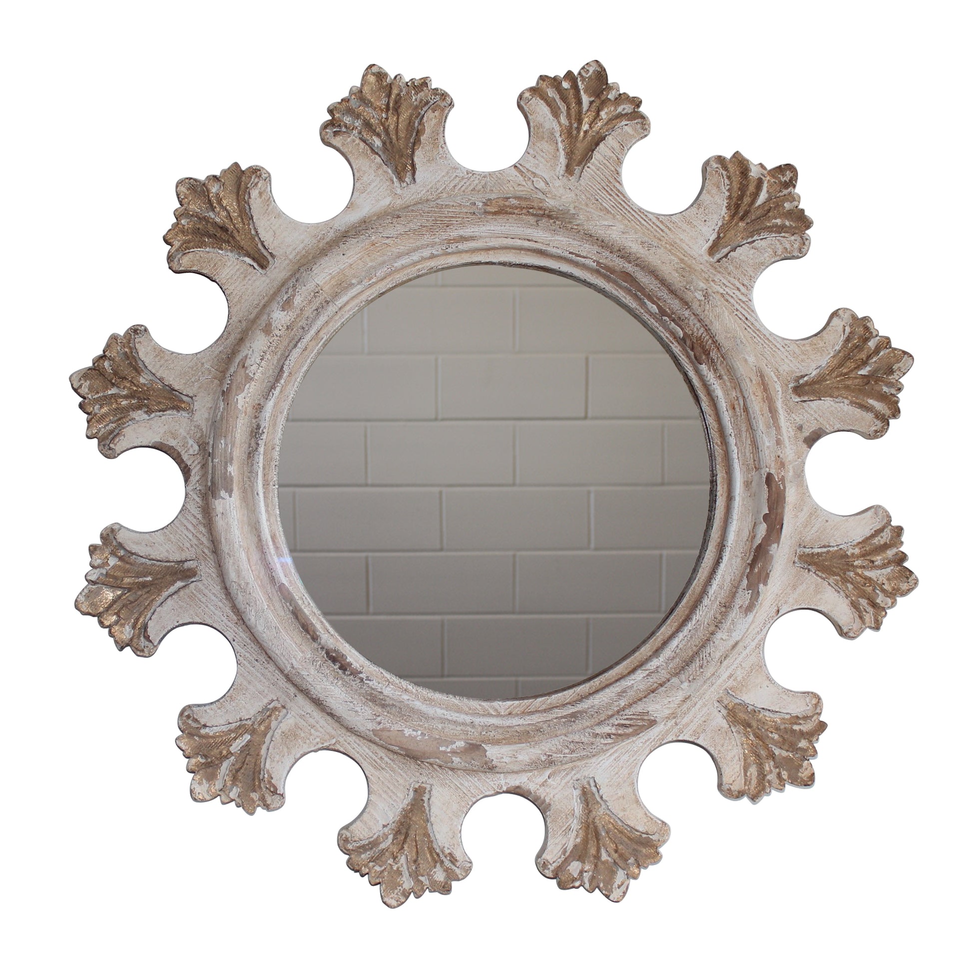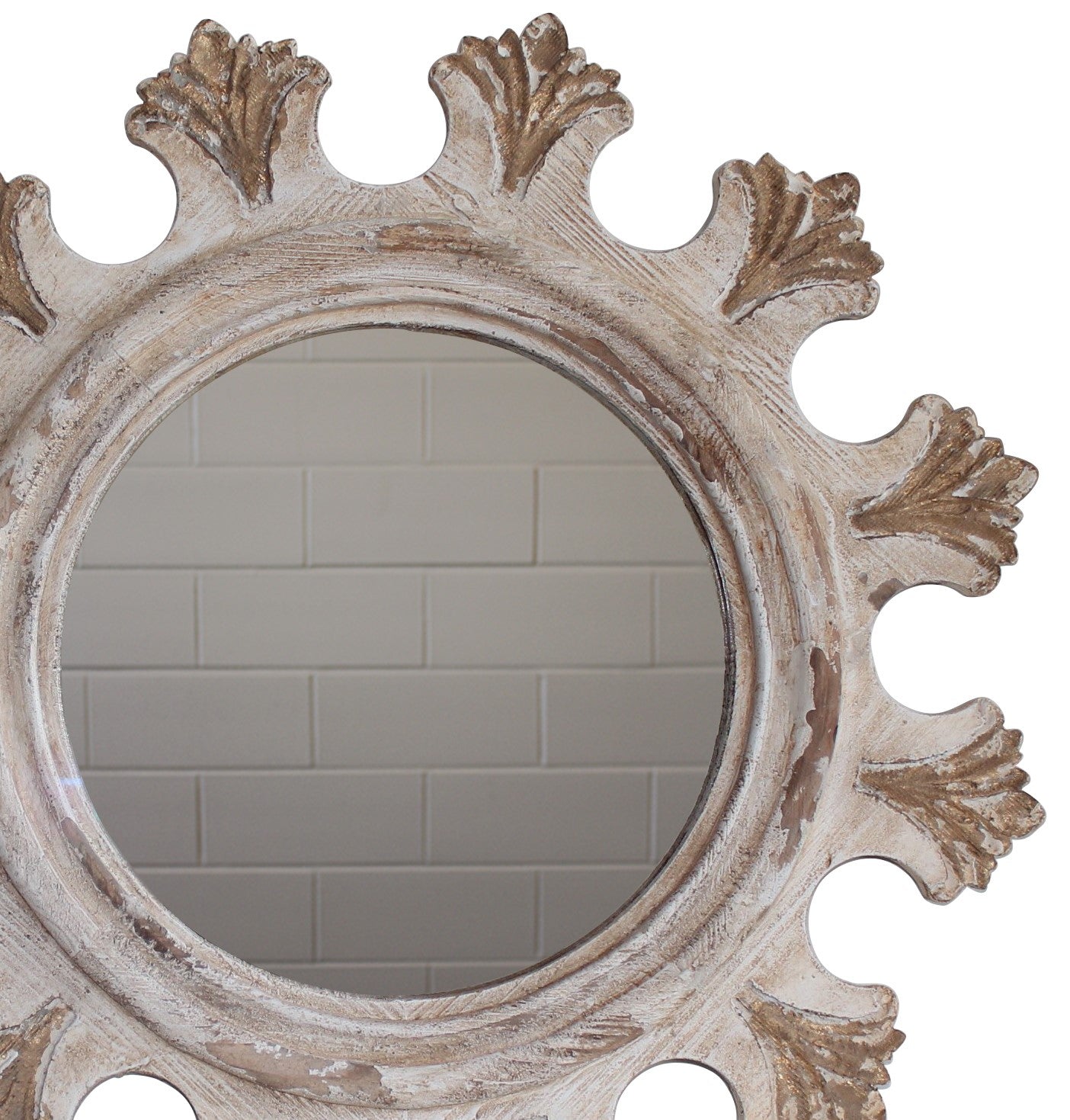 Vintage inspired sunburst mirror expertly hand-crafted of fir wood.Lightly distressed white finish with vintage gold edge accents. Ready to hang with two hangers on the back.
