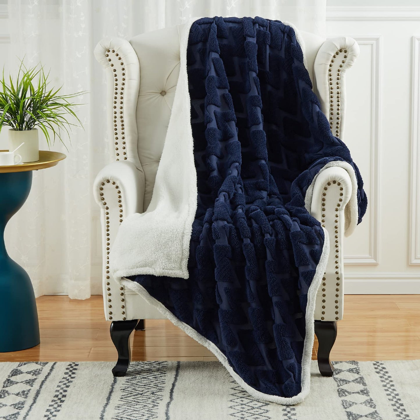 CAROMIO Sherpa Fleece Soft Plush Jacquard Fluffy Throw Blanket Navy Blue 50" x 60"