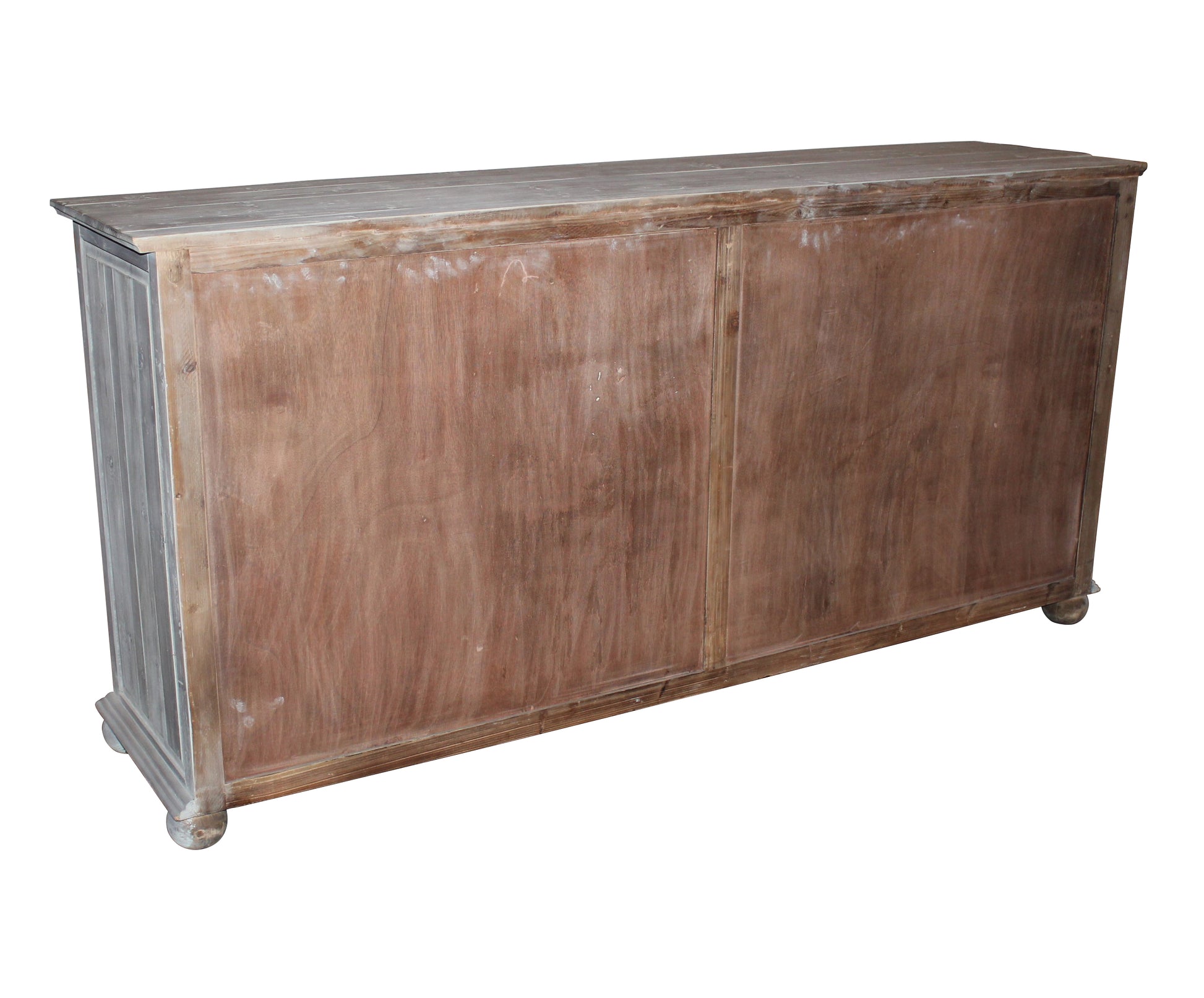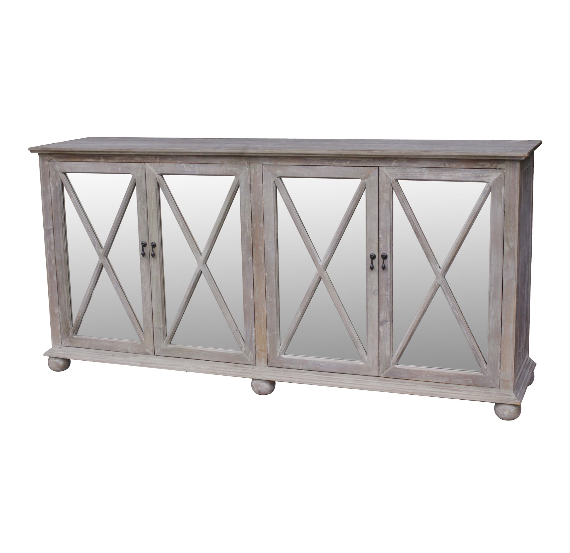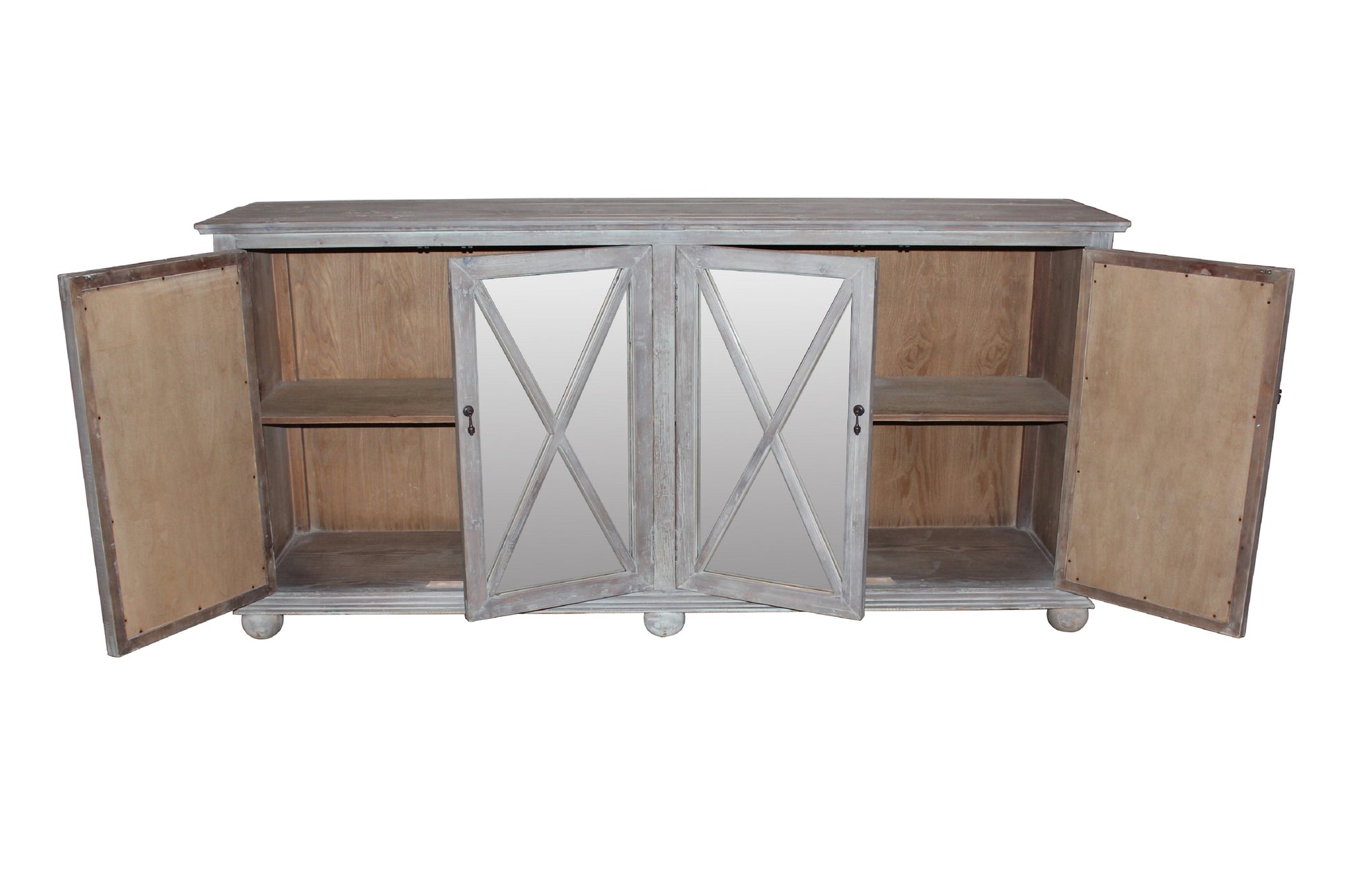 Made of reclaimed solid pine with hand applied gray wash finish. Features four hinged mirrored doors with "X" design, one fixed shelf inside and bun feet. Reclaimed pine, by nature, is apt to have knots and imperfections adding charm and character and should be expected with this item.
