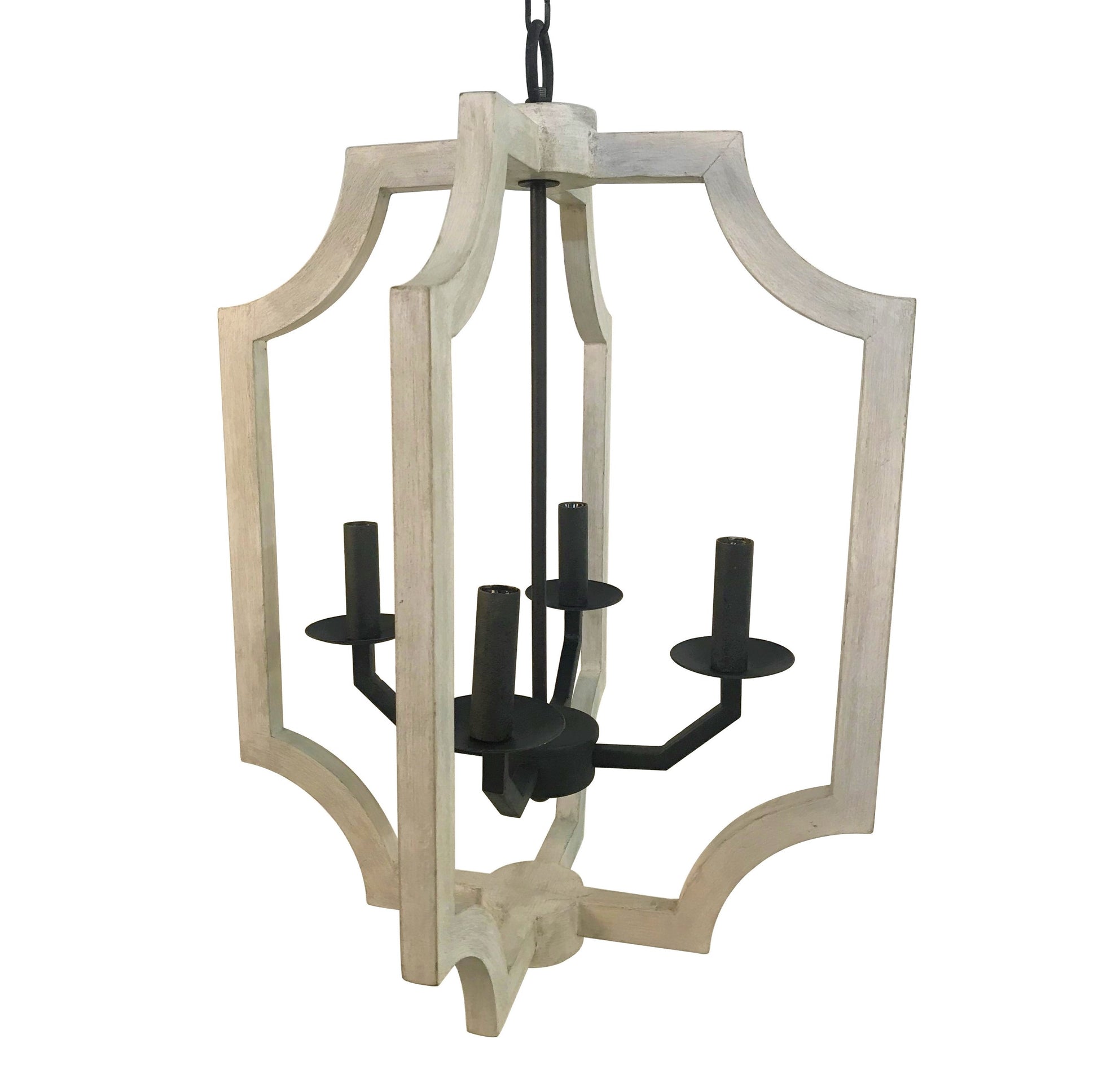 Pendant light hand-crafted of 3D wood in a white painted finish. Black cord, dark gray finish chain (36"L), candle holders and canopy. Four 40W max candleabra base bulbs (not included).