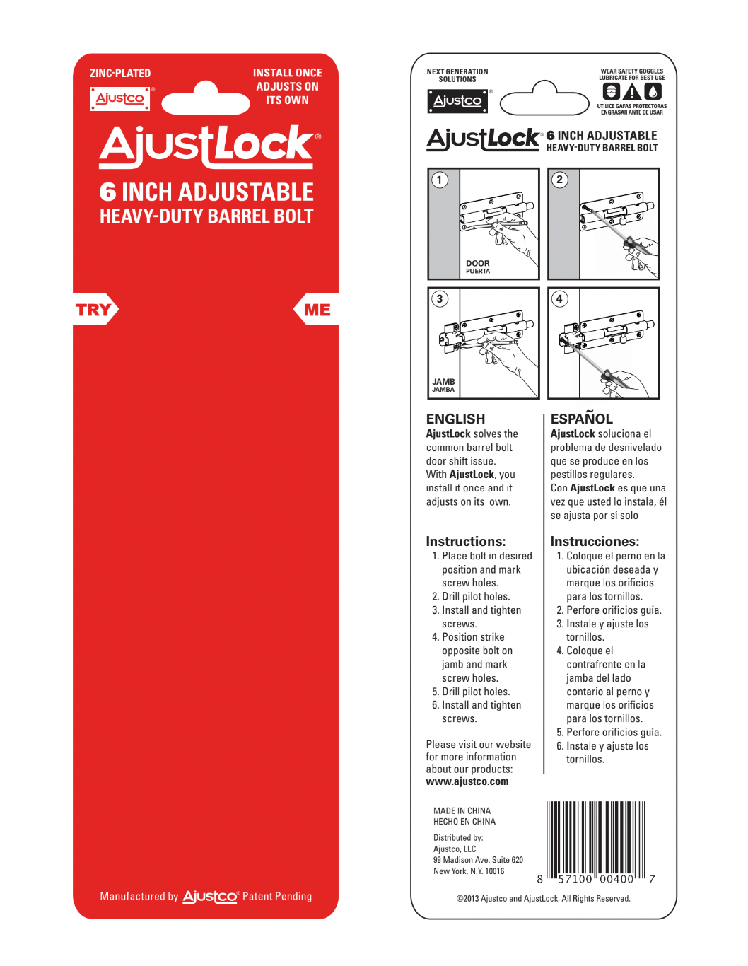 The Ajustlock is a unique patended ajustable barrel bolt that automatically adjusts to door and frame shifts