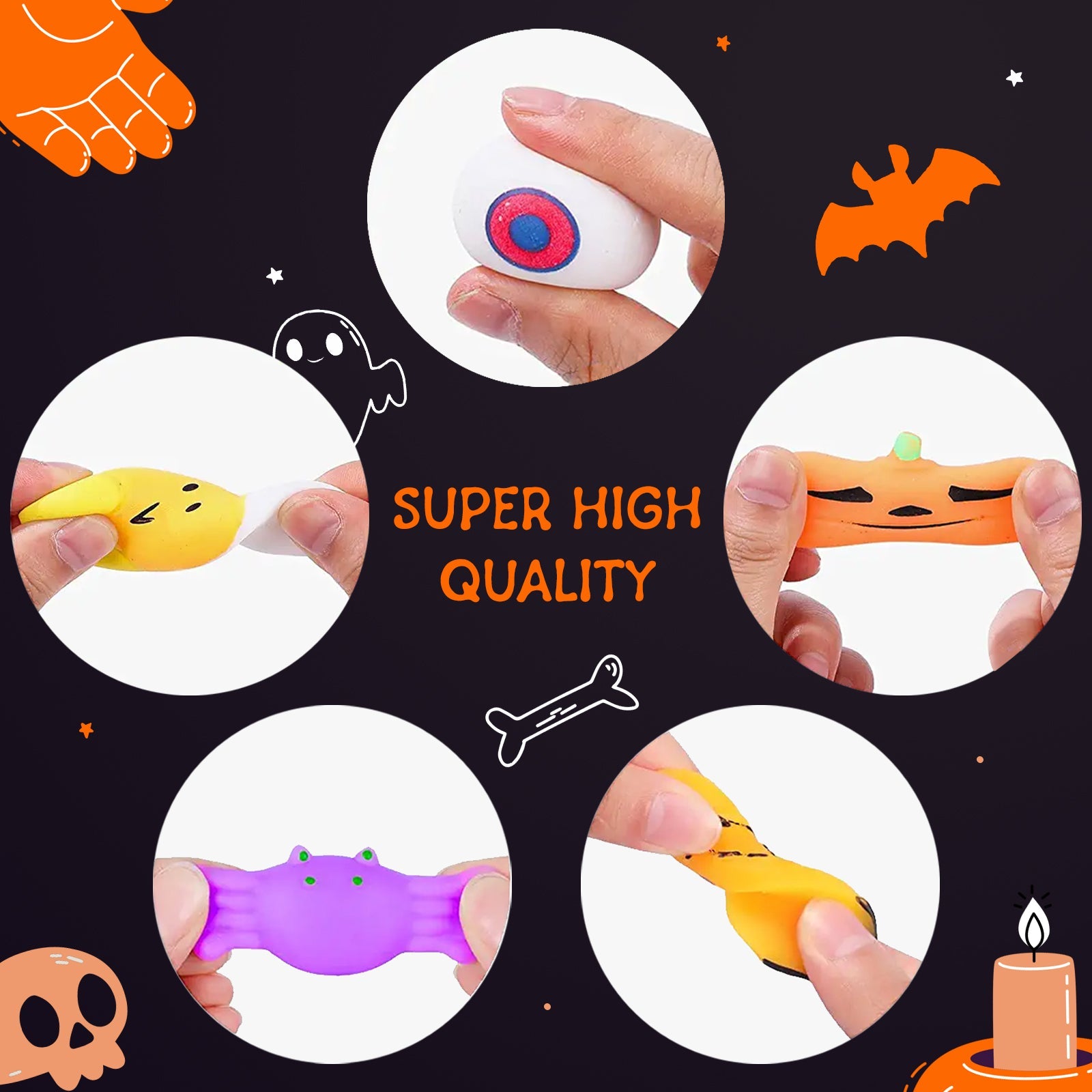 Endless Fun Halloween Party Favors: Halloween mochi squishy toys with great assortment, awesome Halloween party favors for kid boy girl. It's fun to stamp, stretch and squeeze them when you are boring. Just invite your friends sharing and playing this mini toys as game prizes pinatas fillers. Easy to carry in pocket anywhere. Wonderful Halloween party supplies, goodie bag fillers.