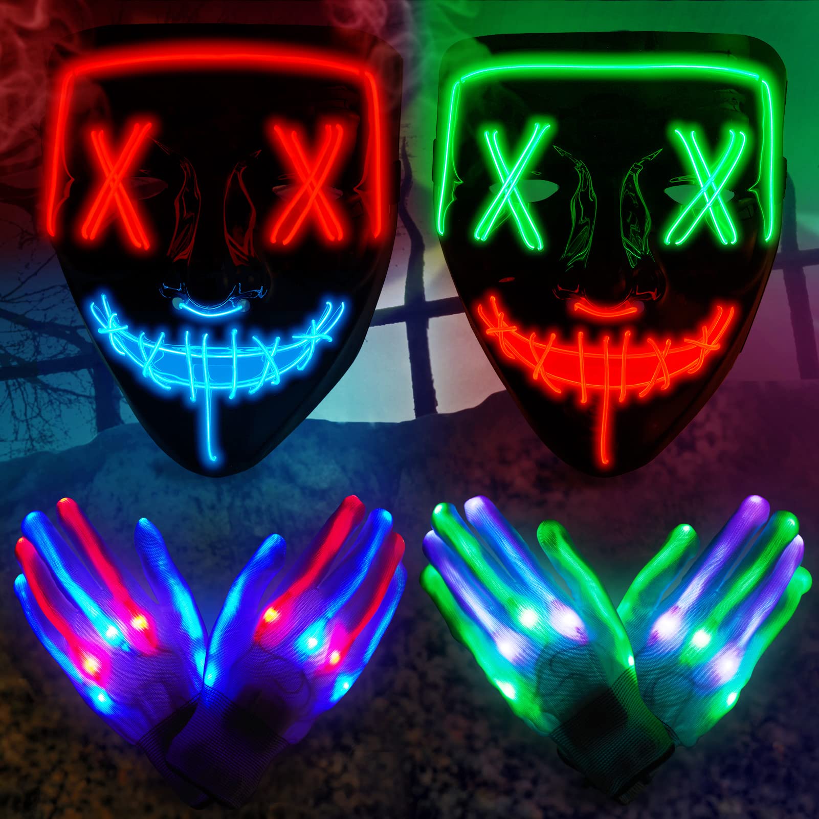 PACKAGEING---This set includes 2pcs halloween purge mask,each scary mask have 2colors and 3 light modes(light on, slow flash, and fast flash), 4pcs led glow gloves have 3 different glowing modes,You can adjust the mode by the control panel.