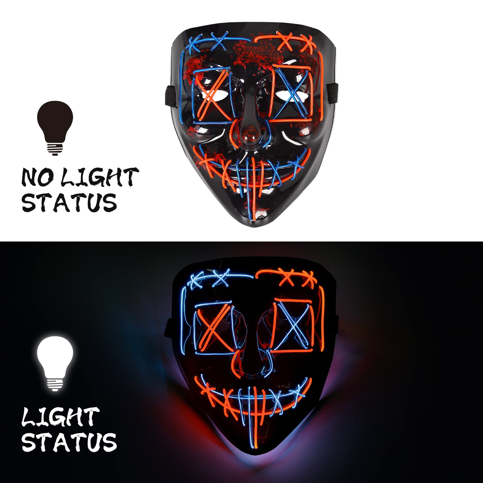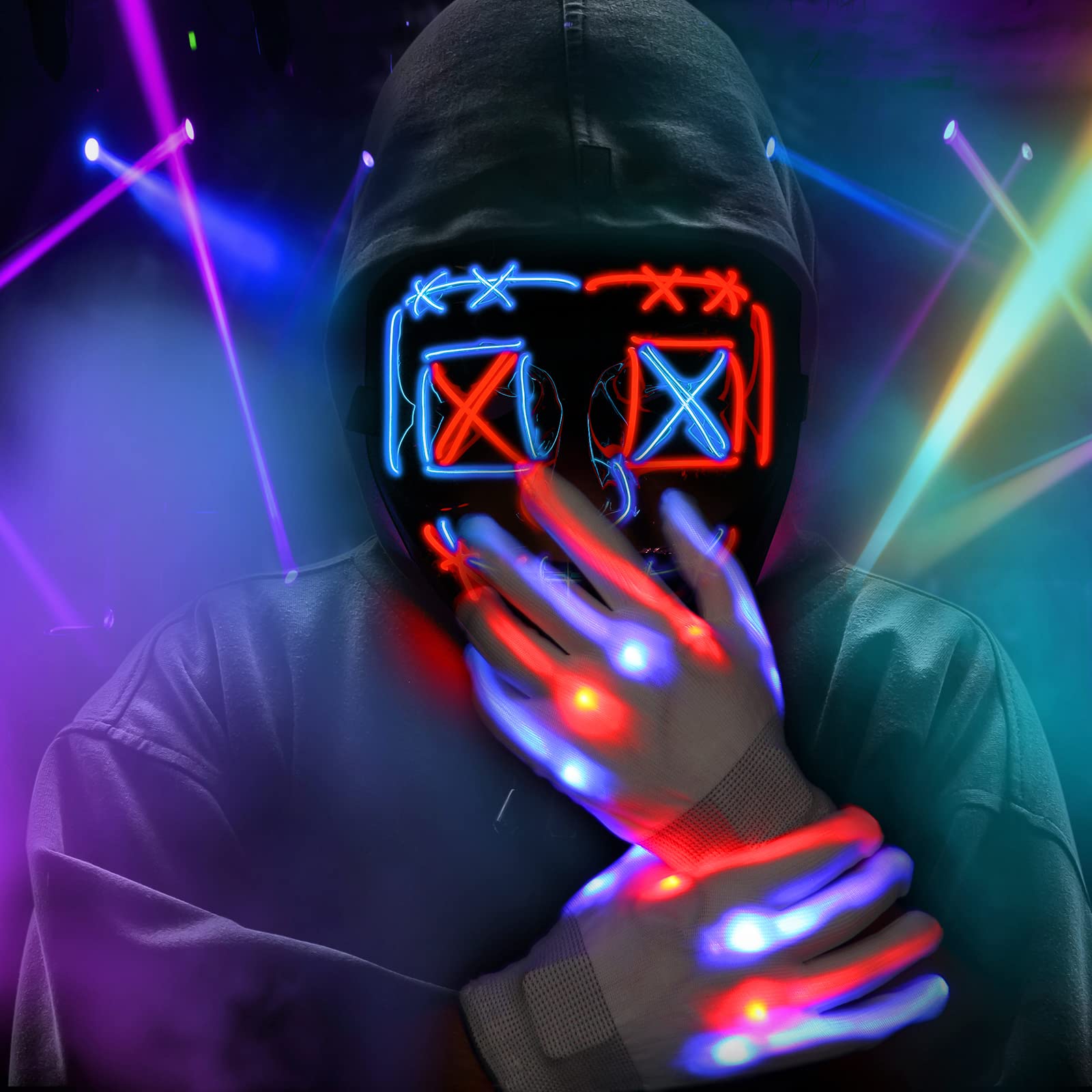 Super Value:This set includes a Halloween purge mask with red and blue cross wires and a pair of glowing gloves with multiple lighting modes. Making you a unique shining spot at your Halloween party.
