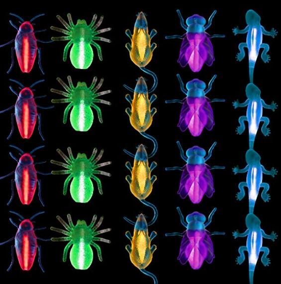 PACKAGE INCLUDED: The party favors set included 20pcs Glow Critters(Transparent color; Cockroaches, rats, spiders, gecko, scorpion), 40pcs Glow Sticks(Five colors: transparent color, red, pink, yellow, green), 28pcs Glow Ring and 20pcs Black Ropes, enough quantity for your Halloween party.