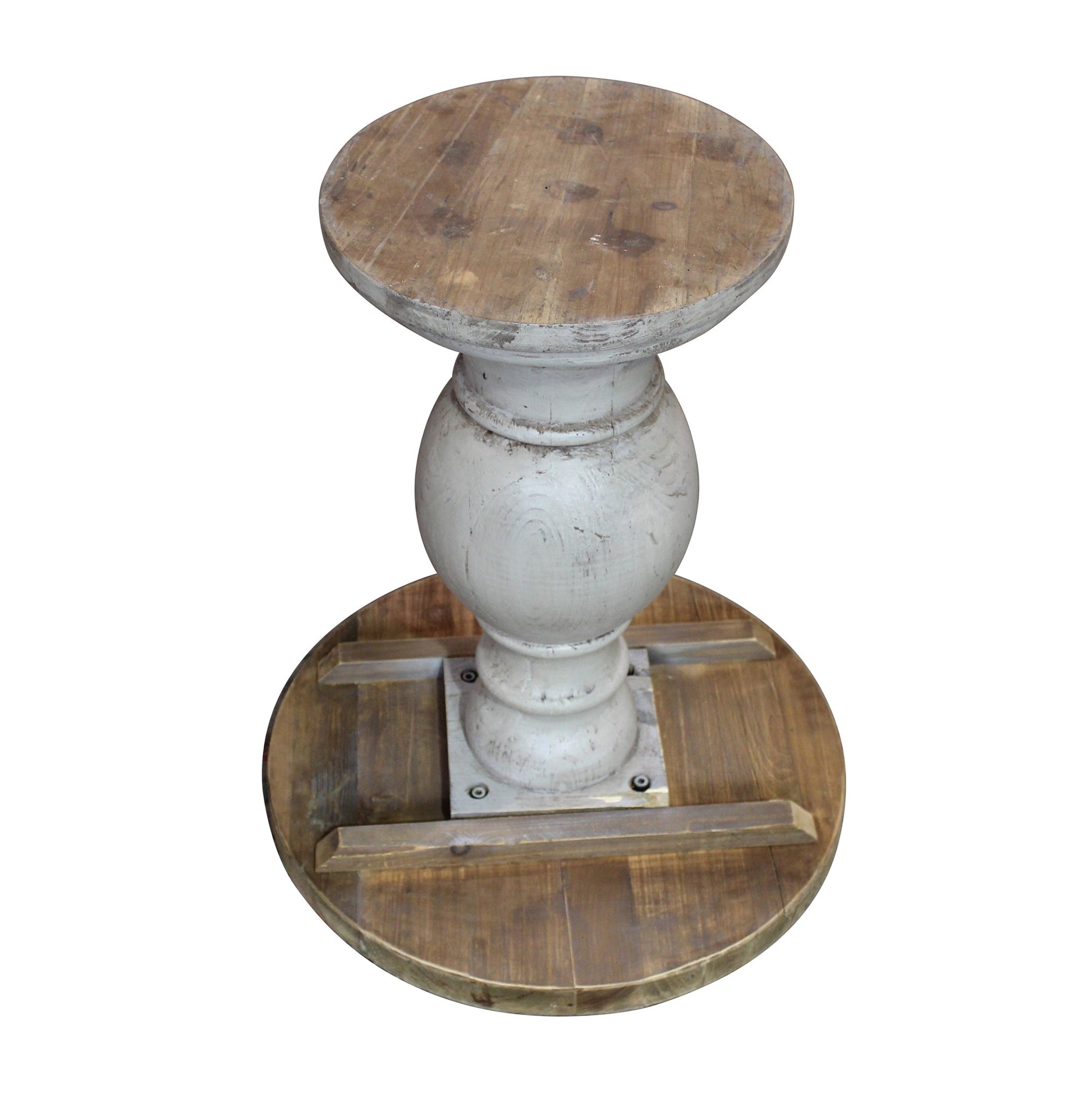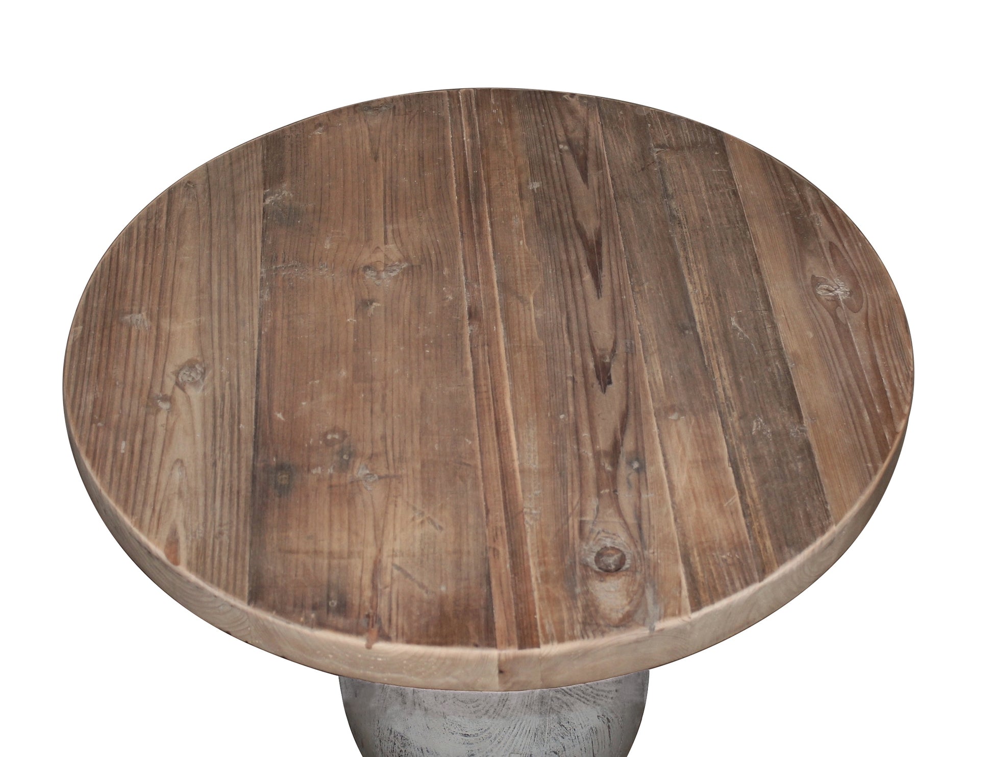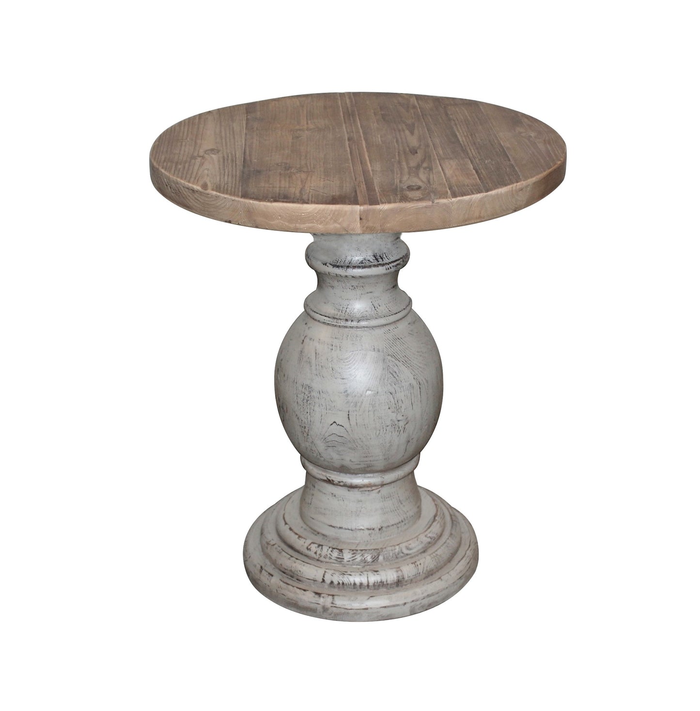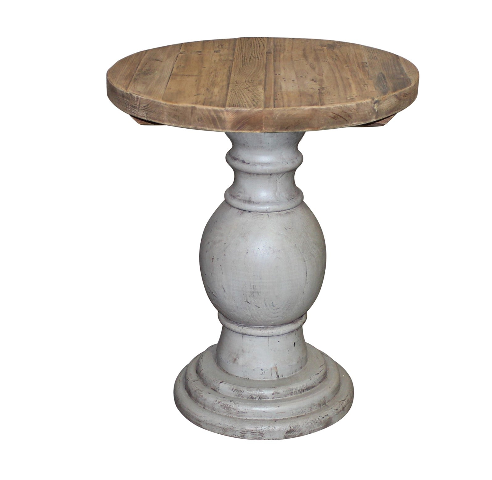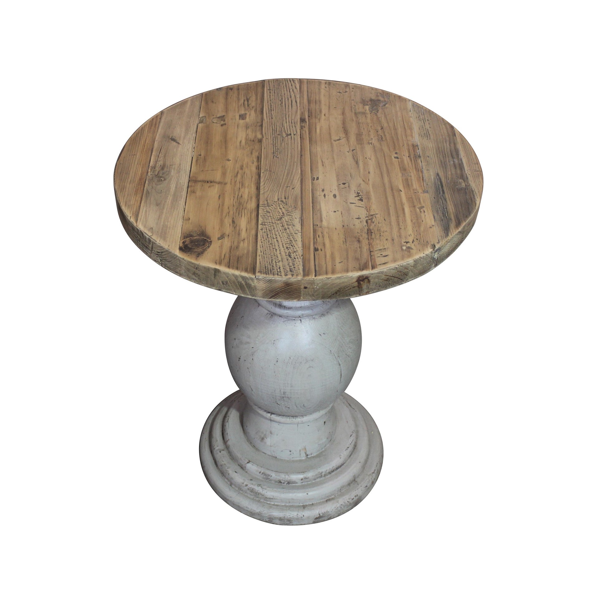Sturdy side table made of reclaimed solid pine has a turned wood base and thick wood plank top. Reclaimed pine, by nature, is apt to have knots and imperfections adding charm and character and should be expected with this item.