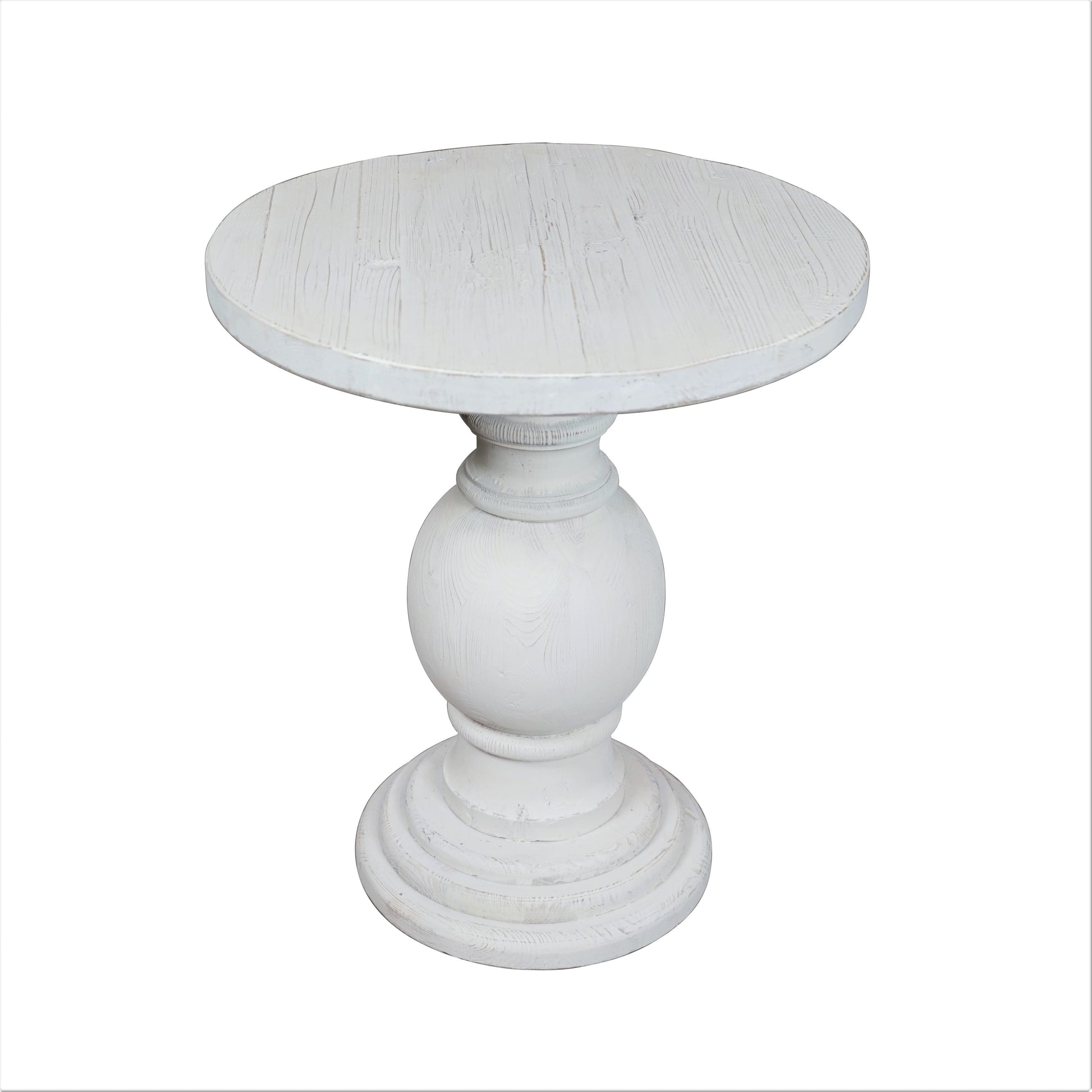 Sturdy side table made of reclaimed solid pine has a turned wood base and thick wood plank top. Reclaimed pine, by nature, is apt to have knots and imperfections adding charm and character and should be expected with this item.