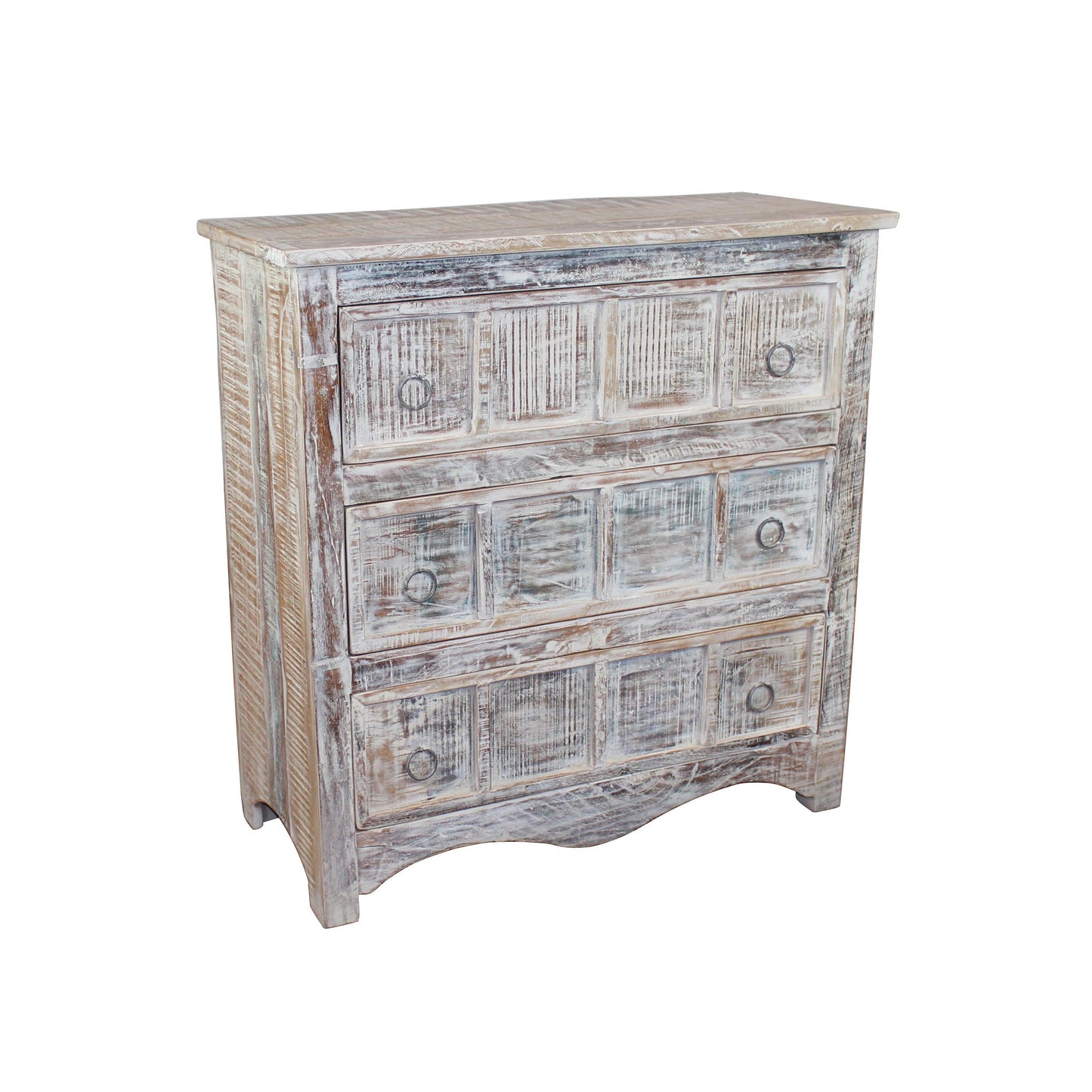 Three drawer chest made of solid reclaimed mango wood. White wash finish with undertones of gray, blue and natural which will vary from piece to piece. Iron handles in soft gray patina.