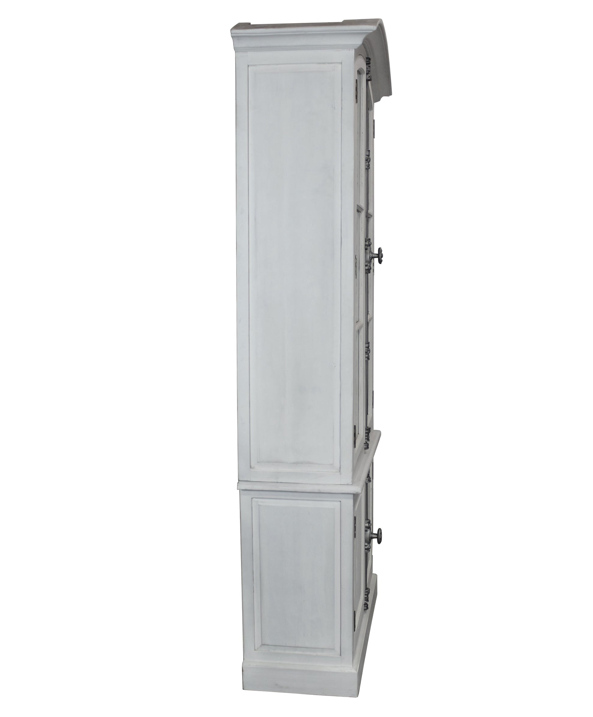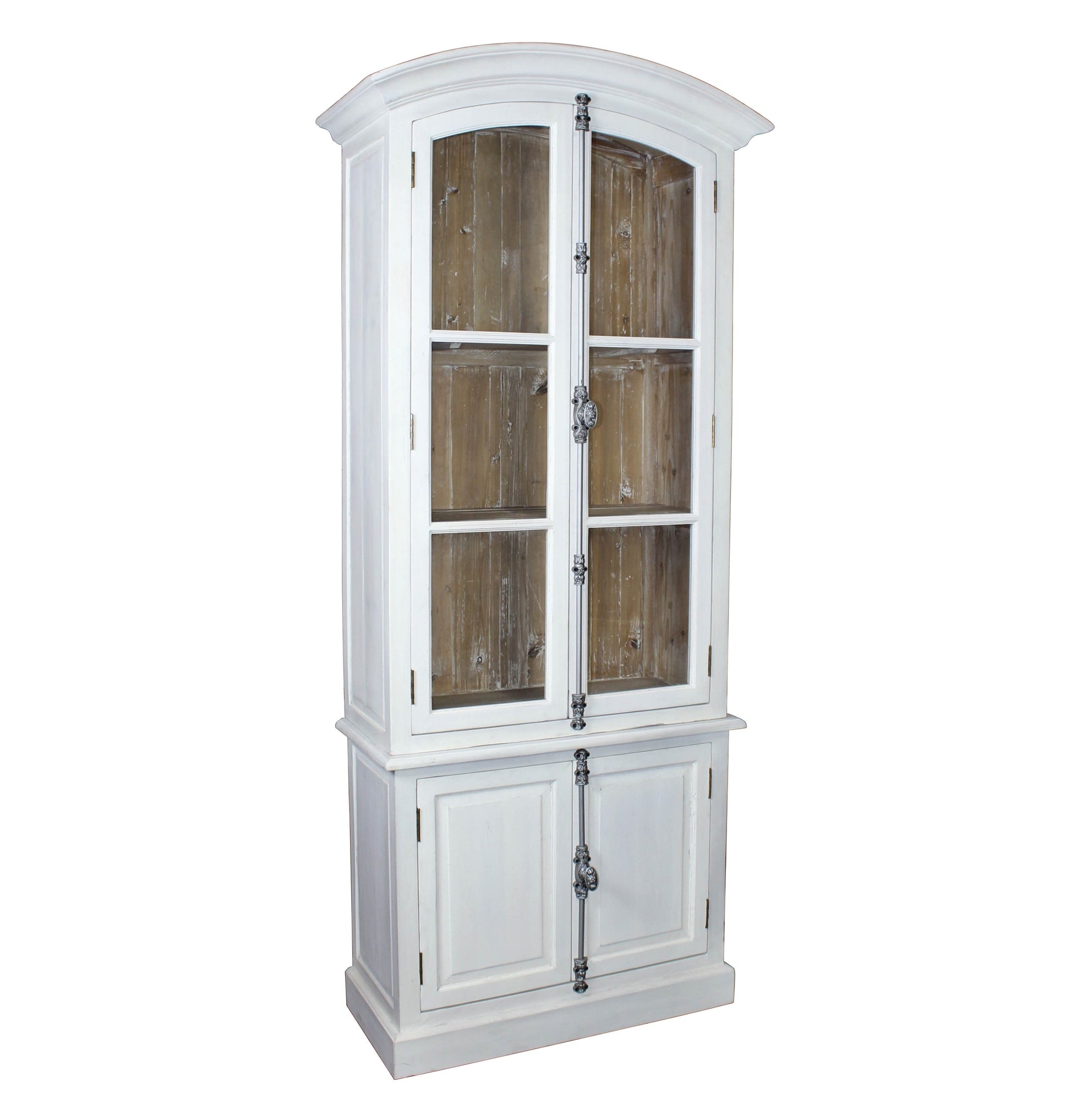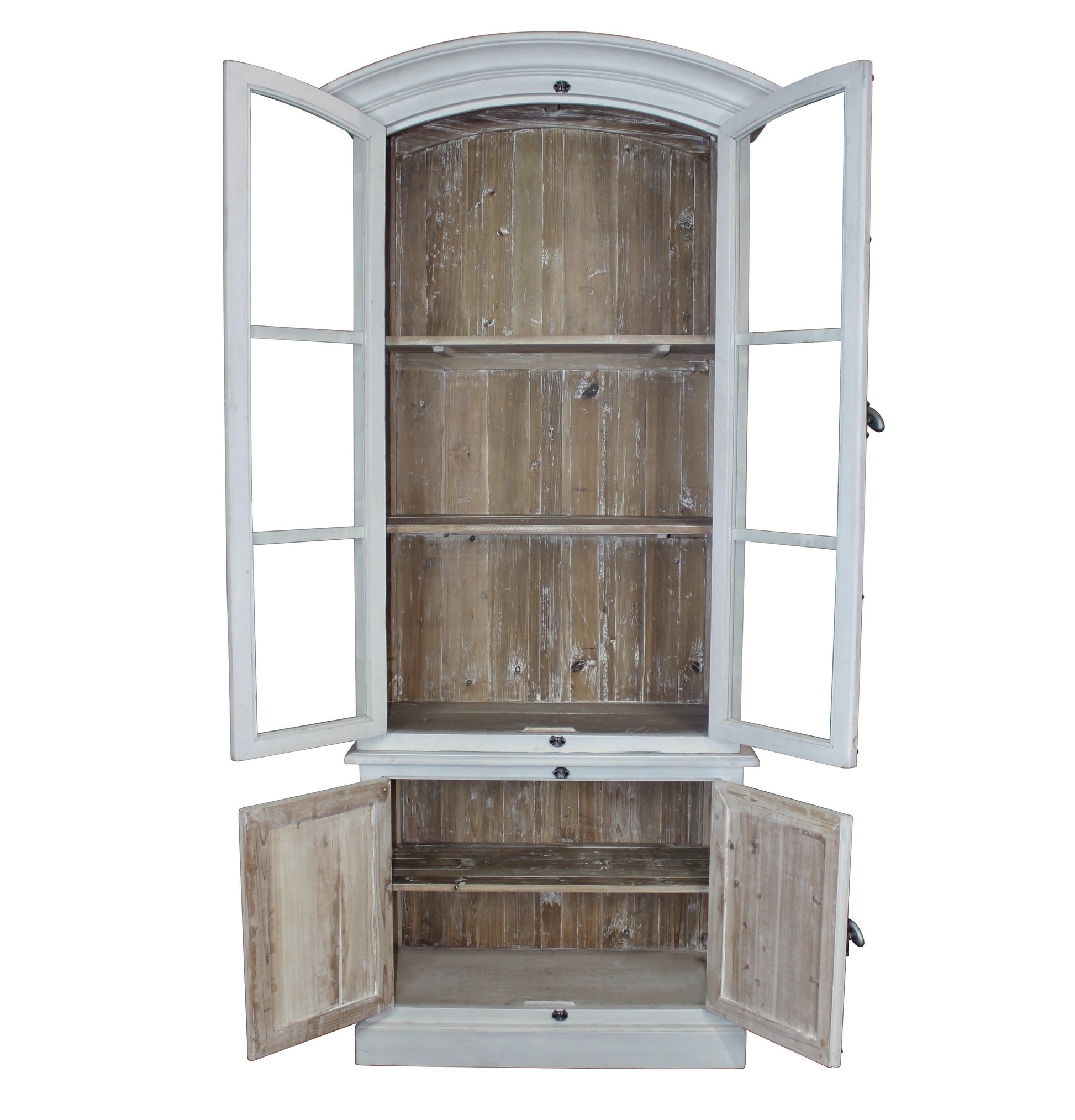 The Ellerie Vitrine is two separate pieces made of reclaimed solid pine with a white hand-painted exterior and bleached pine interior. Fully functioning French style casement hardware on upper and lower doors in antique silver finish. Upper doors have glass and lower doors have wood panels. Two non-adjustable shelves above and one below. Will likely have nail holes, knots and other imperfections, adding charm and character.