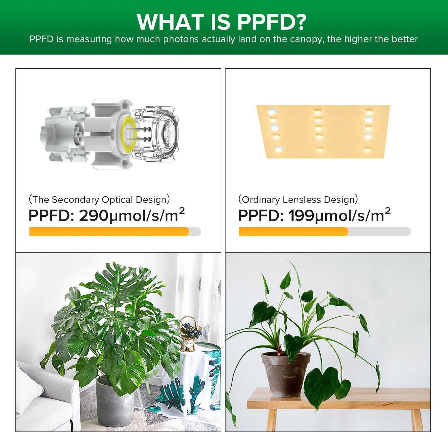 Full Spectrum LED Chips, COC Ceramic Technology, High PPFD 700W equivalent, high light transmission optical lens