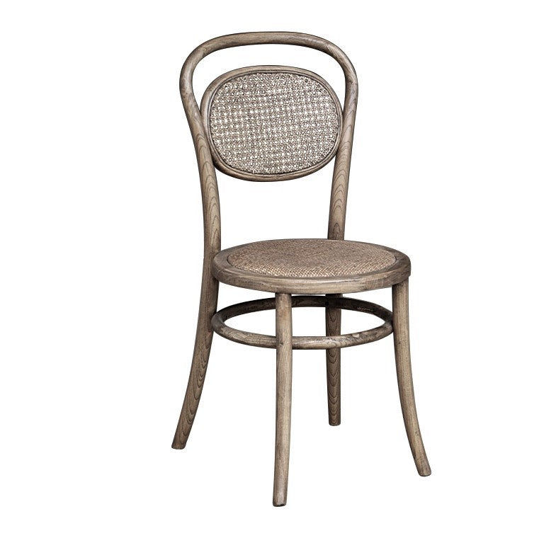 Bentwood dining chair made of oak with a French oak finish. Use as is or may be waxed or painted. Comfortable padded woven rattan seat and oval cane back. Seat measures 16.5"W x 16.5"D