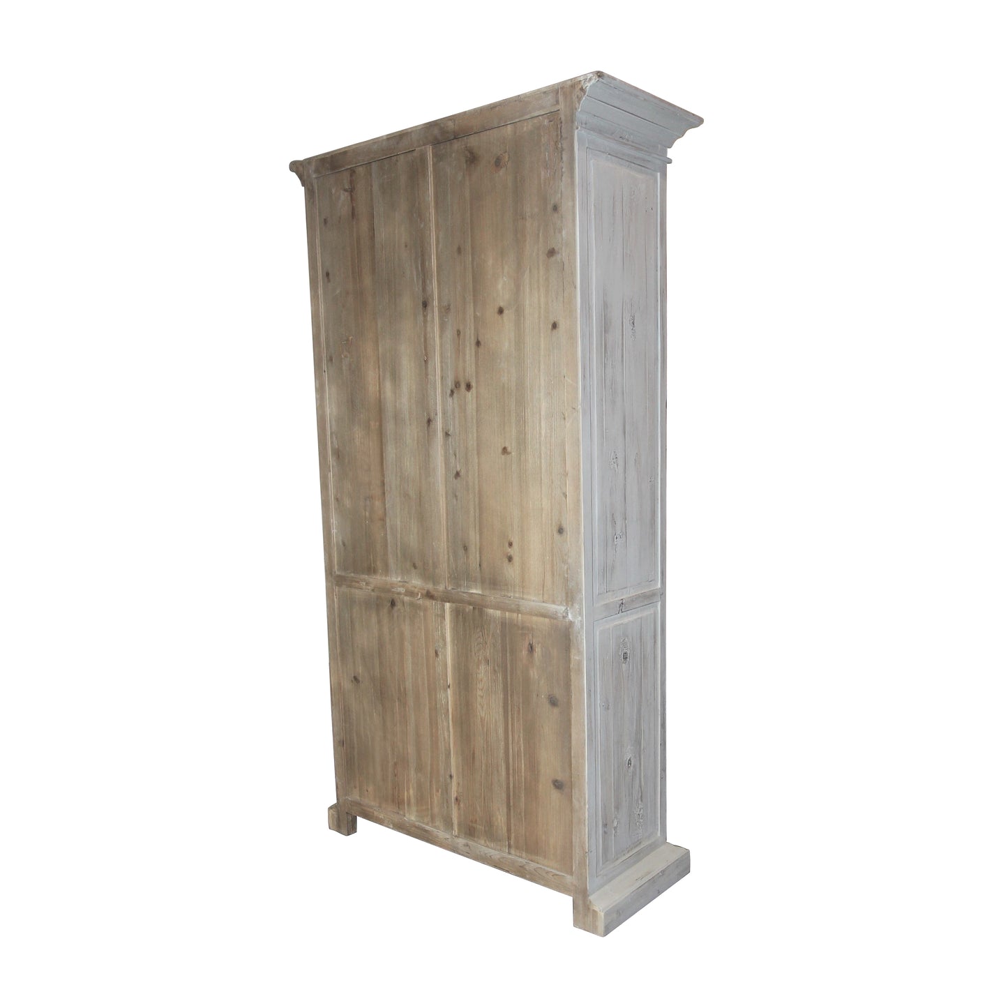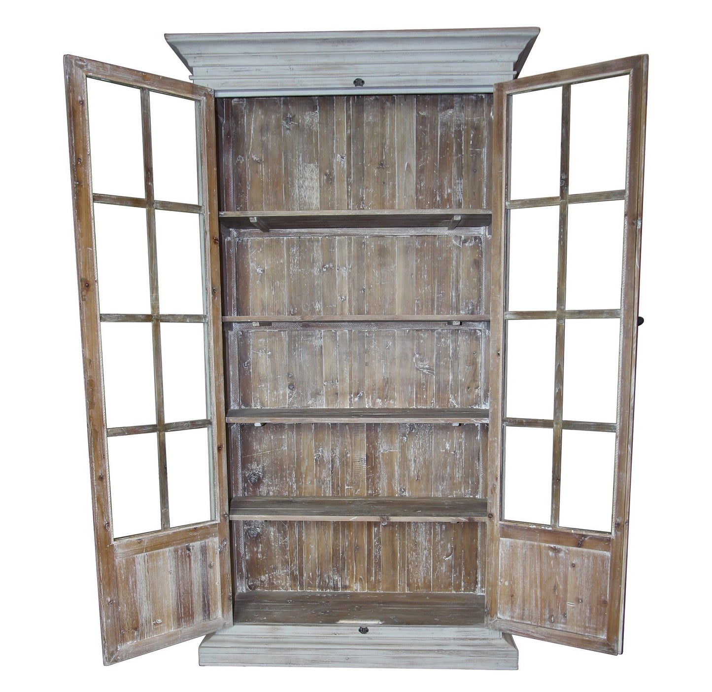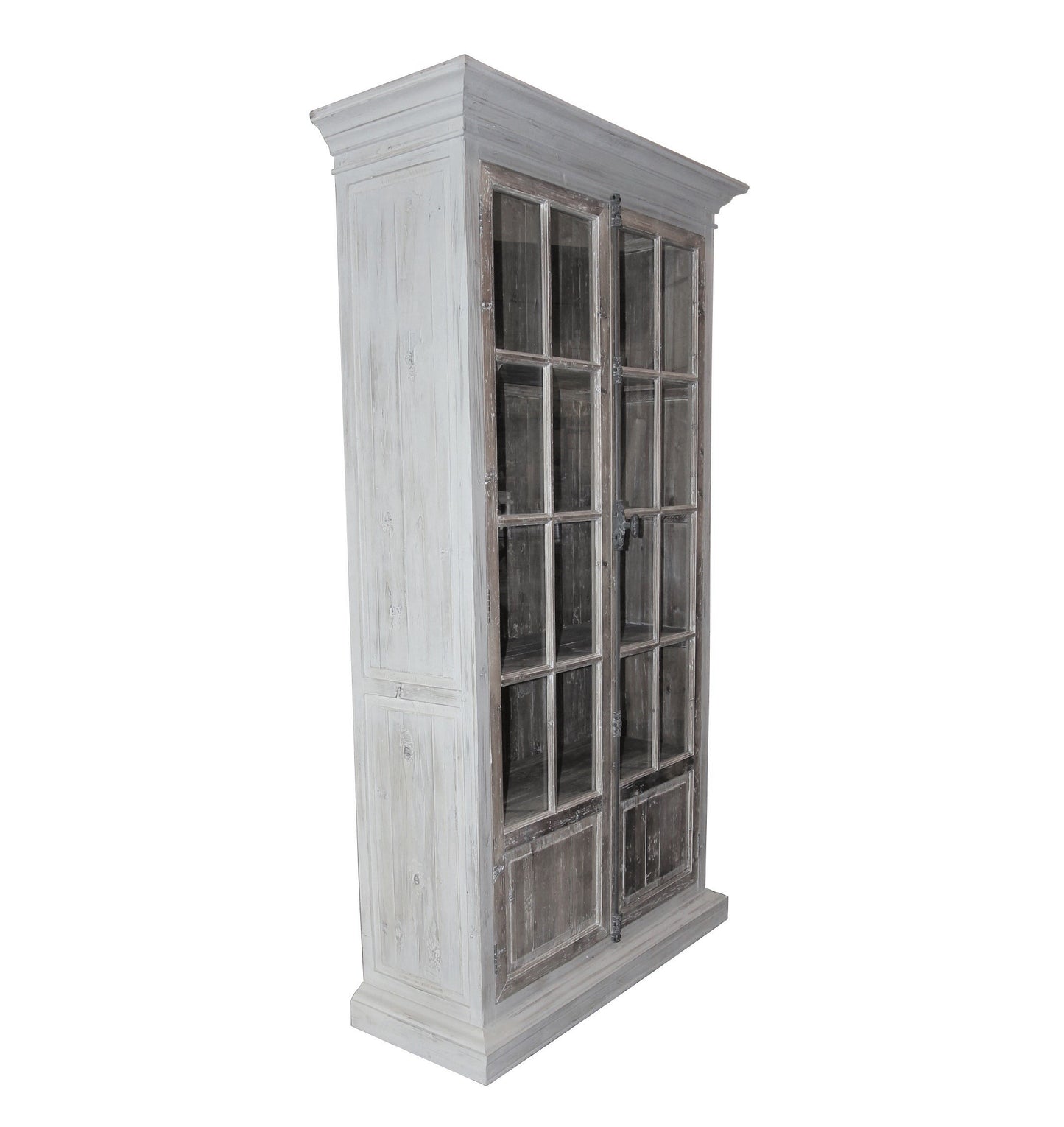 Vitrine made of solid reclaimed pine, inspired by vintage French doors. The exterior has a painted finish; doors and inside are bleached pine. Each piece is hand-finished and due to the bleaching process no two are exactly alike. Four non-adjustable shelves behind two glass front doors. Fully functioning French casement style iron hardware. Inside shelves measure 41"W x 13"D and are 14" apart. Reclaimed pine will, by nature, likely have nail holes, cracks, knots and other imperfections adding charm and character.