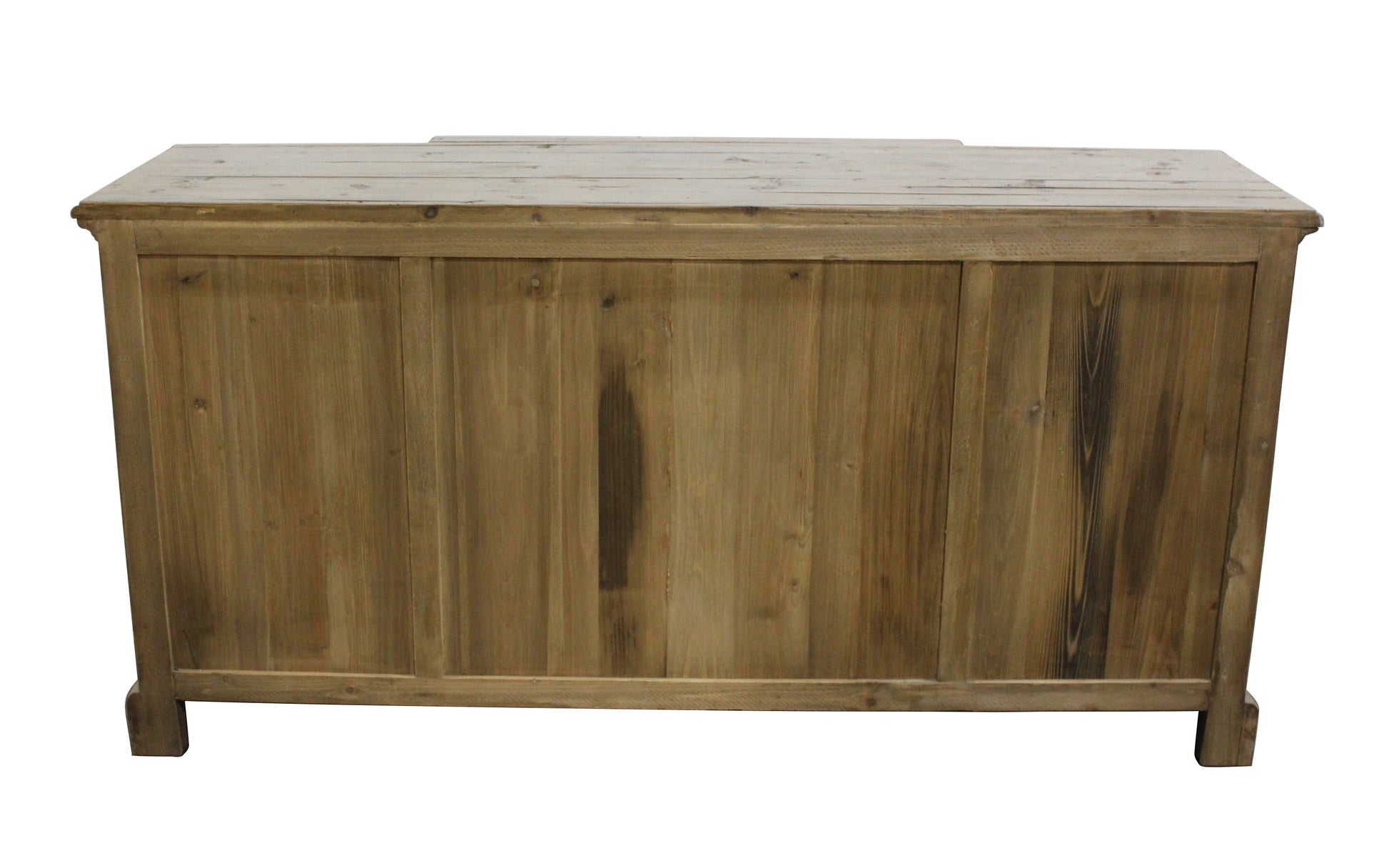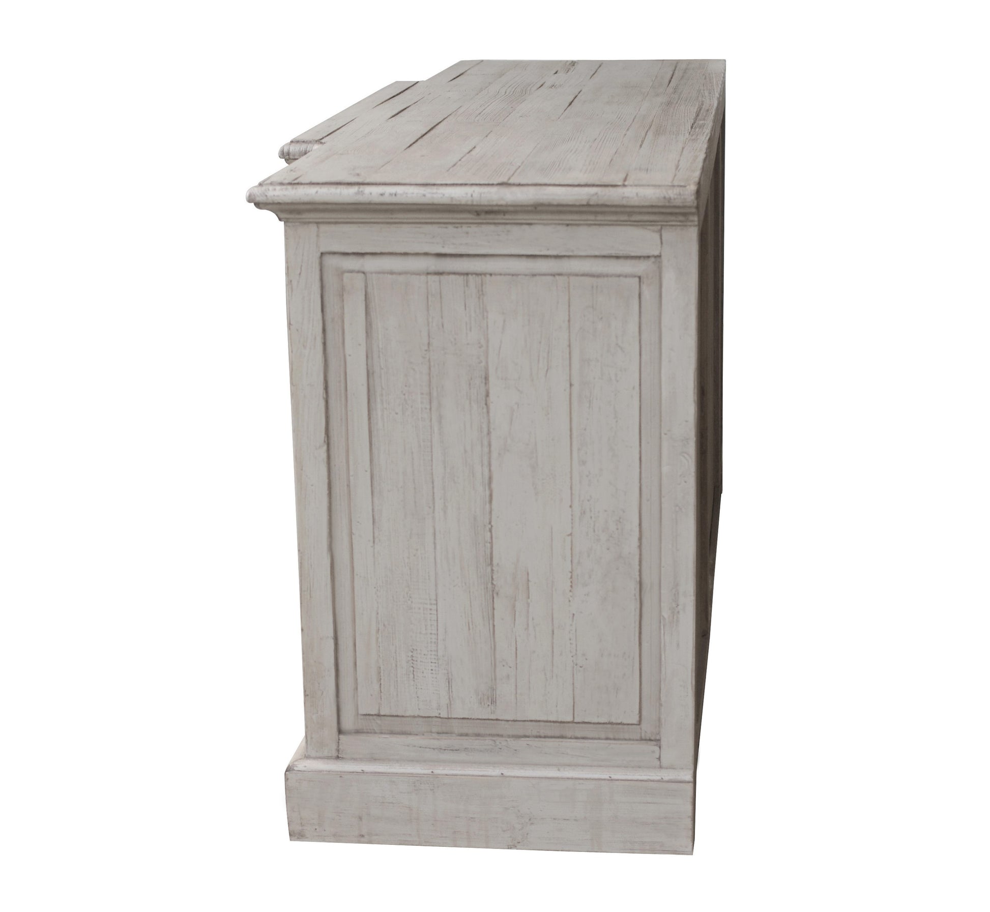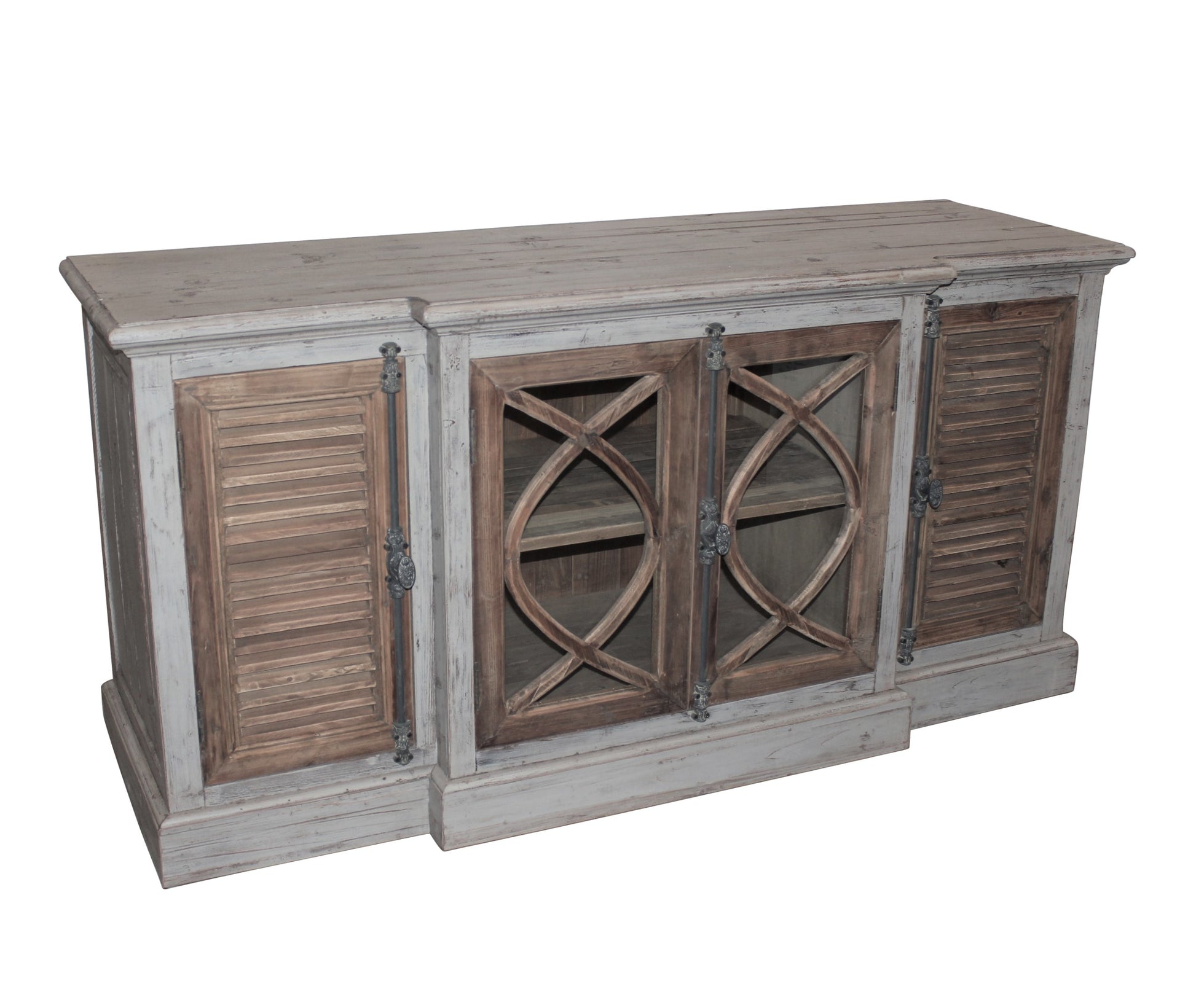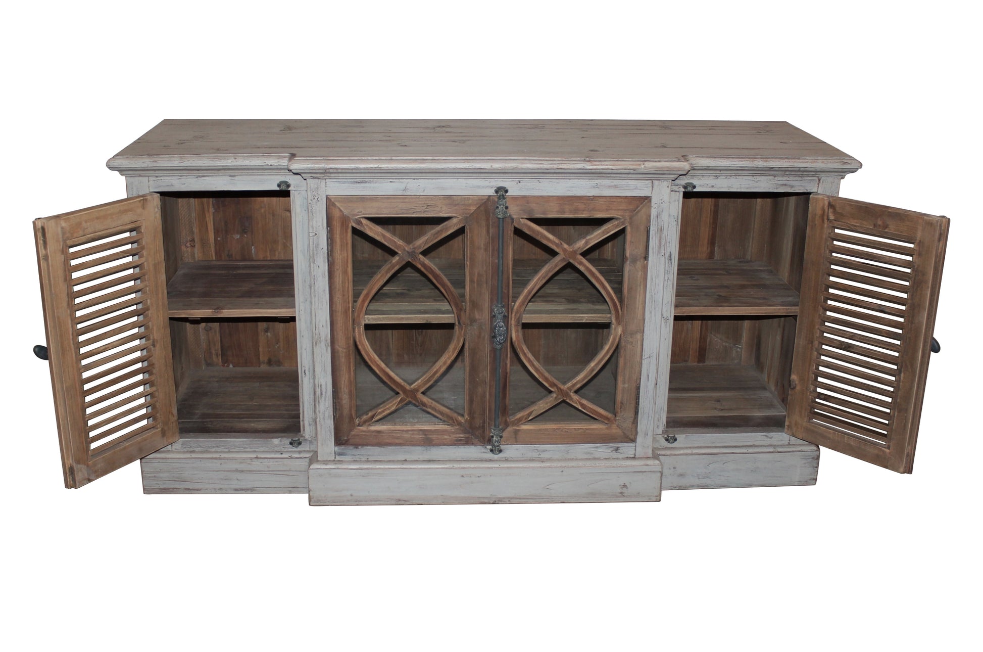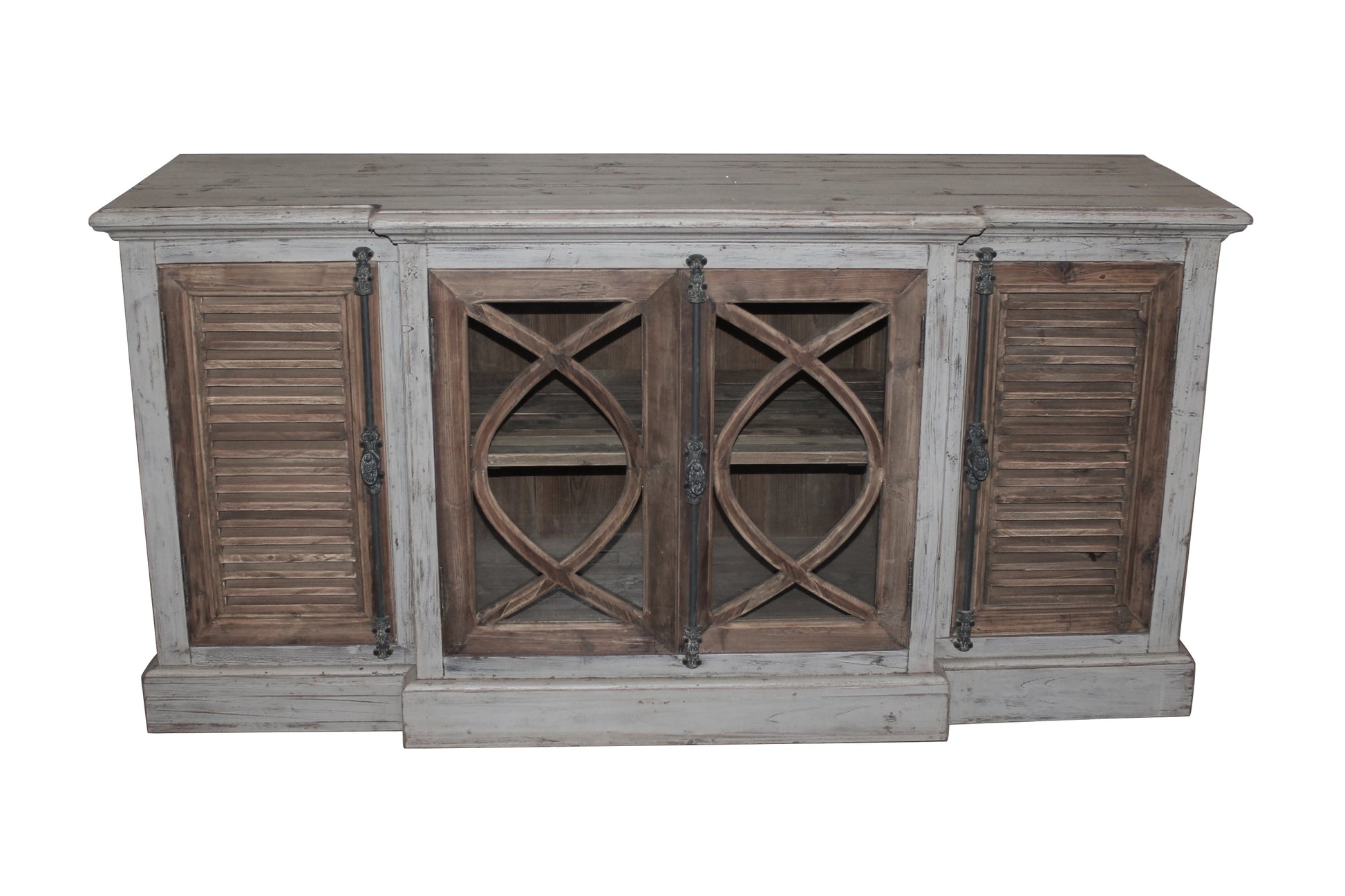 Multi purpose console for any room in the home or office. Made of solid reclaimed pine with gray hand-painted finish accented with natural pine. Four doors with French casement style iron hardware. One non-adjustable shelf behind each door (two middle doors have glass fronts). Will likely have nail holes, knots and other imperfections, adding charm and character.