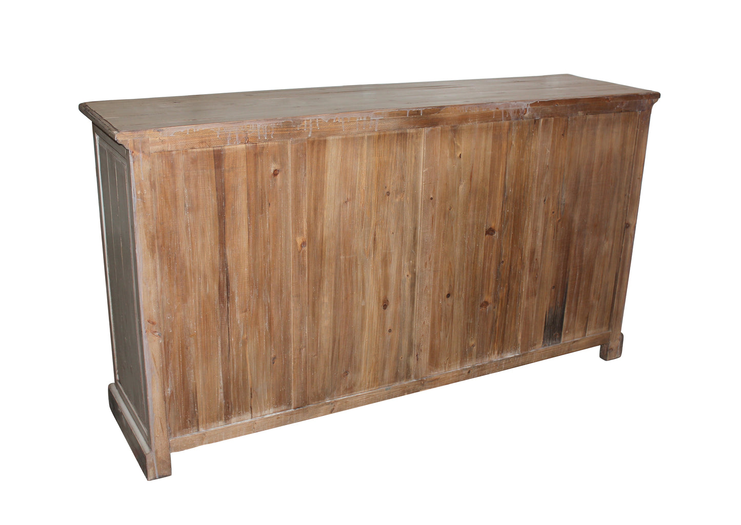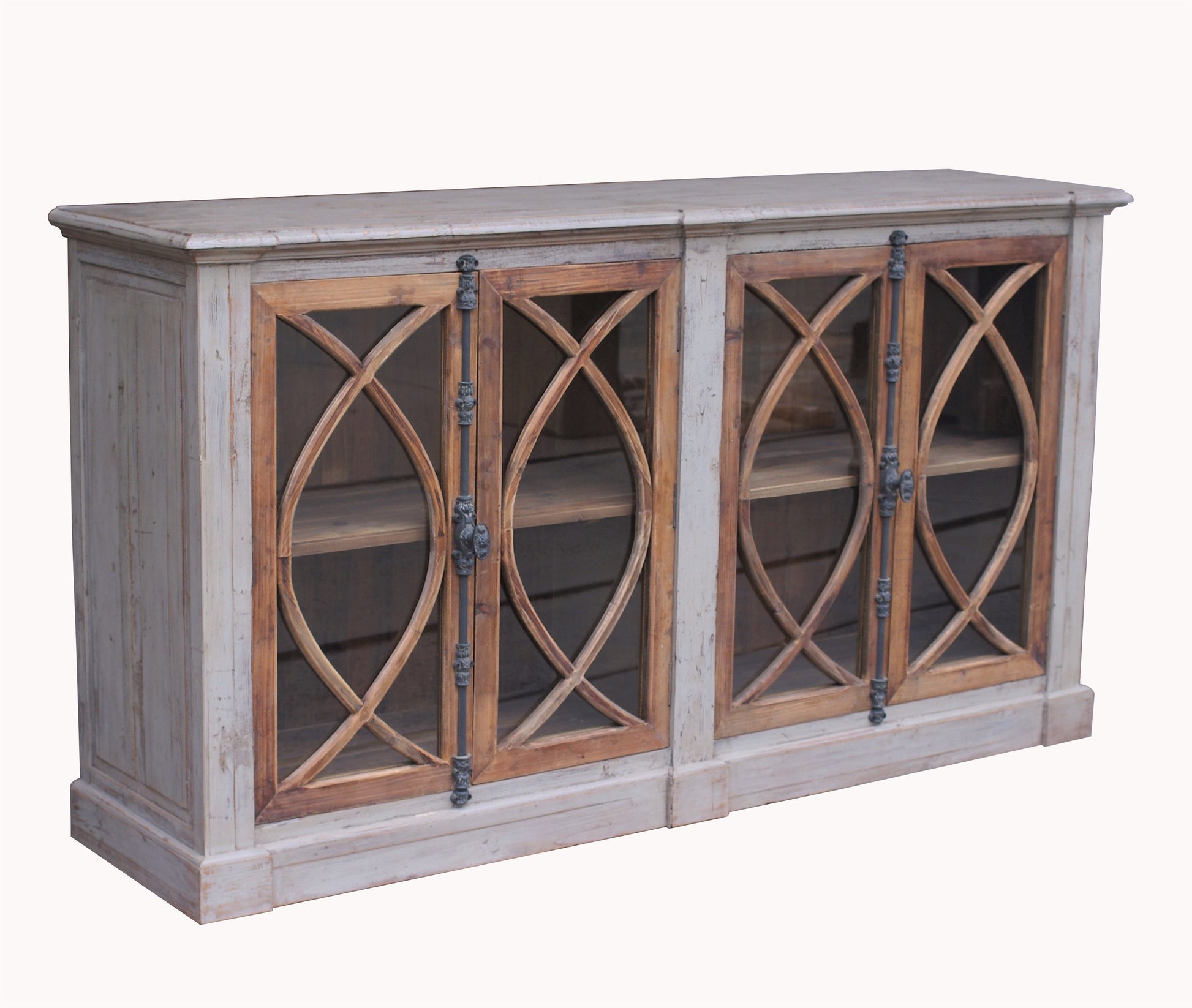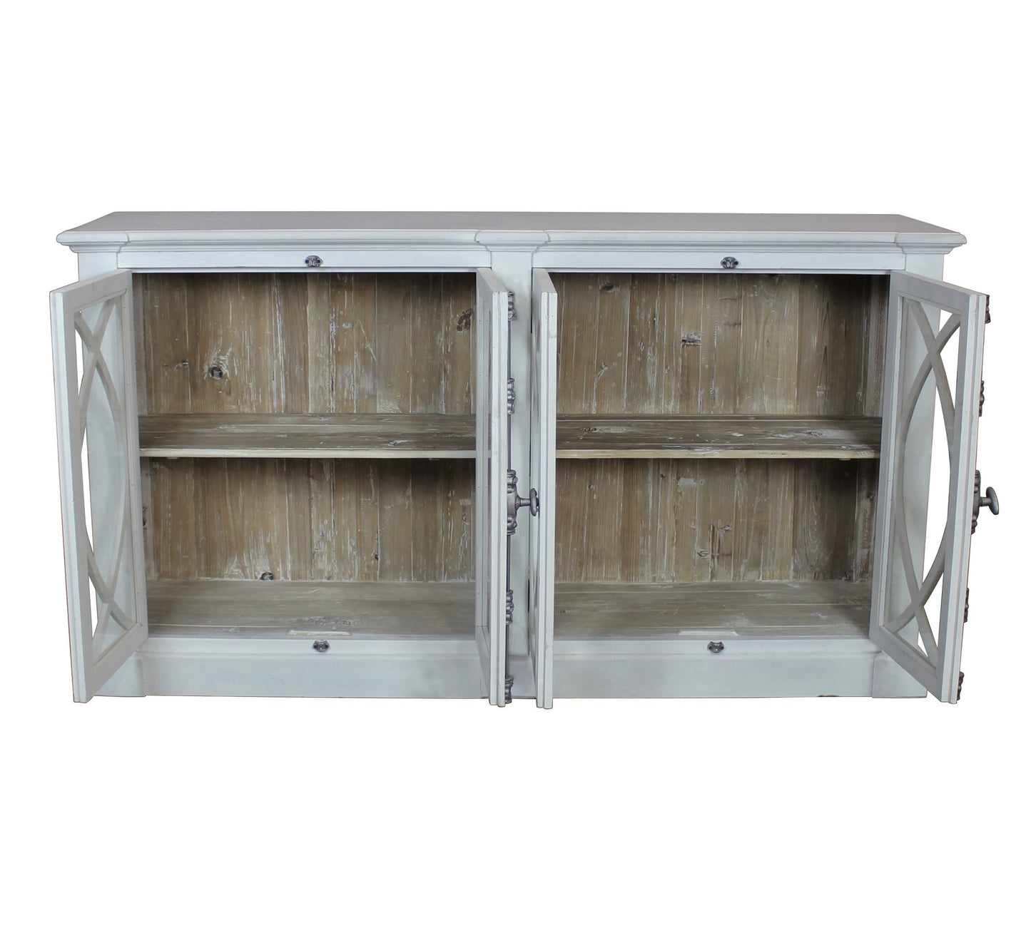 Sideboard made of solid reclaimed pine goes with any decor from modern rustic to classic and everything inbetween. Two pairs of doors with glass and French casement style iron hardware in a lightly distressed gray finish. One non-adjustable shelf. Will likely have nail holes, knots, and other imperfections, adding charm and character.