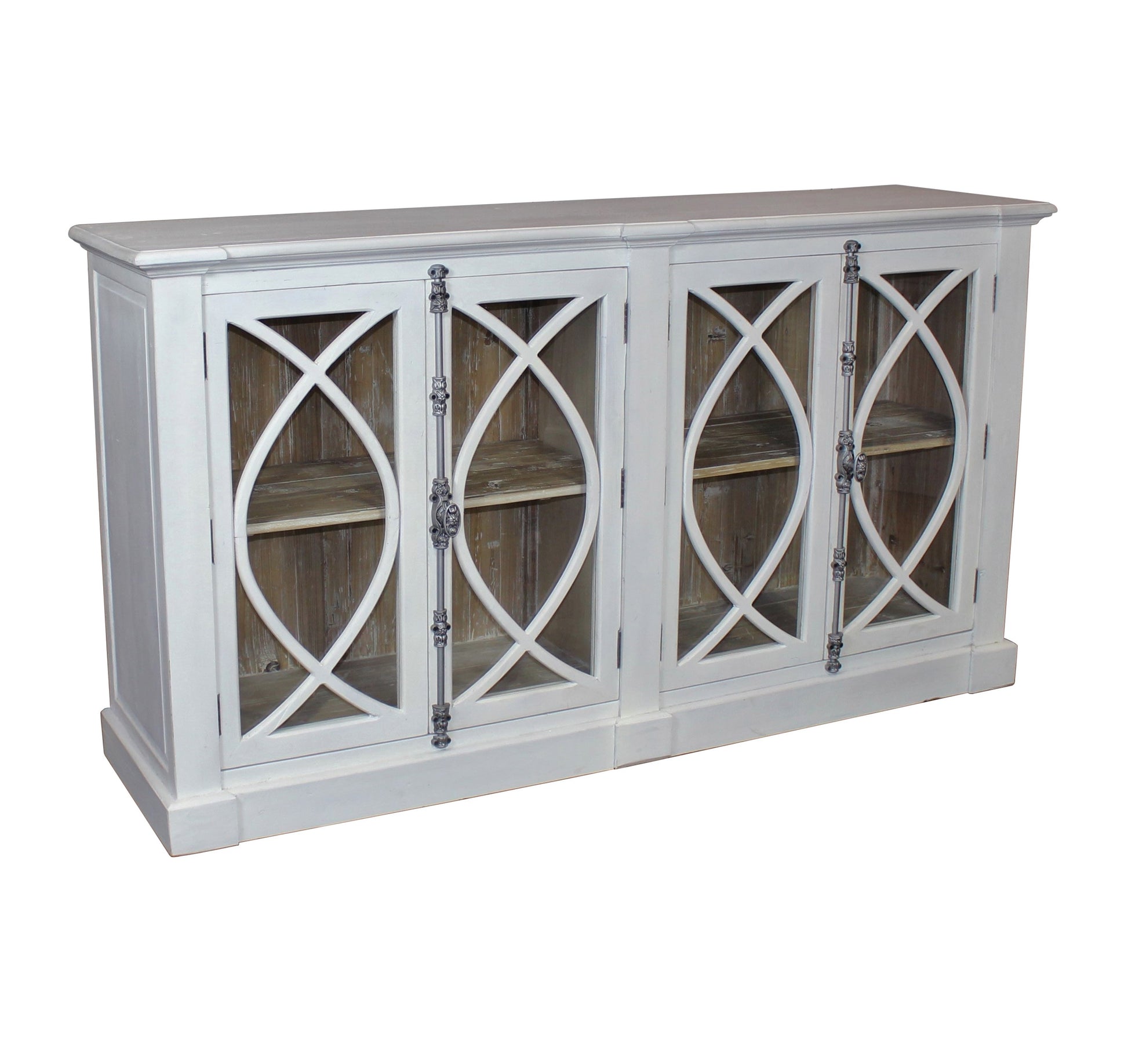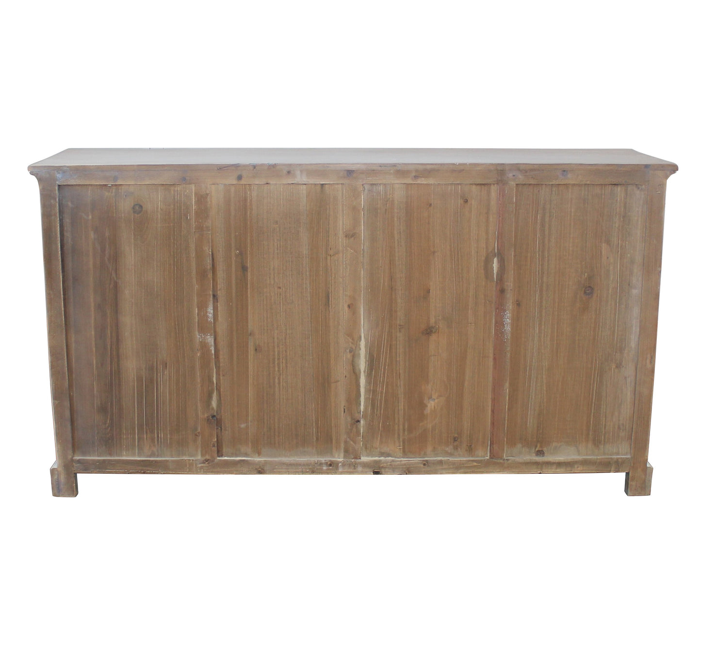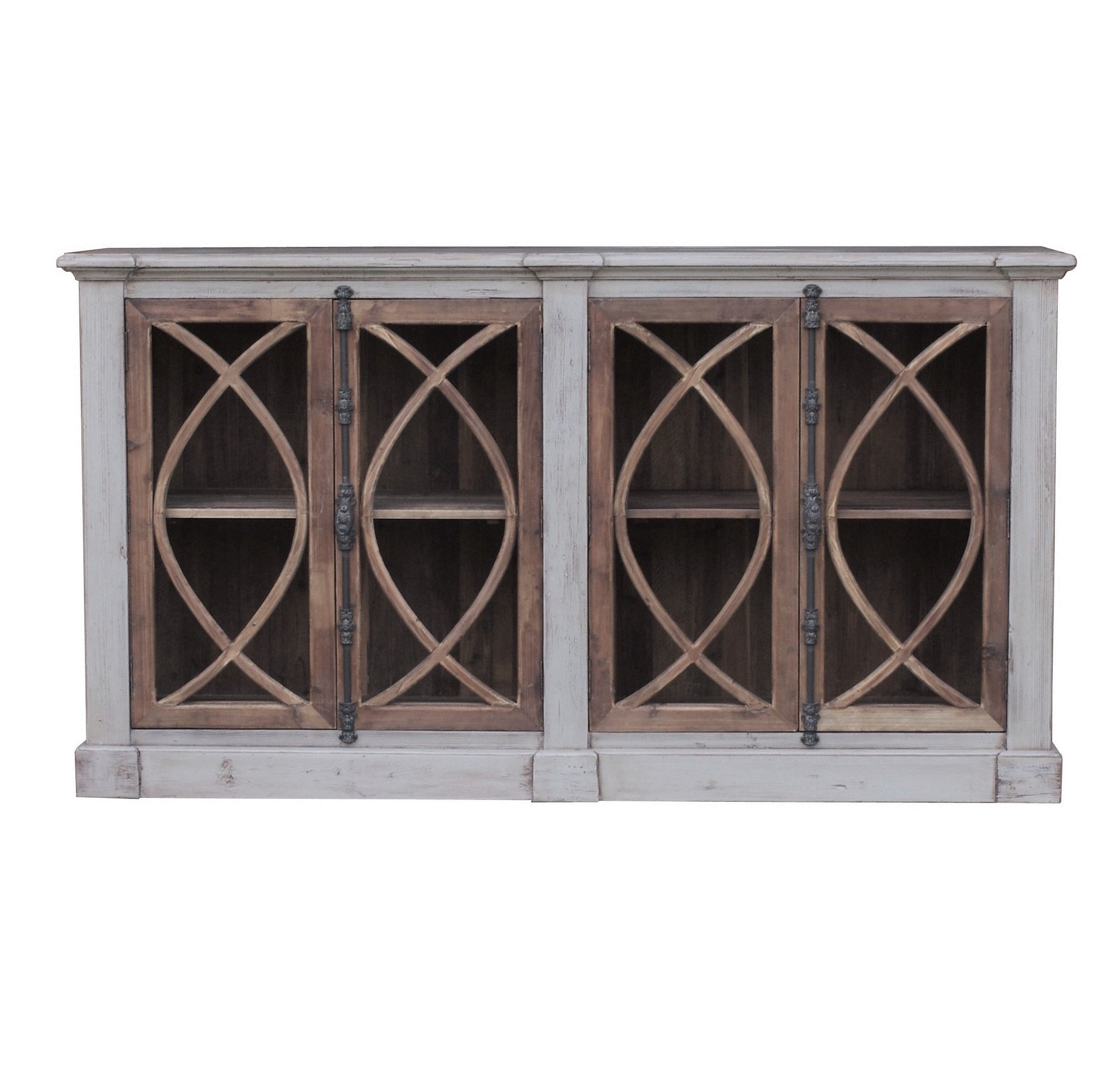 Sideboard made of solid reclaimed pine goes with any decor from modern rustic to classic and everything inbetween. Two pairs of doors with glass and French casement style iron hardware in a lightly distressed gray finish. One non-adjustable shelf. Will likely have nail holes, knots, and other imperfections, adding charm and character.