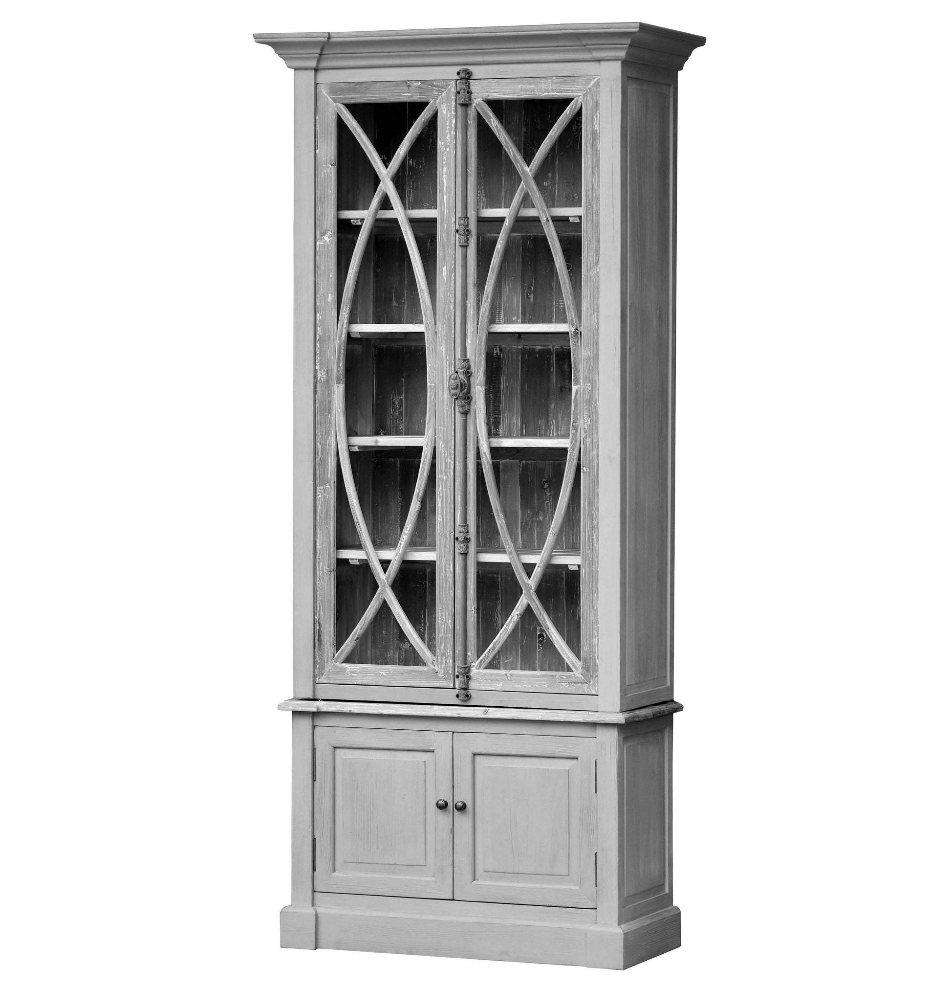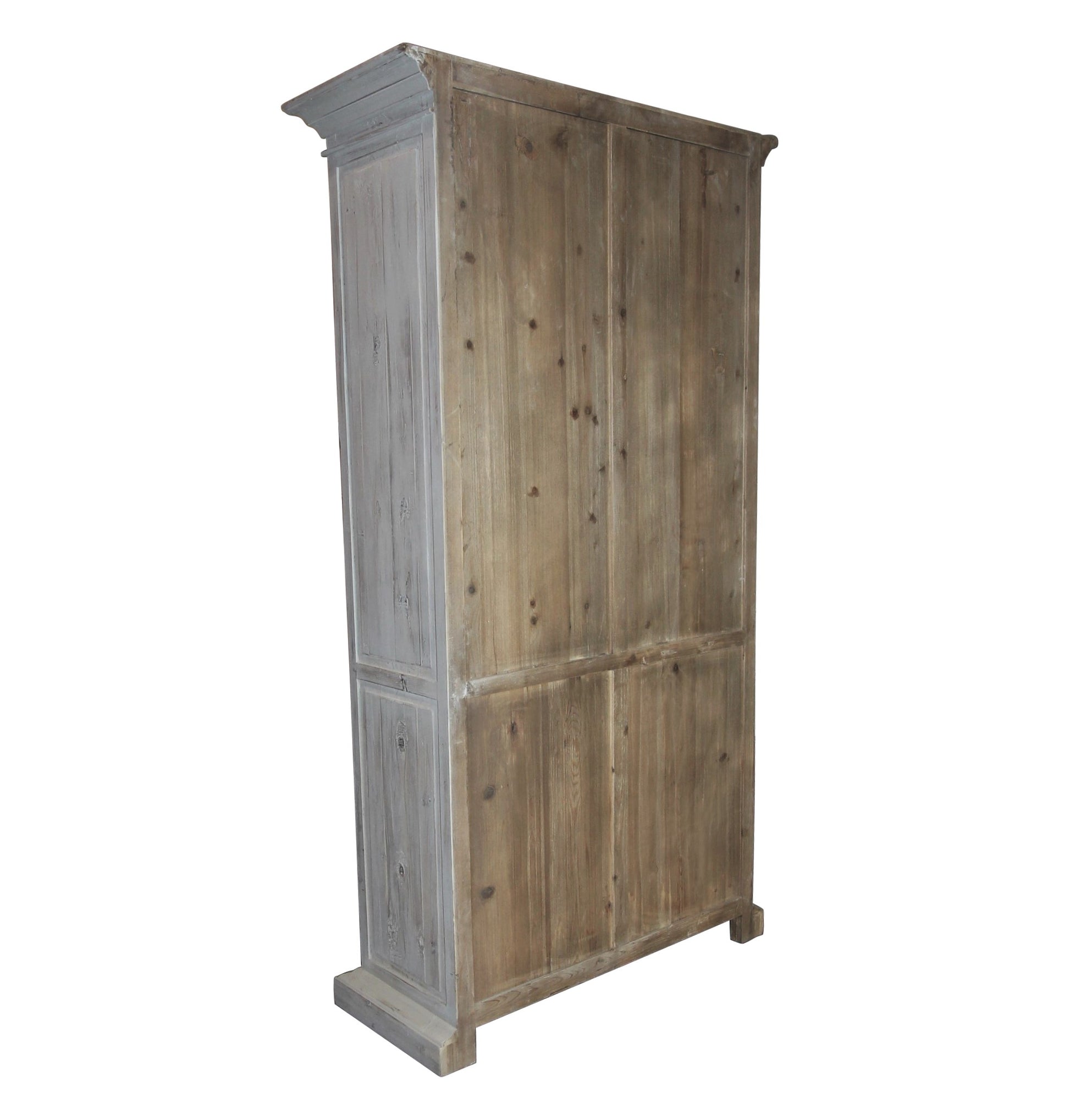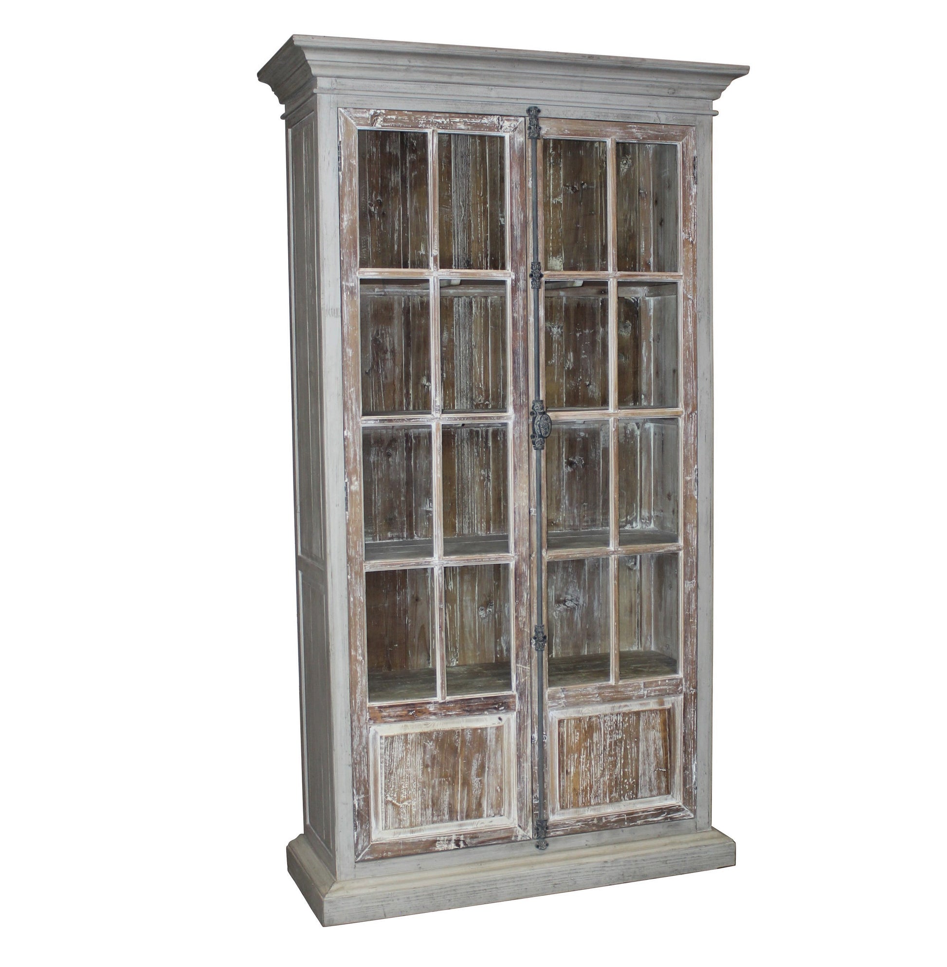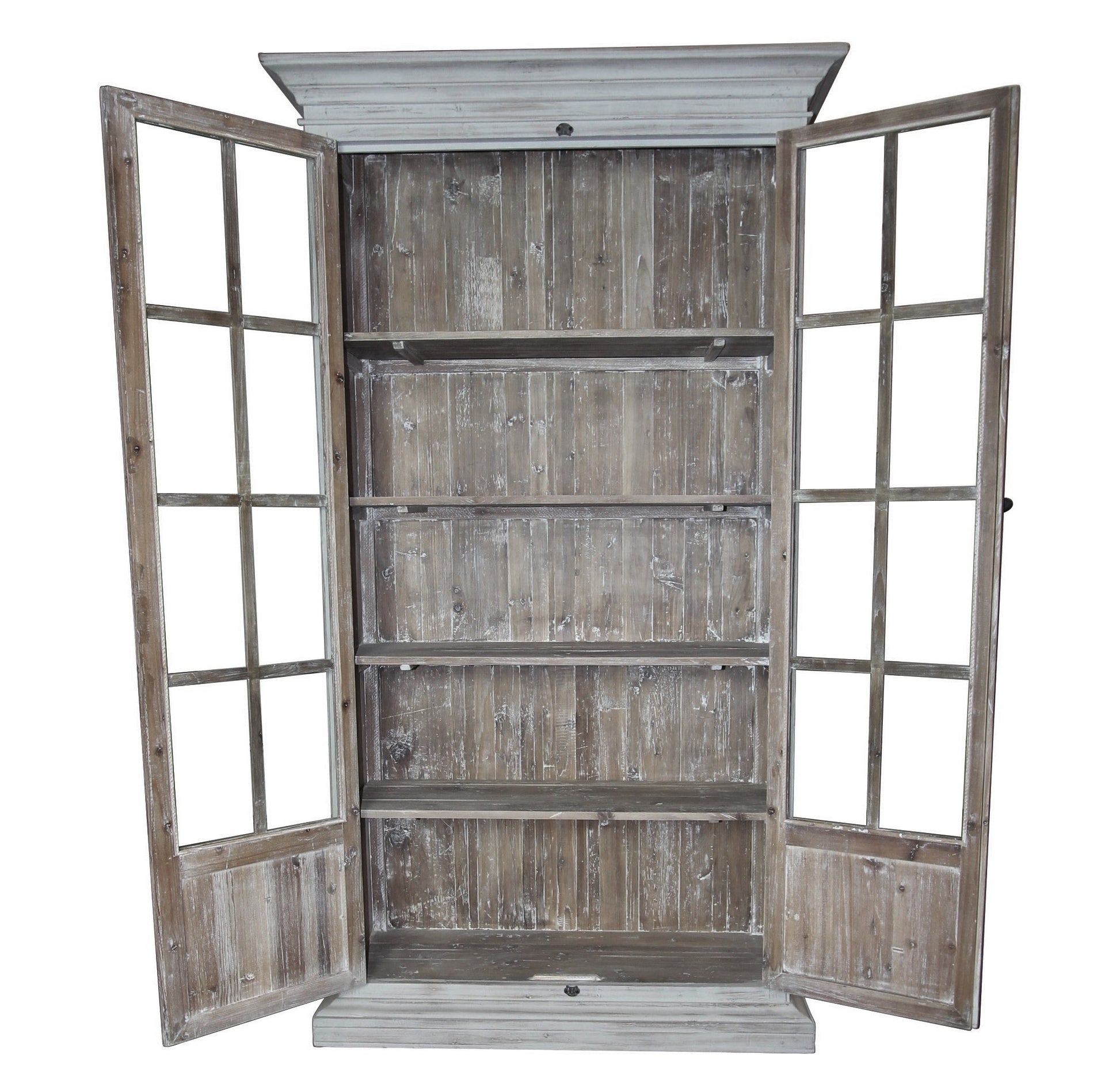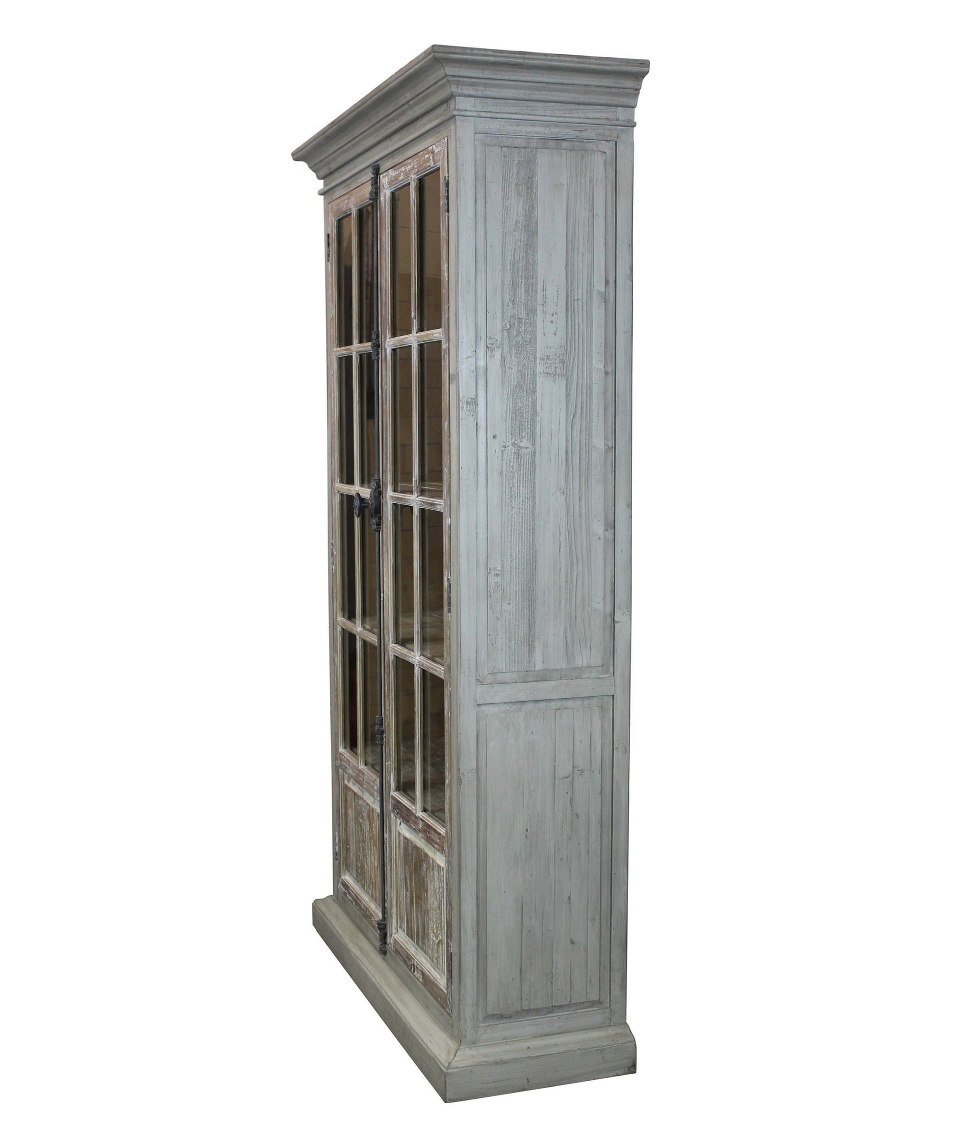 China cabinet made of solid reclaimed pine comes in two pieces (top and bottom) for easy transporting. Two doors with glass have French casement style hardware in a lightly distressed gray finish. Four non-adjustable shelves above and one below. Shelves measure 32"W x 12" D with 10" between shelves. Will likely have nail holes and other imperfections, adding charm and character.