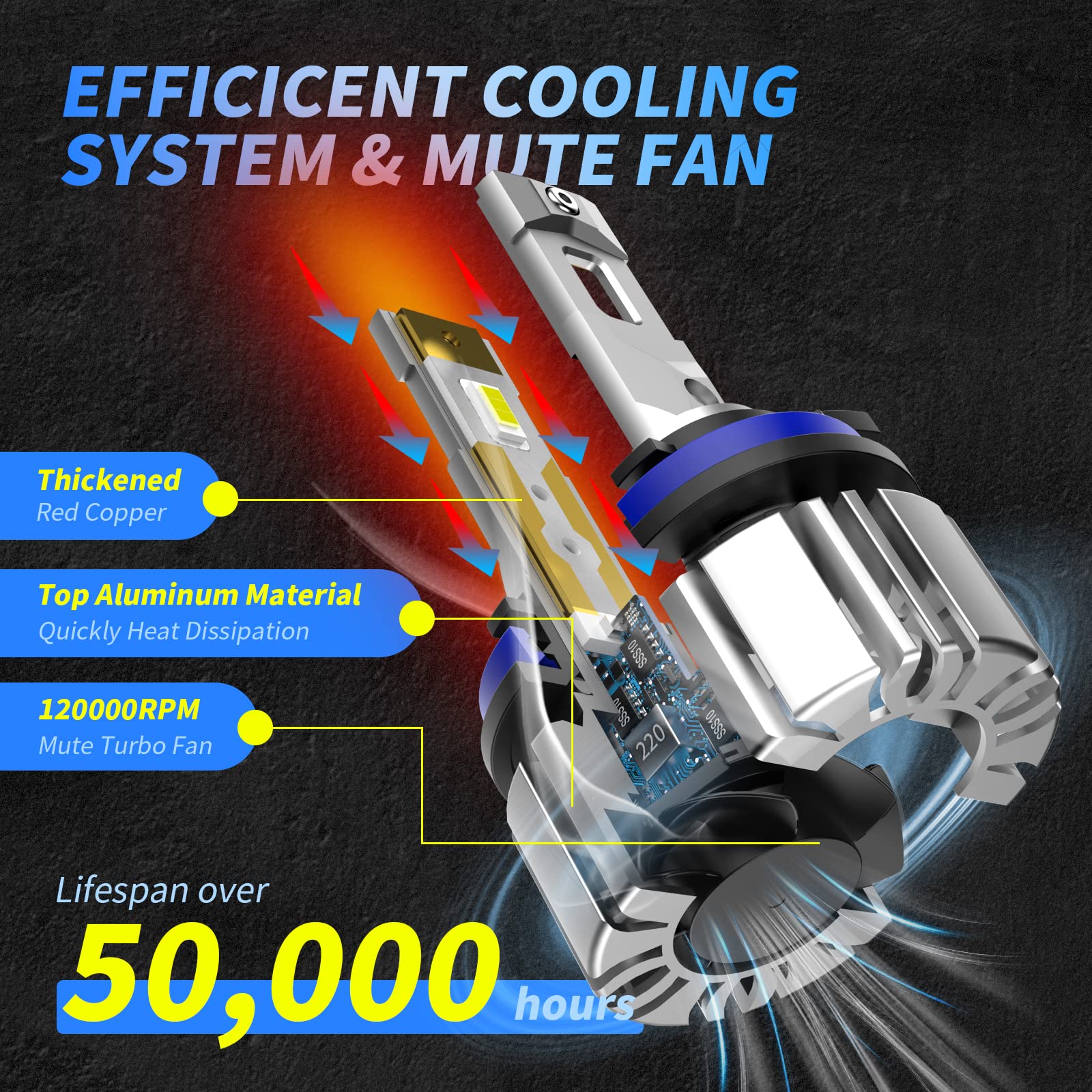 Top aluminum material body and built-in 12000RPM mute turbofan with unique hollow carving heat sink design provide efficient cooling ability. which ensures our H11 9005 LED headlight bulbs last more than 50,000+ hours, reducing replacements and saving your money.