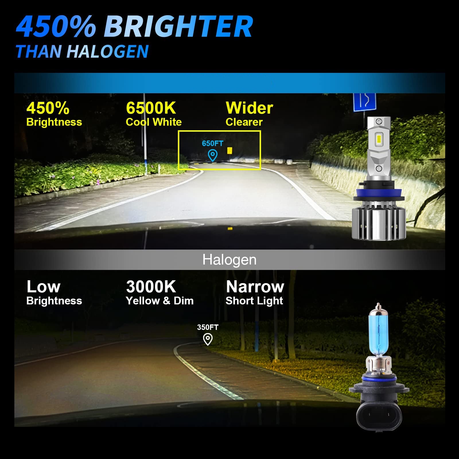 - 14000 Lumen, 6500K cool white light, 450% brightness compared to stock halogens, and provides 200% vision than halogen, bringing you the best experience on the road.
