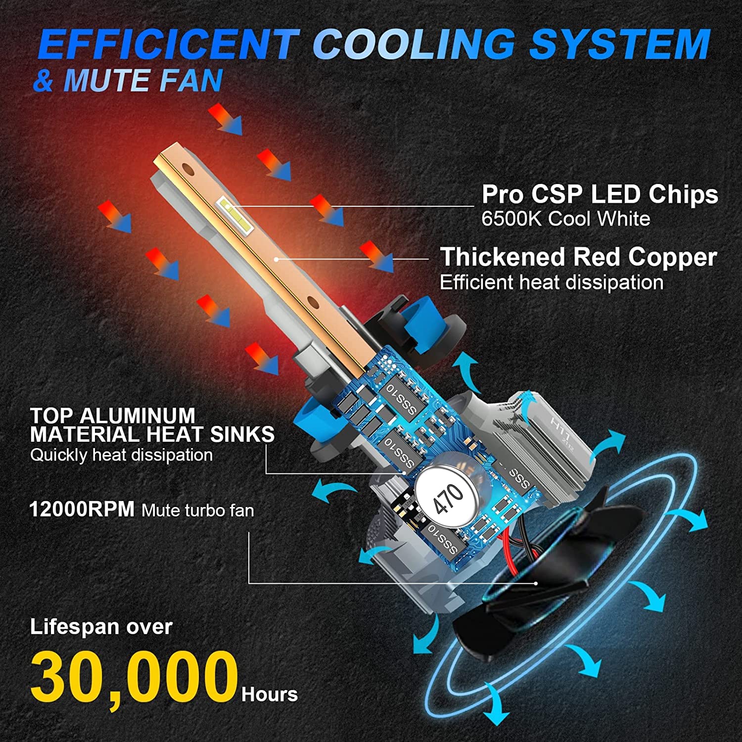 Top aluminum material body and built-in 12000RPM mute turbofan with unique hollow carving heat sink design provide efficient cooling ability. which ensures this 9005/HB3 9006/HB4 headlight bulbs last more than 30,000+ hours, reducing replacements and saving your money.