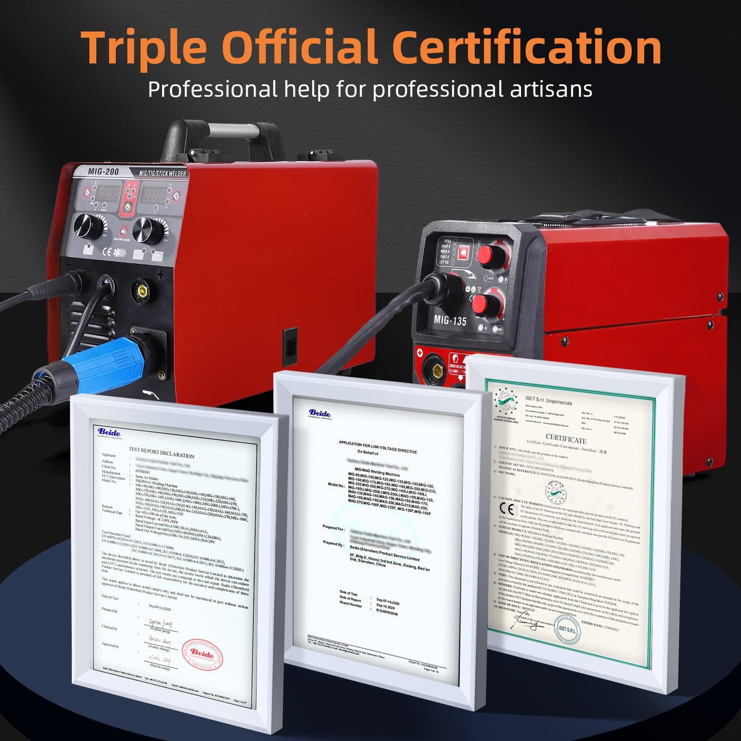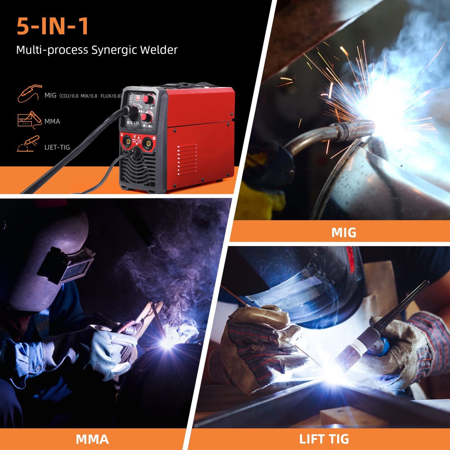 Included Components | 5ft Earth clamp*1, 5.3ft Electrode holder*1, 5ft American gas hose*1, 2.2lbs welding wire, Hammer &Brush*1, Hose Clamps*2, 0.035" contact tip*4, Welding Helmet*1, 9.2ft Mig Gun*1, 0.030"contact tip*4, Professional Gloves*1 |