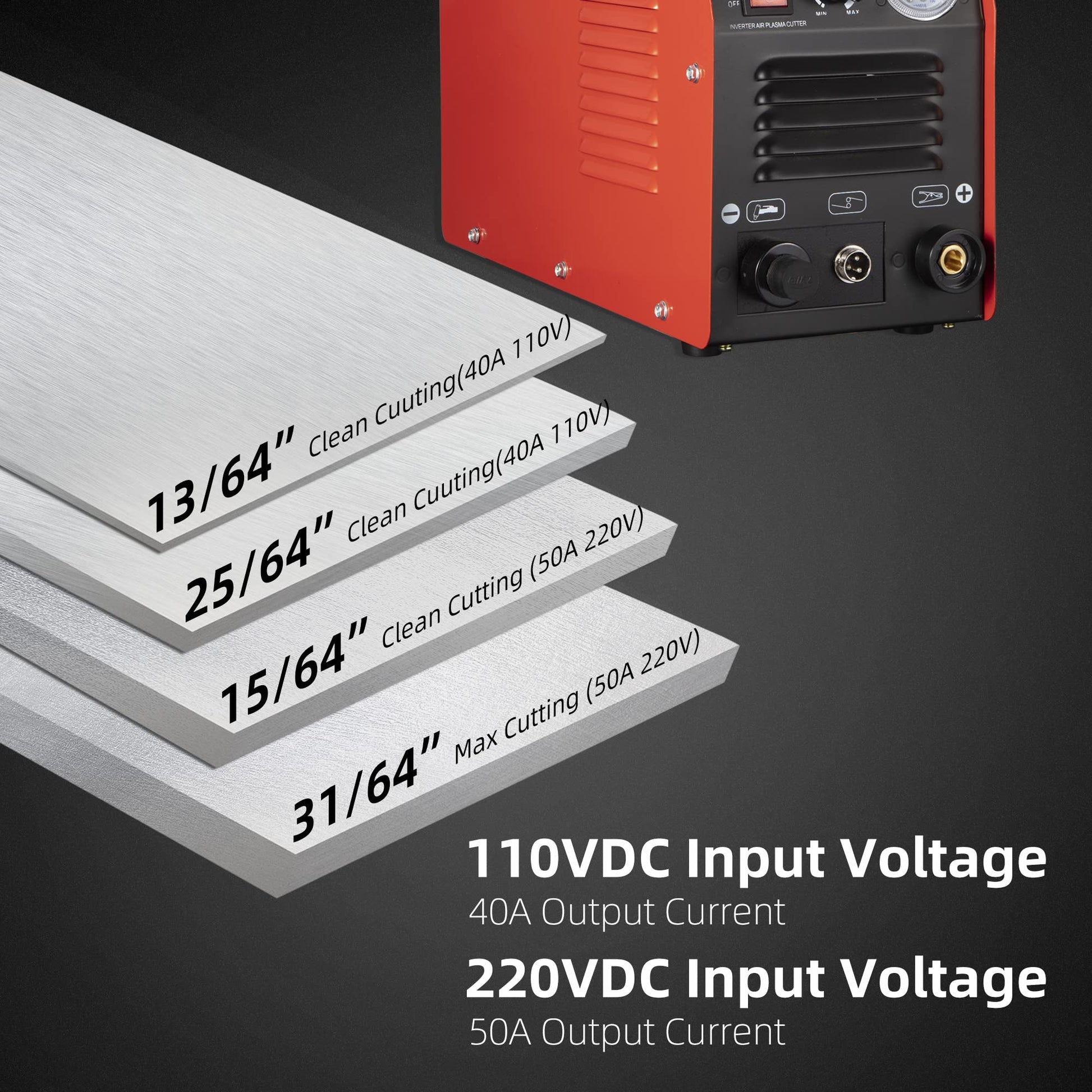 20-50 A output, 2/5" (10mm) ideal clean cuts and 4/7" (14mm) maximum cut thickness under 220V; 10-35 A output, 1/3" (8mm) ideal clean cuts and a maximum cut thickness of 2/5" (10mm) under 110V. This plasma cutter suitable for cutting alloy steel, stainless steel, copper, aluminum and other metals.