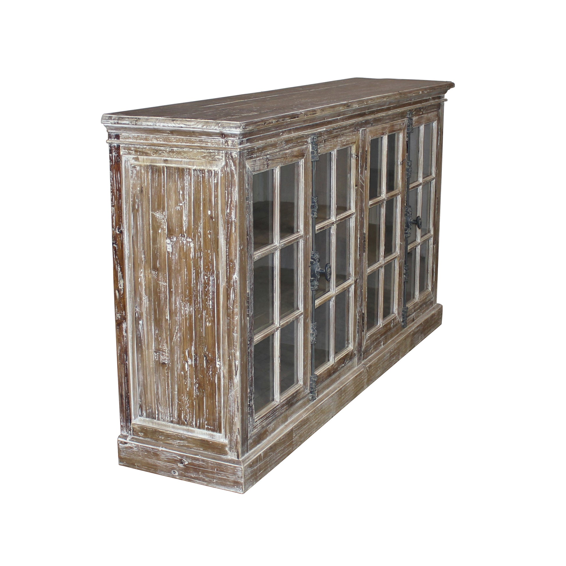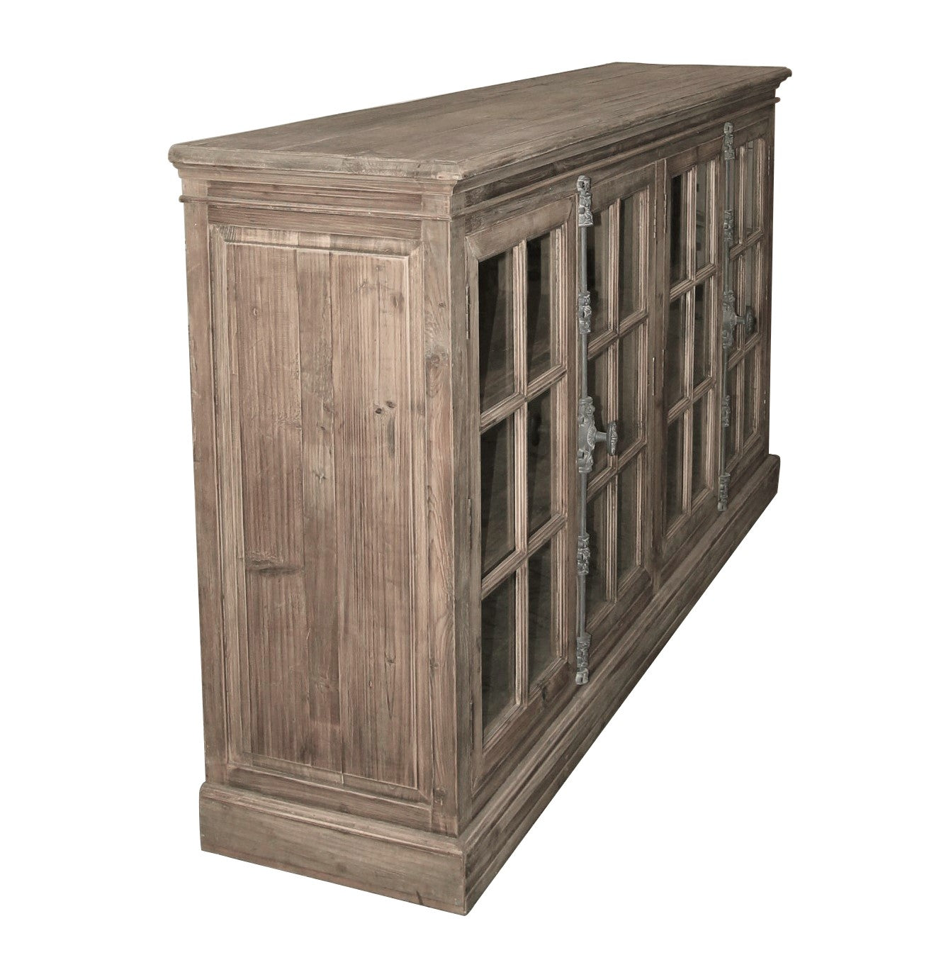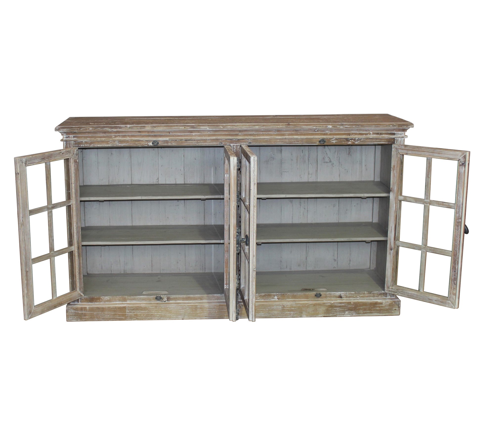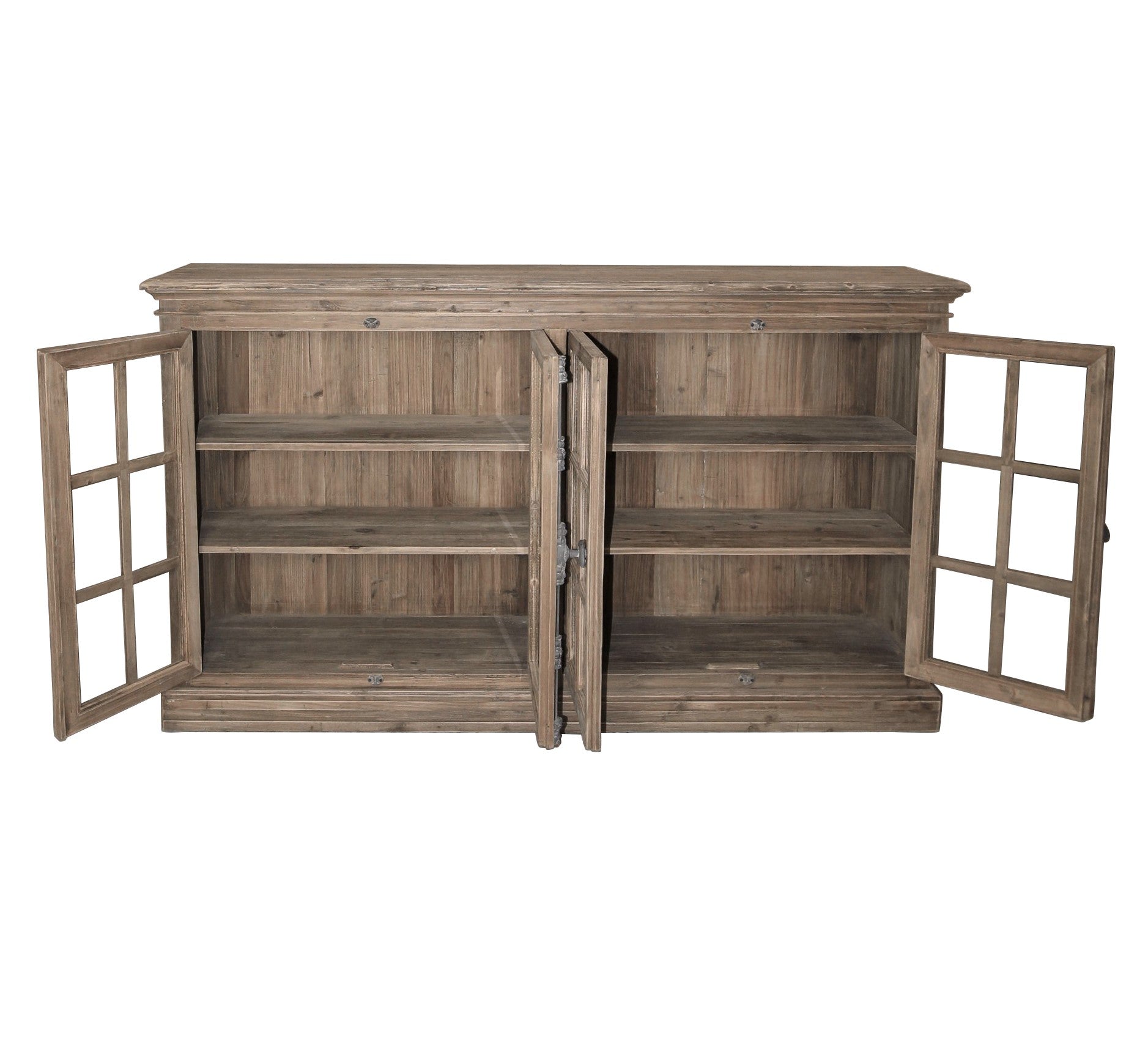 Sideboard made of reclaimed solid pine. Two pairs of doors with glass have French casement style iron hardware in a lightly distressed gray finish. One vertical support wall in the middle. Two non-adjustable shelves on each side are 36"W and 14"D. Will likely have nail holes, knots, and other imperfections, adding charm and character.