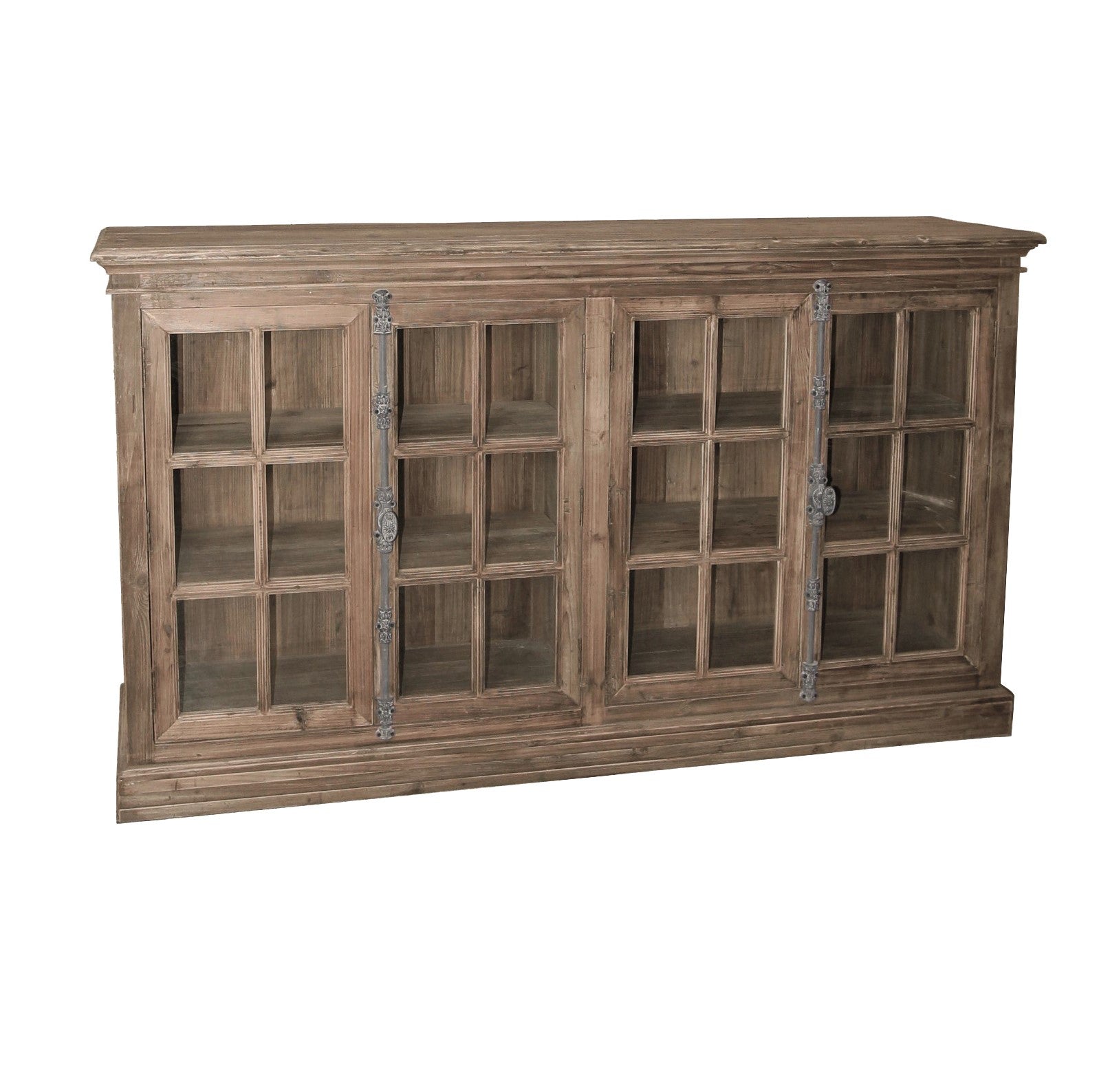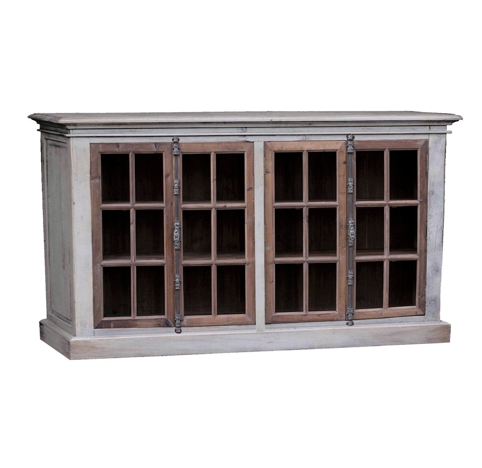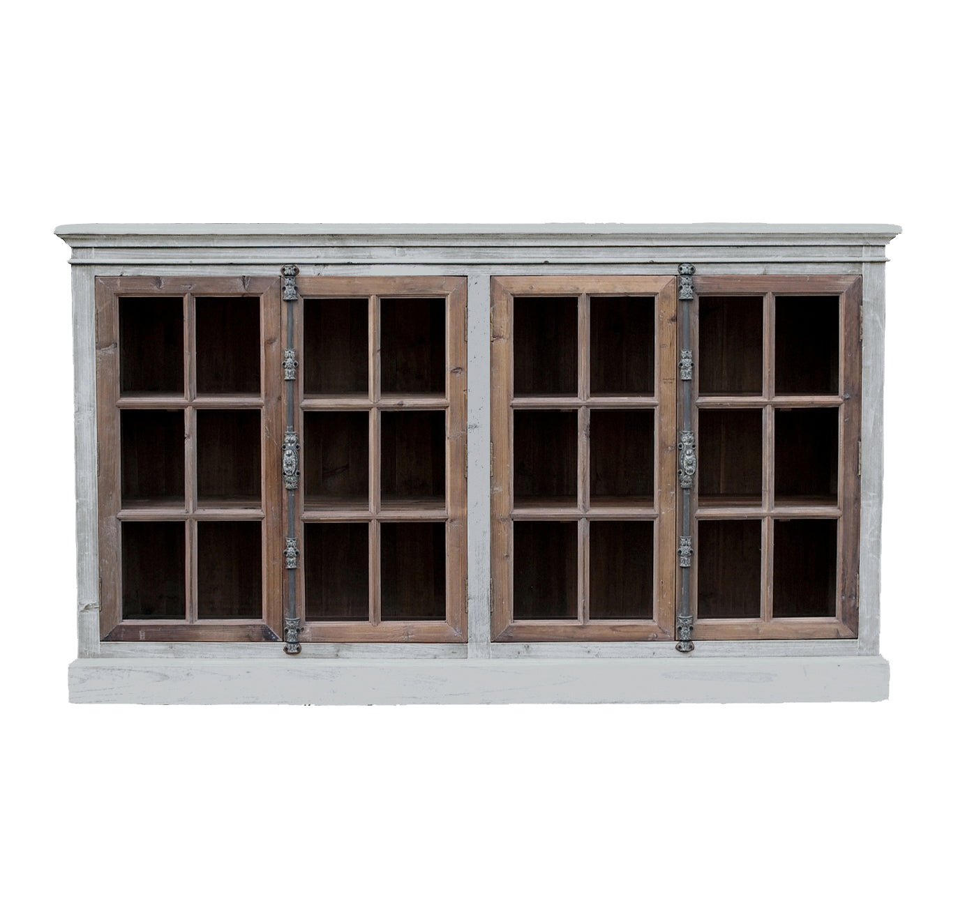 Sideboard made of reclaimed solid pine. Two pairs of doors with glass have French casement style iron hardware in a lightly distressed gray finish. One vertical support wall in the middle. Two non-adjustable shelves on each side are 36"W and 14"D. Will likely have nail holes, knots, and other imperfections, adding charm and character.