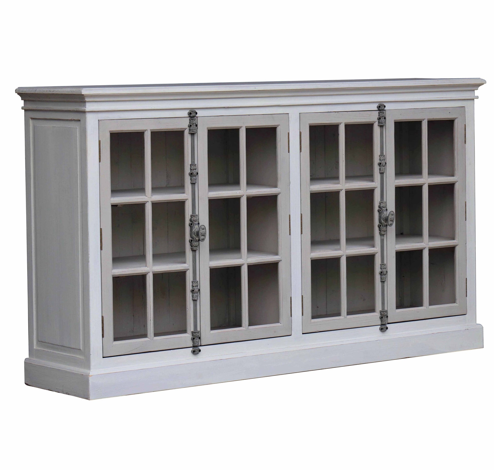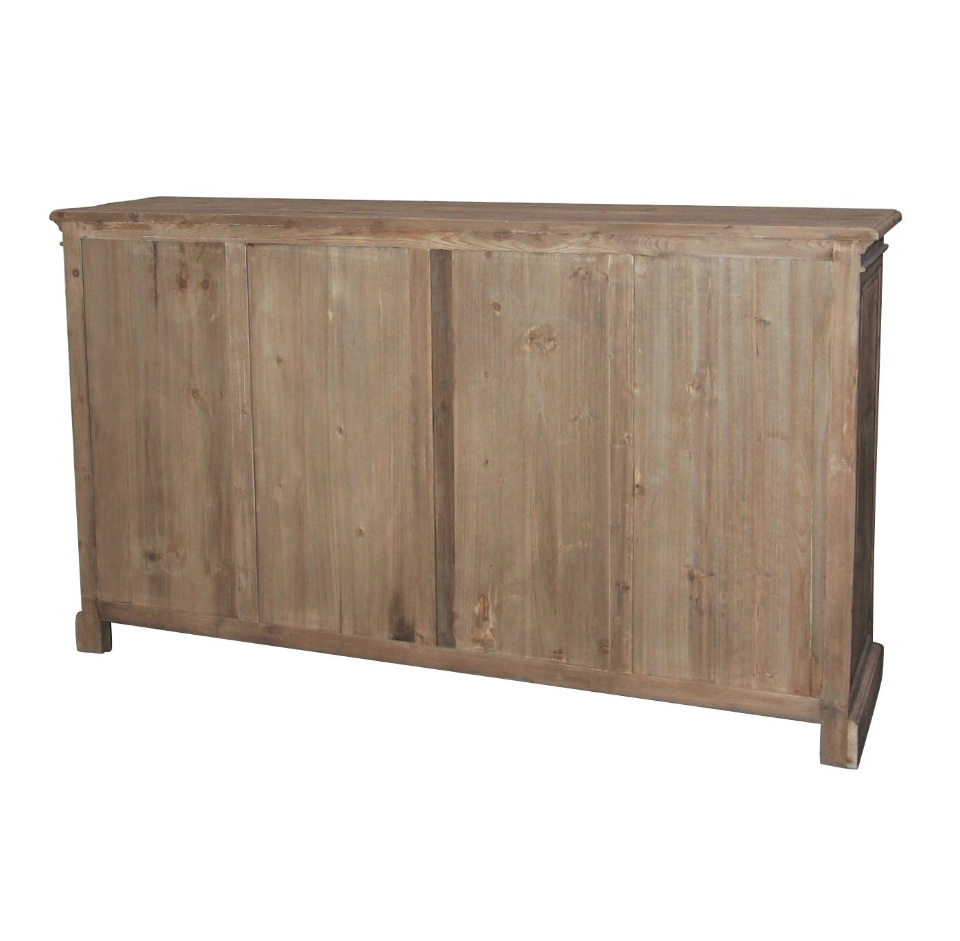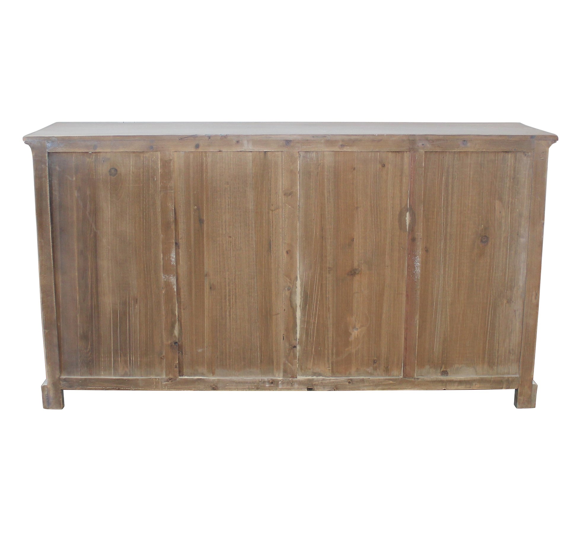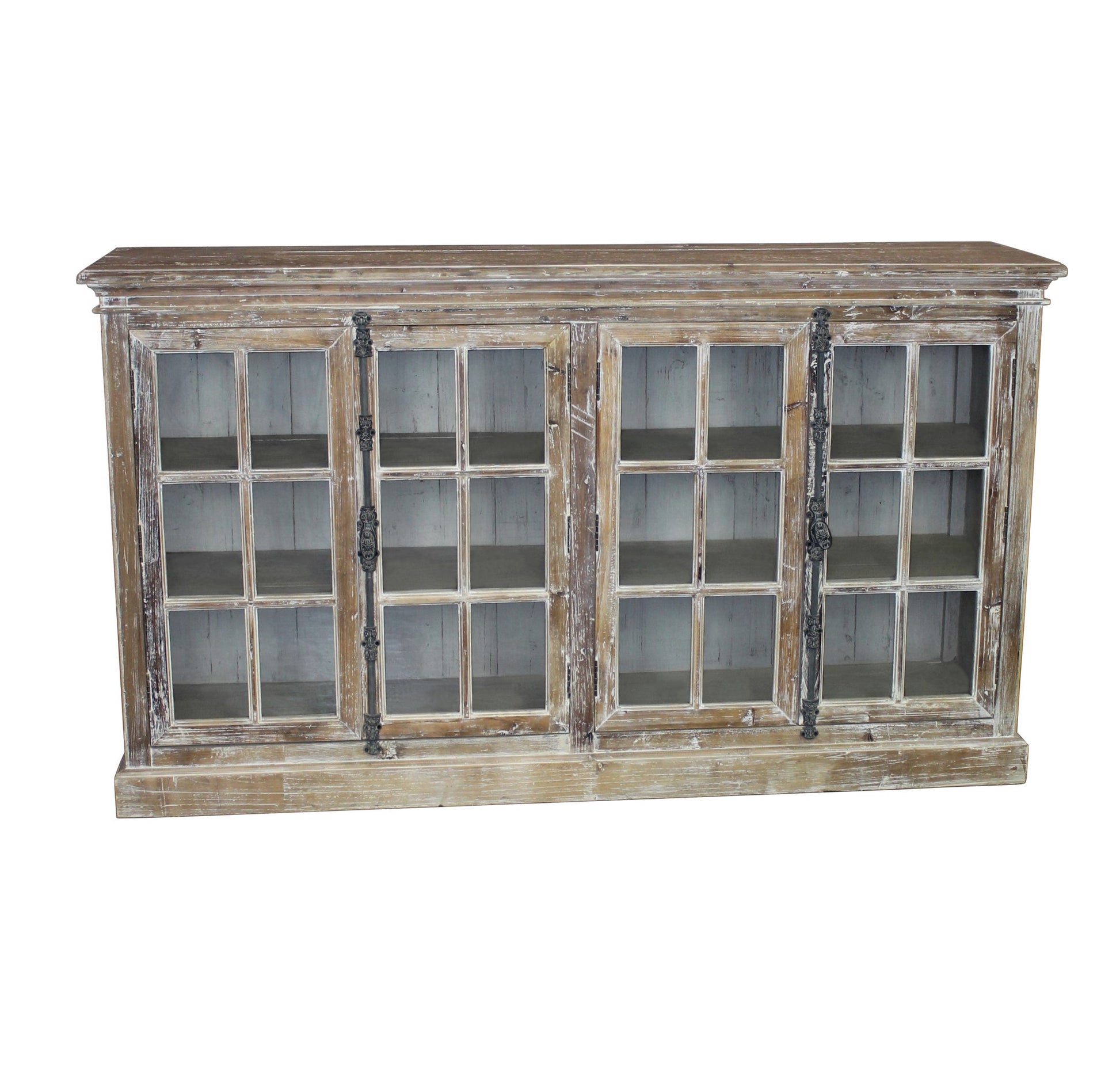 Sideboard made of reclaimed solid pine. Two pairs of doors with glass have French casement style iron hardware in a lightly distressed gray finish. One vertical support wall in the middle. Two non-adjustable shelves on each side are 36"W and 14"D. Will likely have nail holes, knots, and other imperfections, adding charm and character.