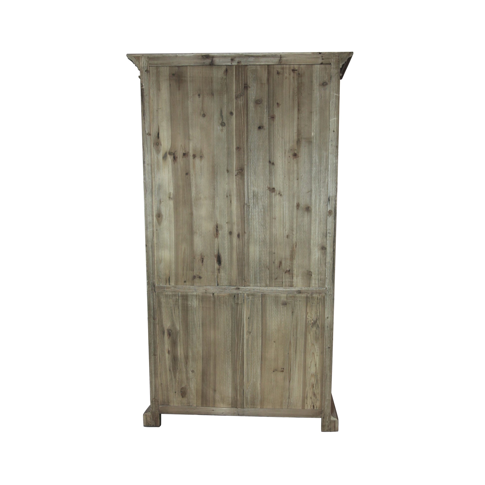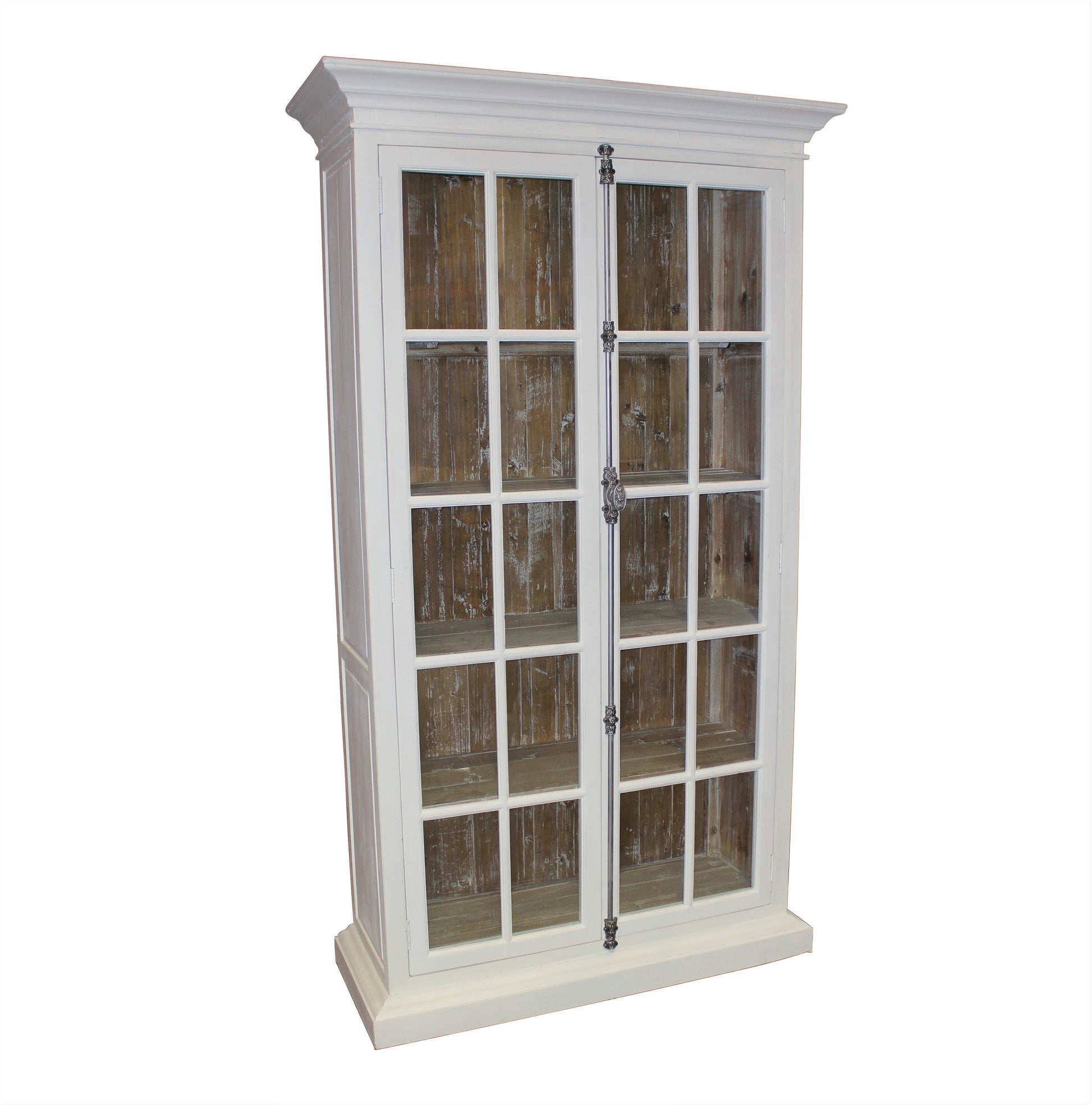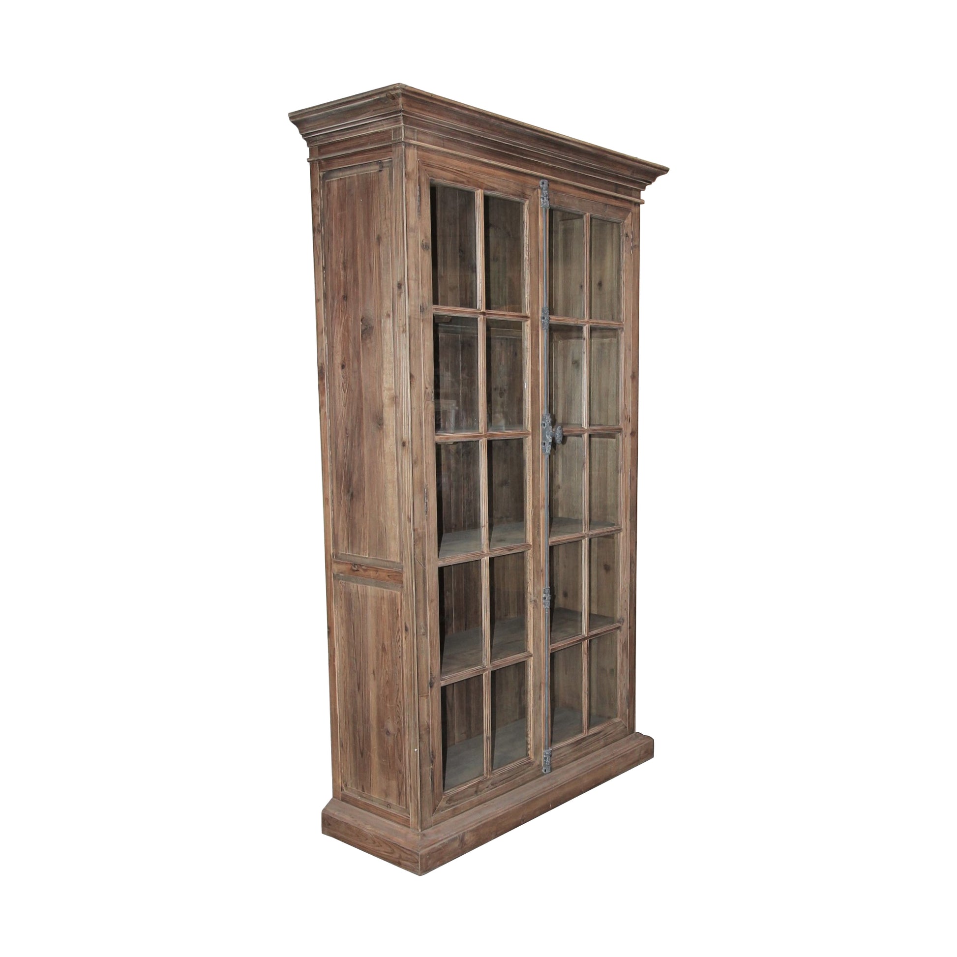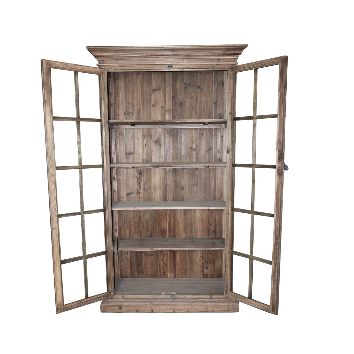Glass front cabinet made of solid reclaimed pine. Two hinged doors with glass and French casement style hardware in lightly distressed gray. Four non-adjustable shelves 41.25"W x 13" D with 13" between shelves. Will likely have nail holes, knots, and other imperfections, adding charm and character.