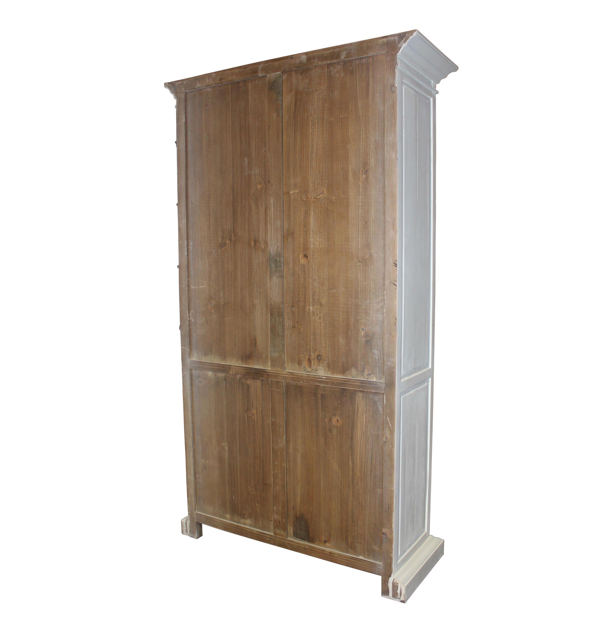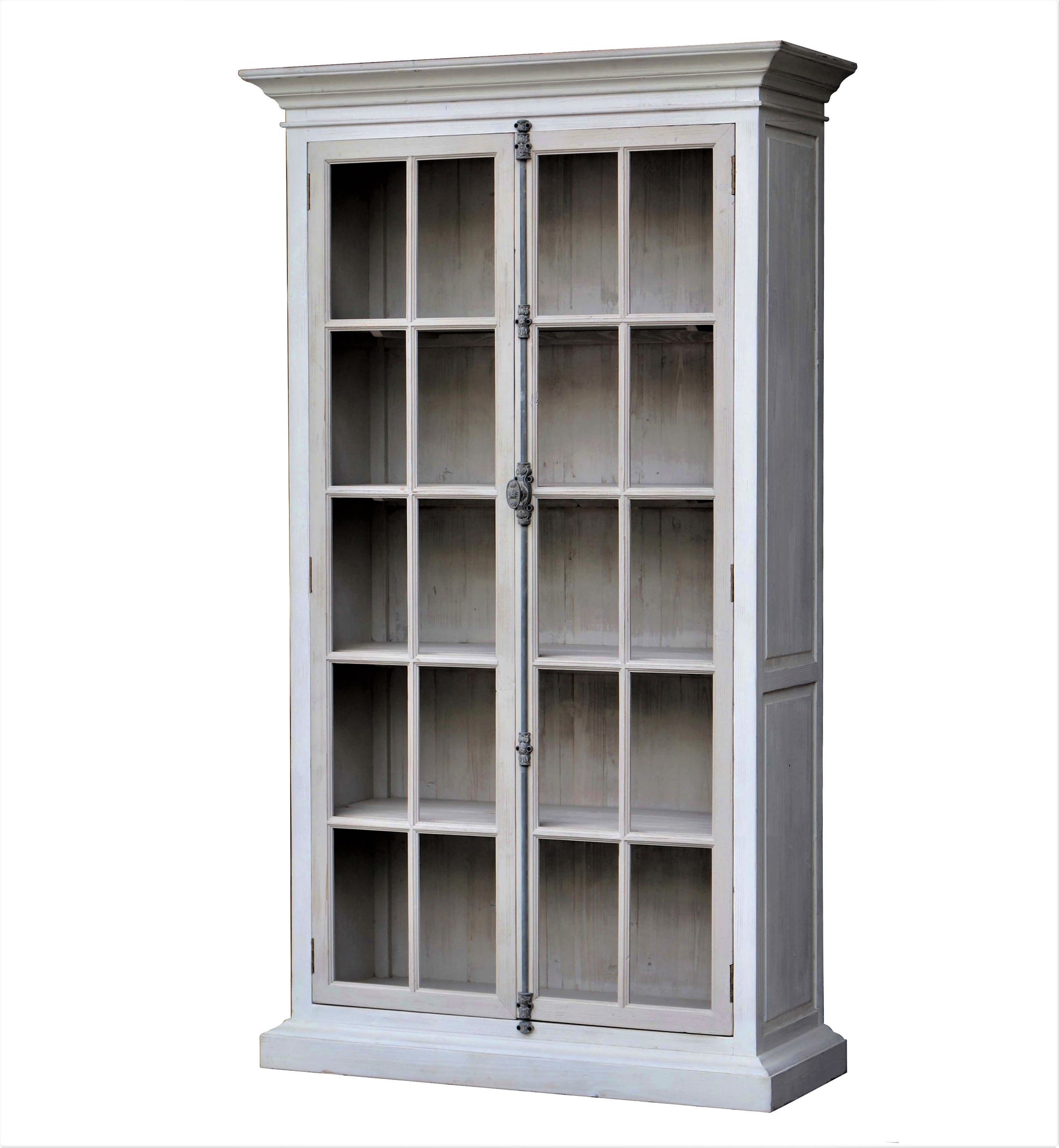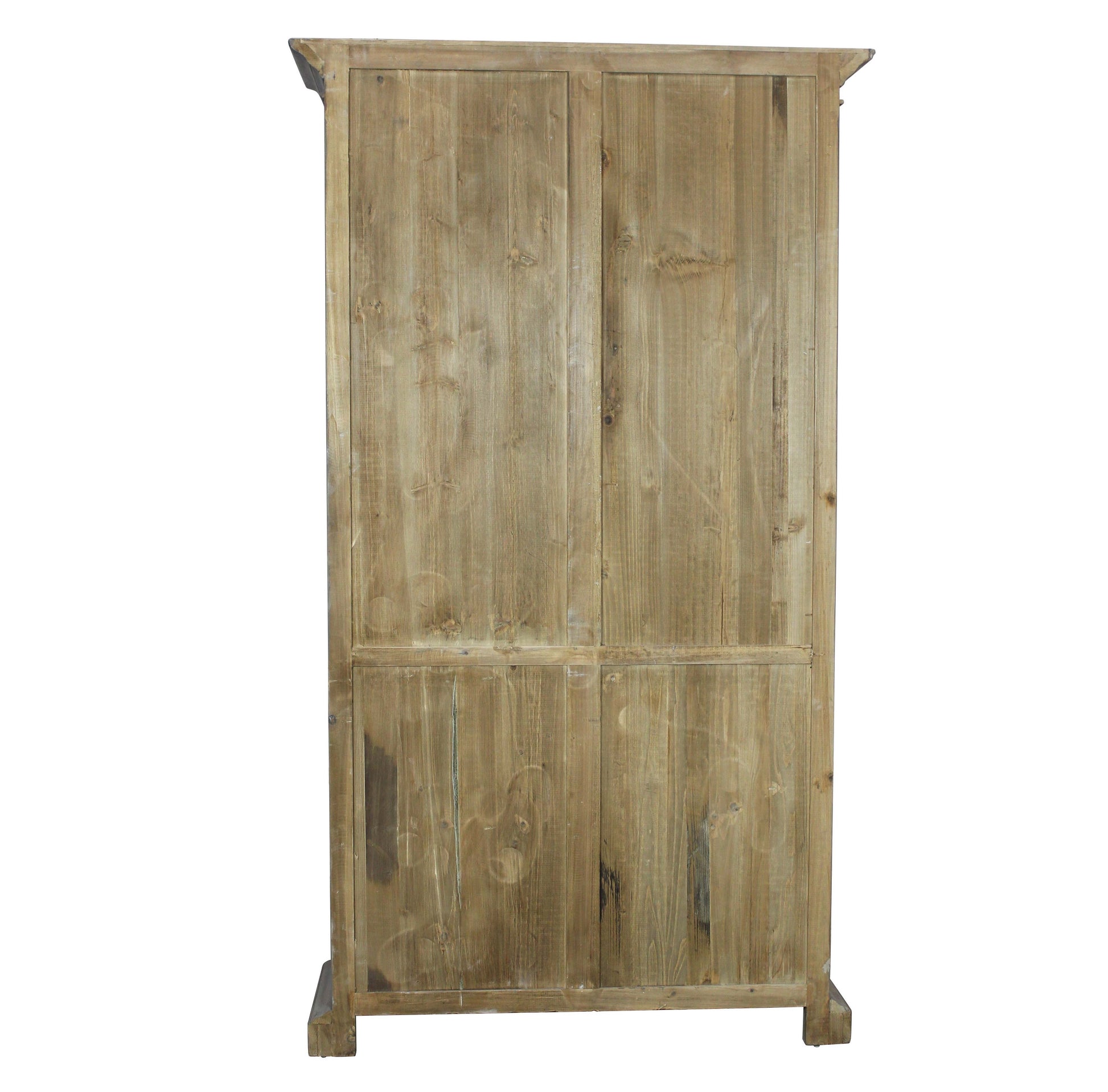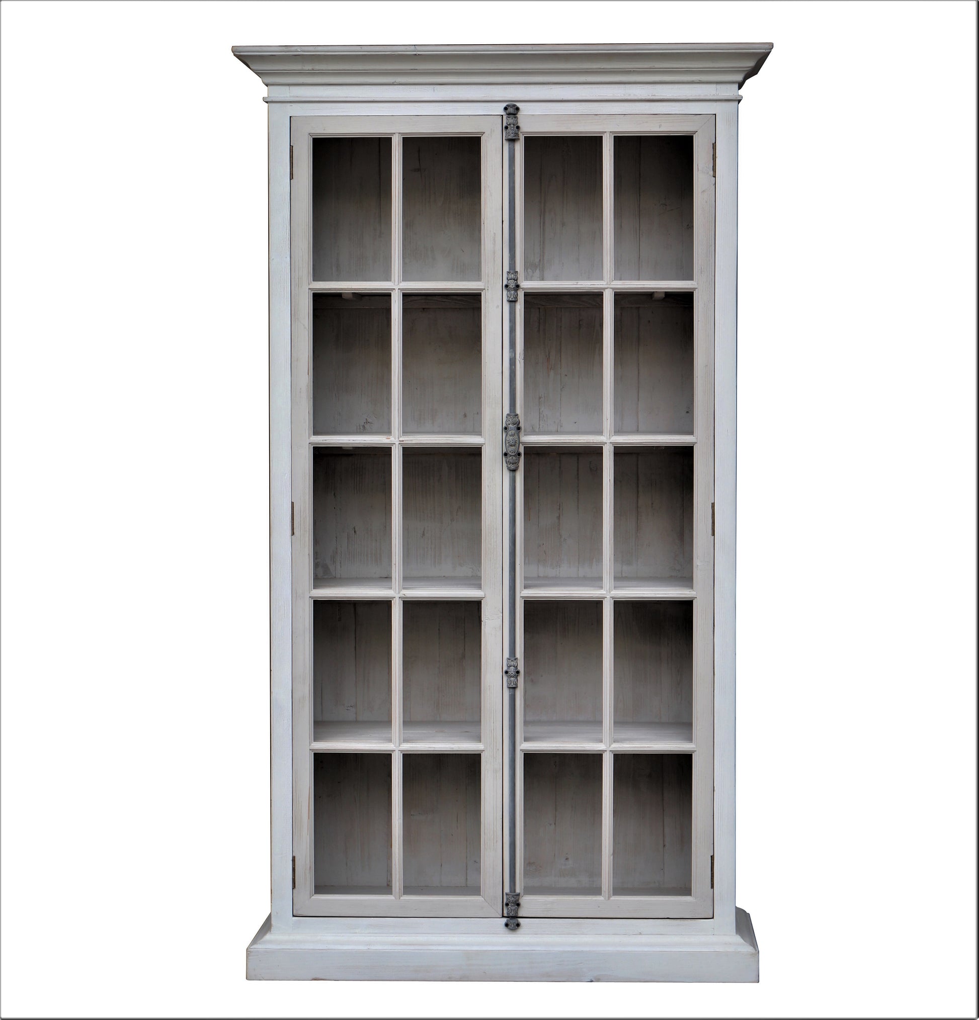 Glass front cabinet made of solid reclaimed pine. Two hinged doors with glass and French casement style hardware in lightly distressed gray. Four non-adjustable shelves 41.25"W x 13" D with 13" between shelves. Will likely have nail holes, knots, and other imperfections, adding charm and character.